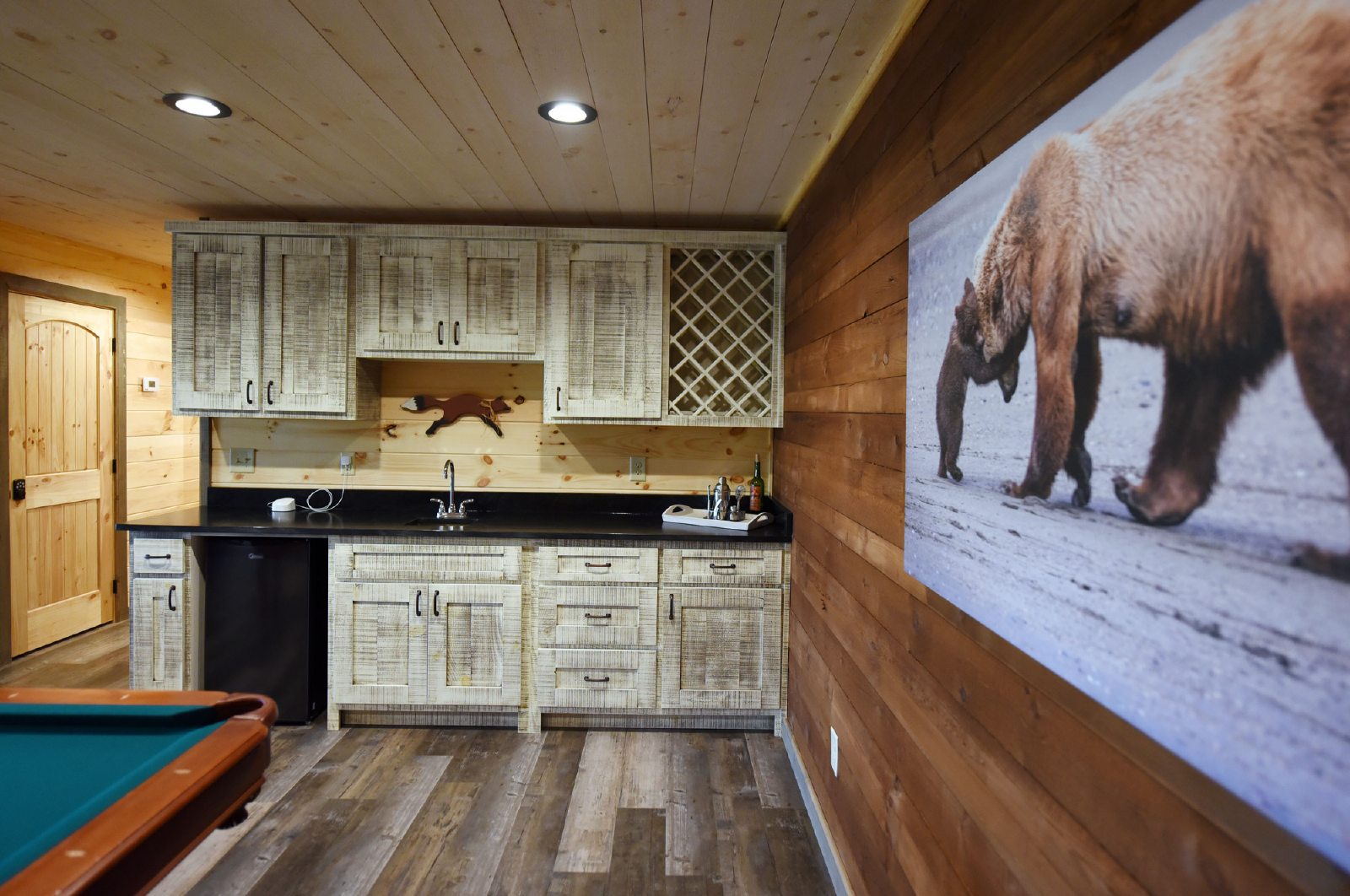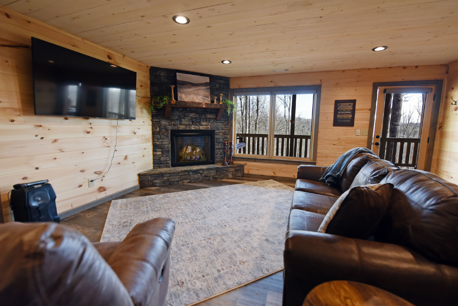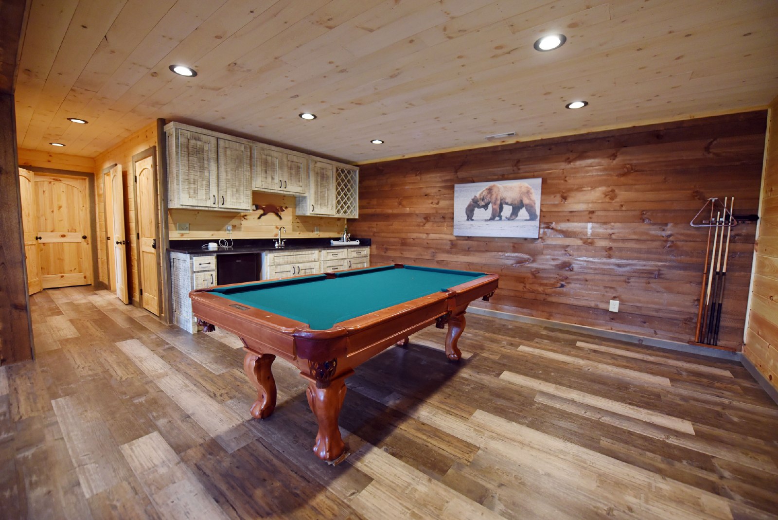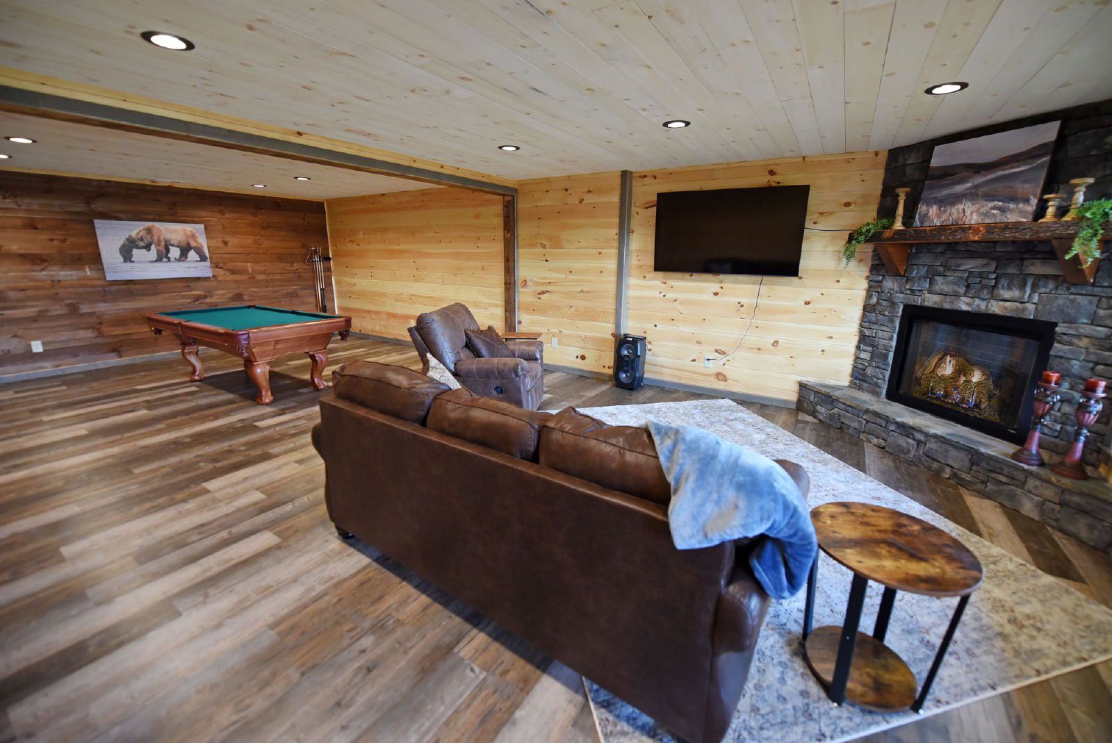 The downstairs offers a very spacious additional living area with a queen sofa bed, recliner, gas fireplace, gameroom with pool table, and bar area including a sink and mini fridge. The hot tub is accessible from the downstairs level and the porch is also gated.