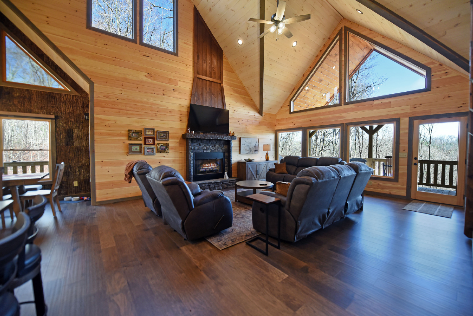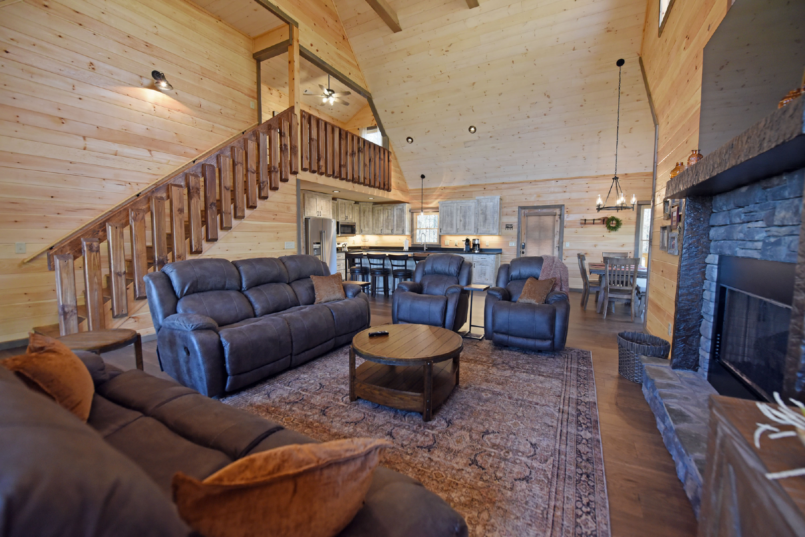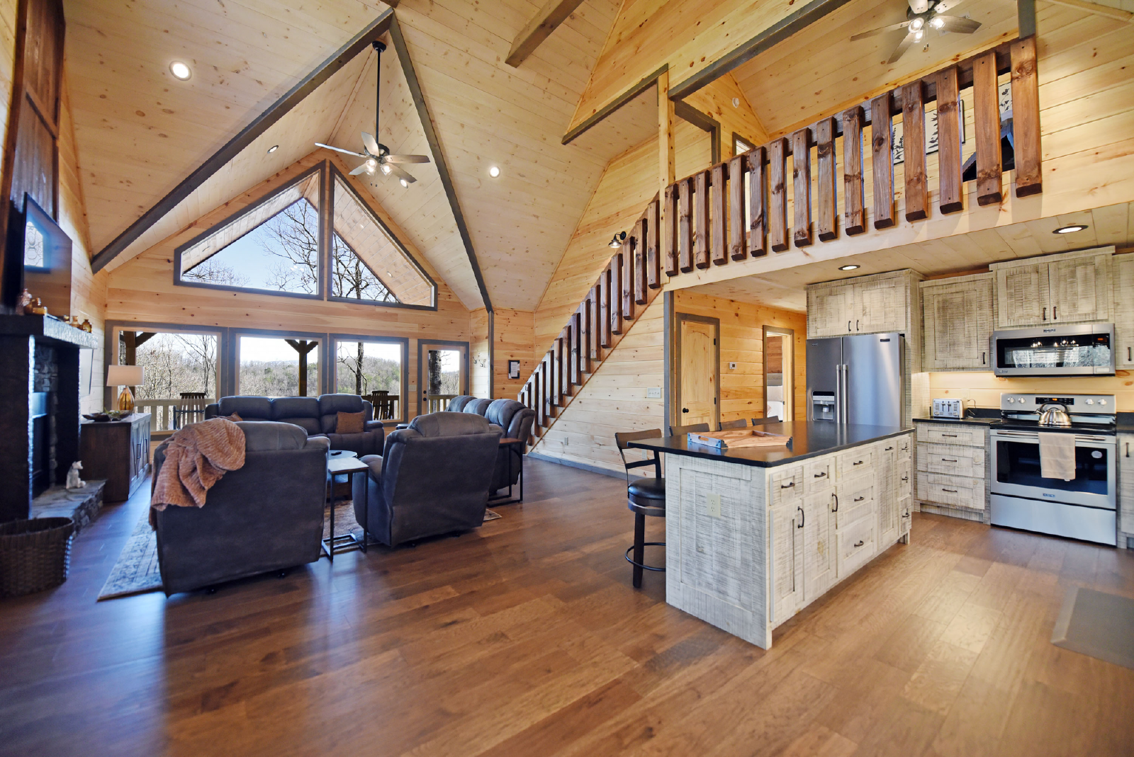 As you enter the cabin on the main level, you will immediately notice the excellent use of tri color woods, detailed accent walls, high vaulted ceiling, stone gas fireplace, large beautiful kitchen and dining area and the comfort calling from the large double reclining sofas and two reclining chairs. The large glass windows let in plenty of light and a great view of the luscious mountain background! In addition, the main level has a half bath and full washer/dryer.