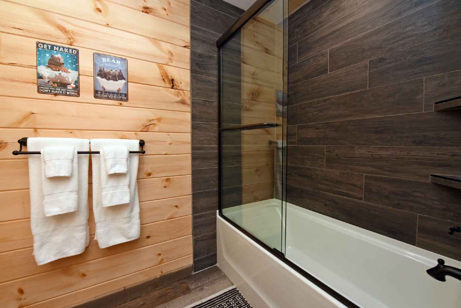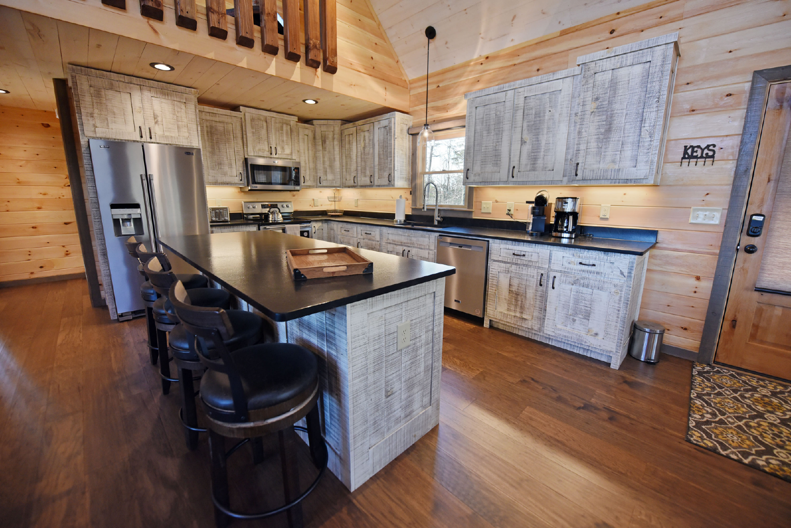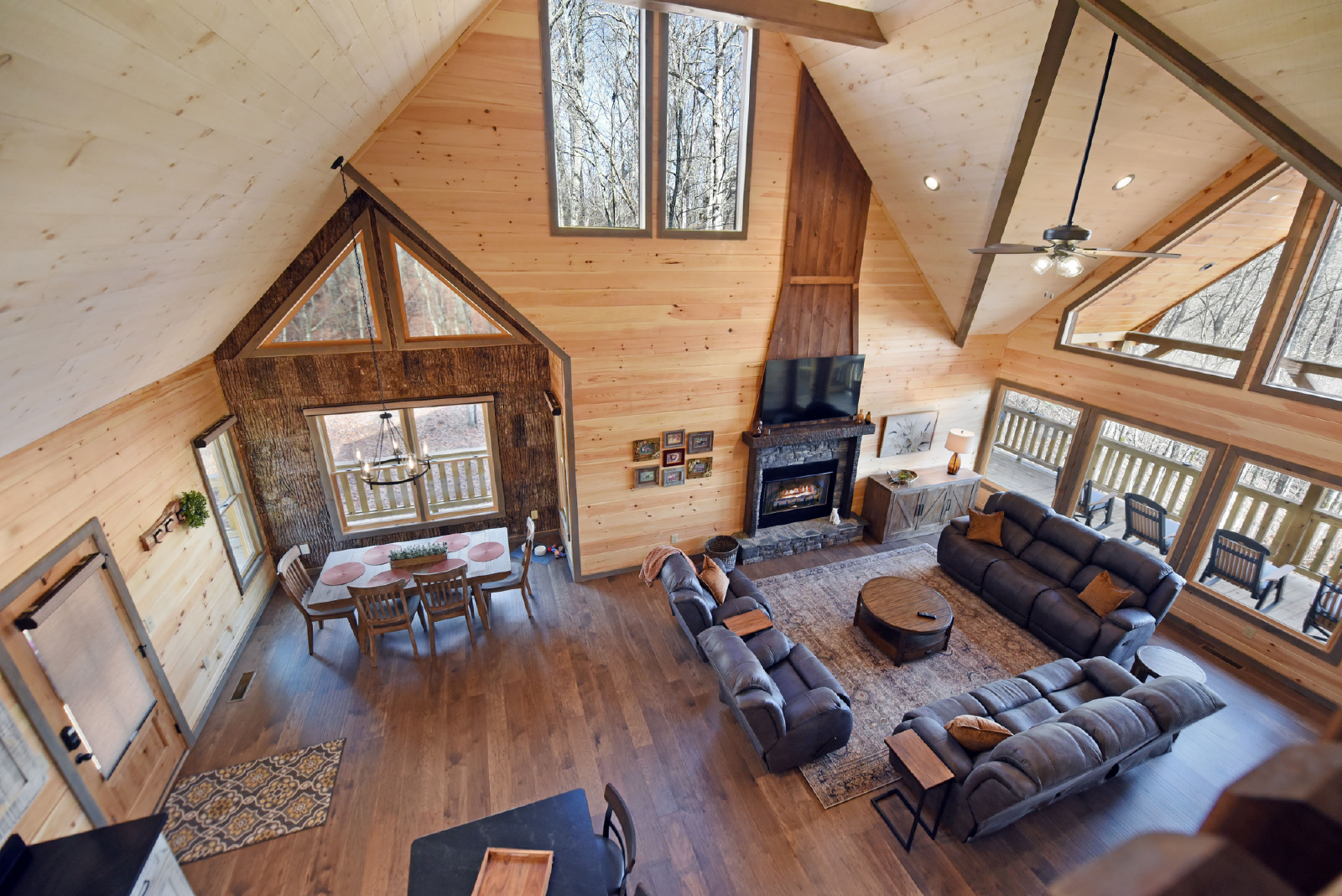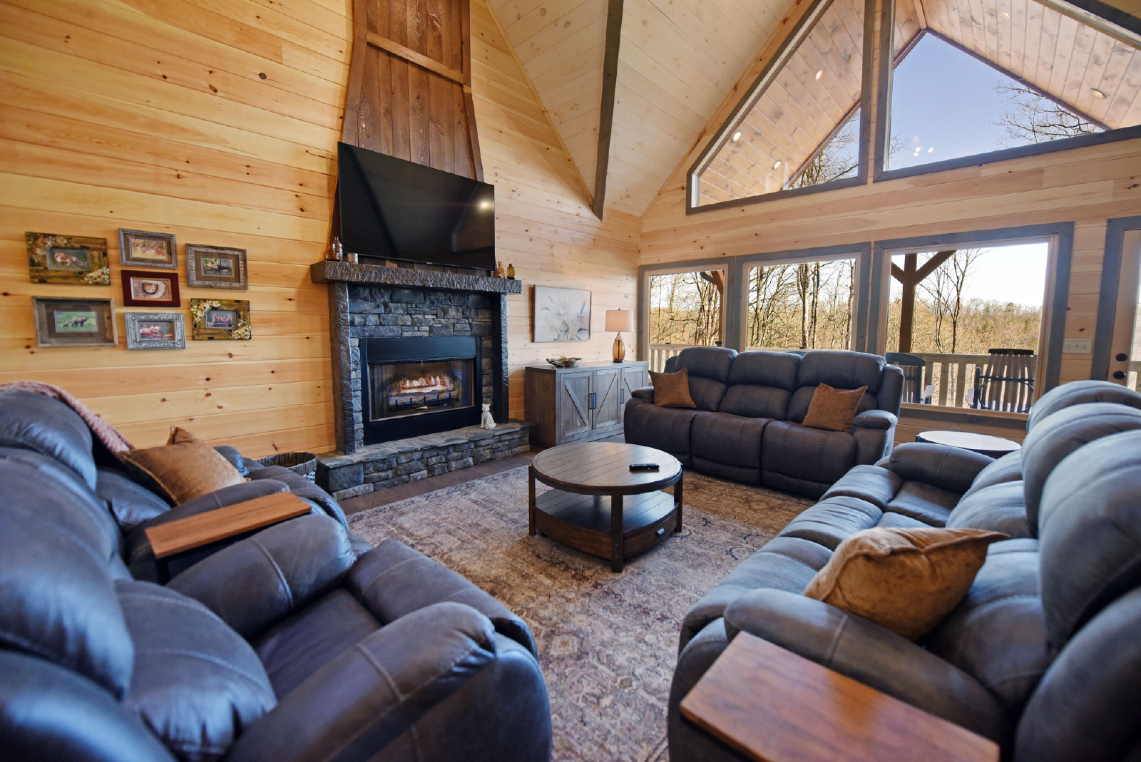 As you enter the cabin on the main level, you will immediately notice the excellent use of tri color woods, detailed accent walls, high vaulted ceiling, stone gas fireplace, large beautiful kitchen and dining area and the comfort calling from the large double reclining sofas and two reclining chairs. The large glass windows let in plenty of light and a great view of the luscious mountain background! In addition, the main level has a half bath and full washer/dryer.