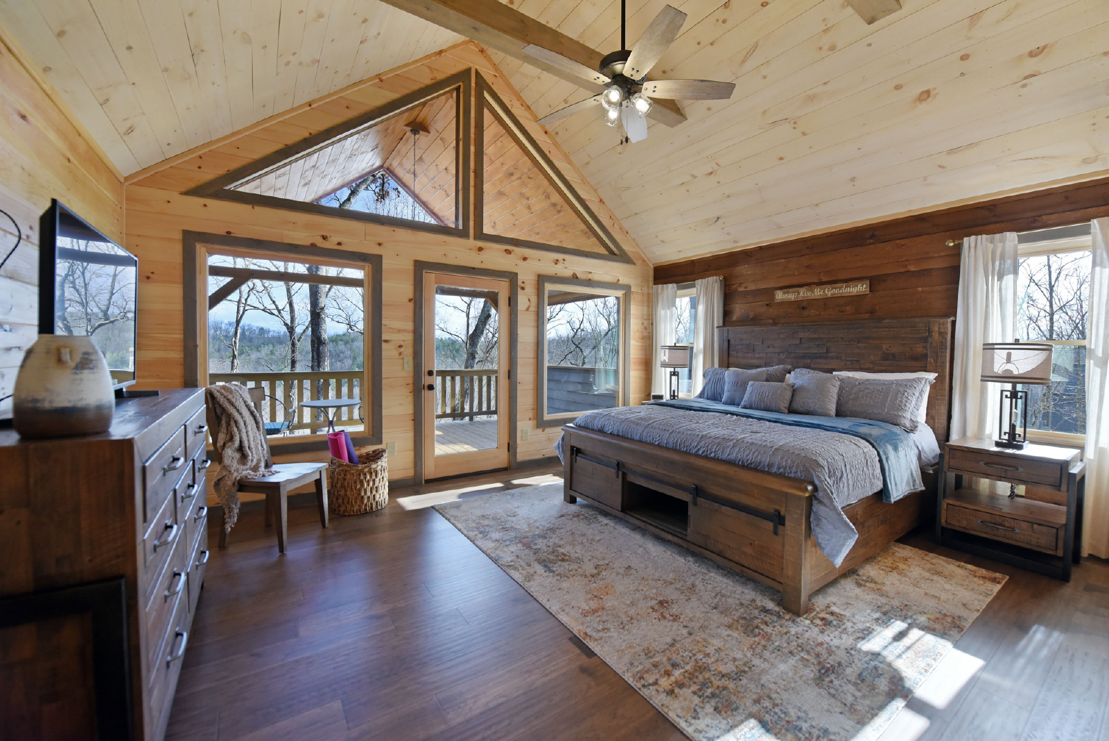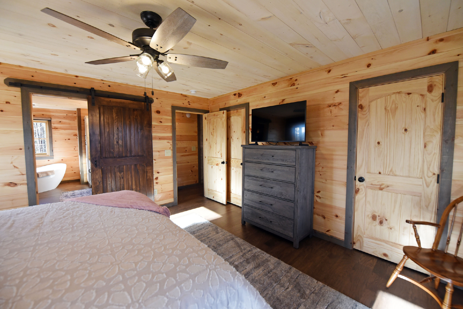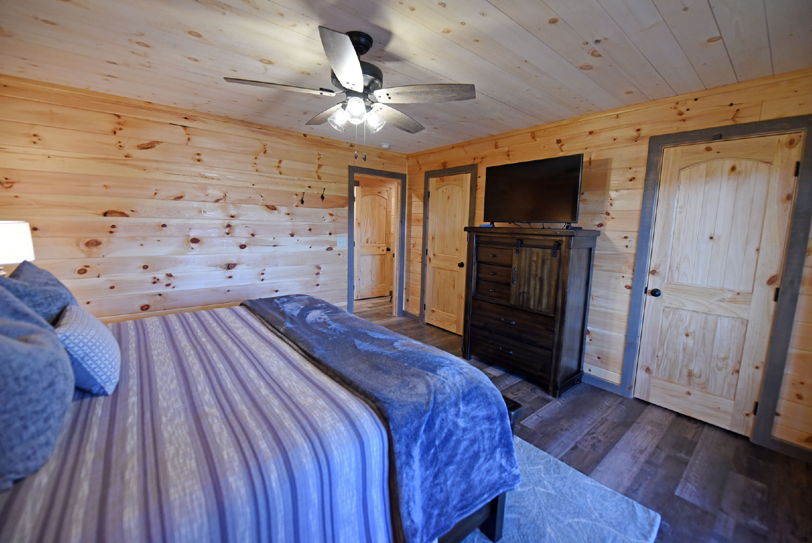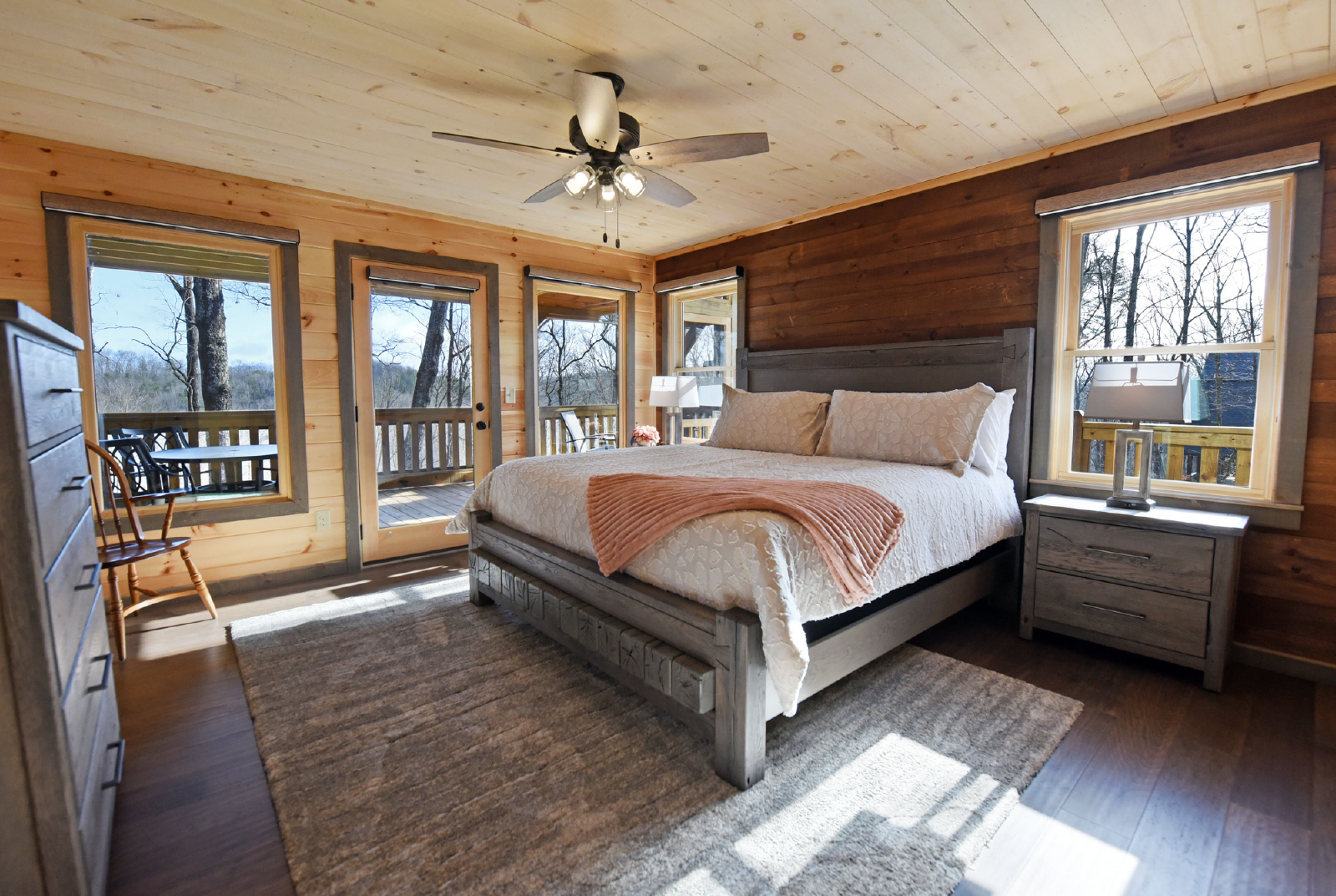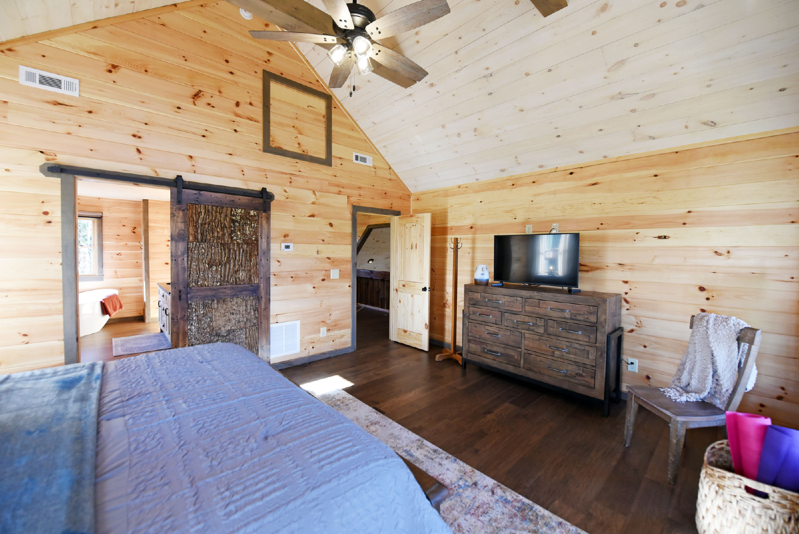 The downstairs level has a king bed, walk-in closet, with access to a full bathroom with shower, and a single vanity sink. The crown of this room is it has direct access to the hot tub on the downstairs porch.