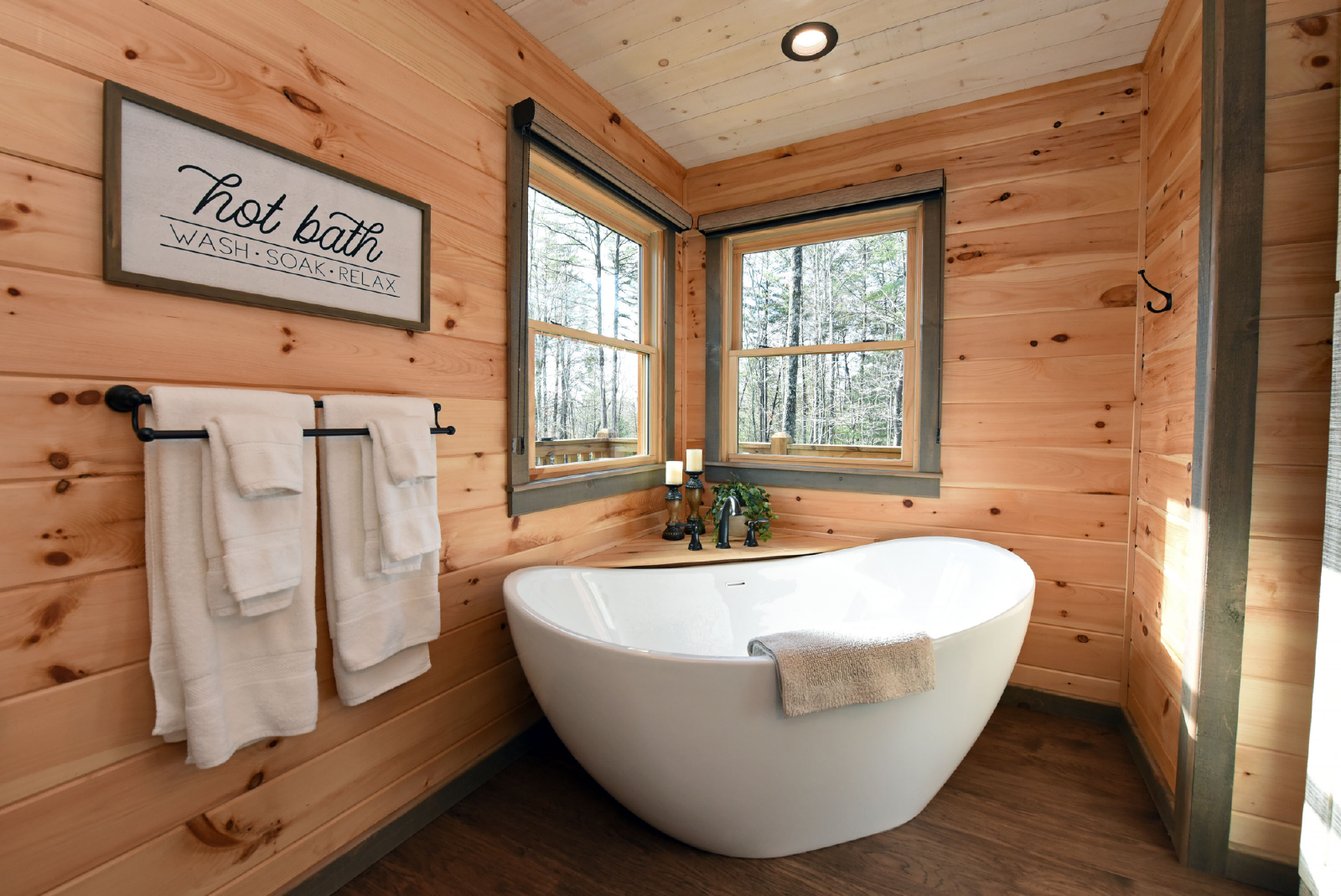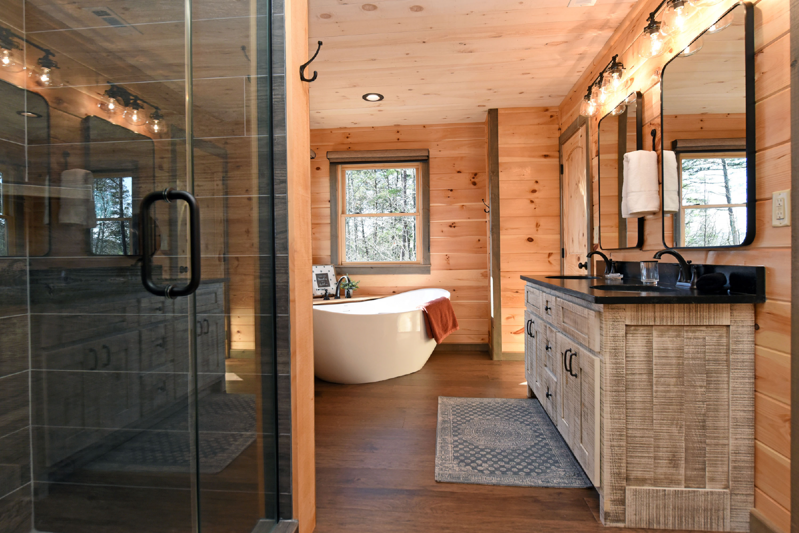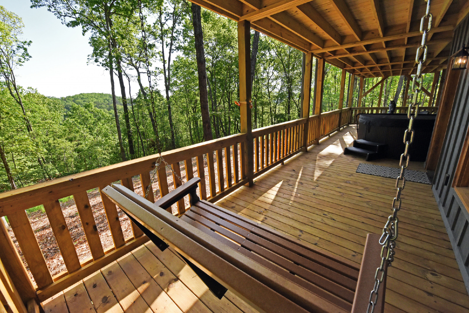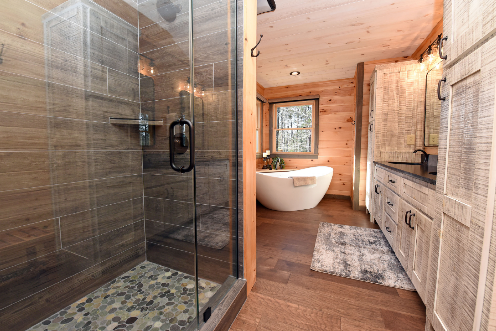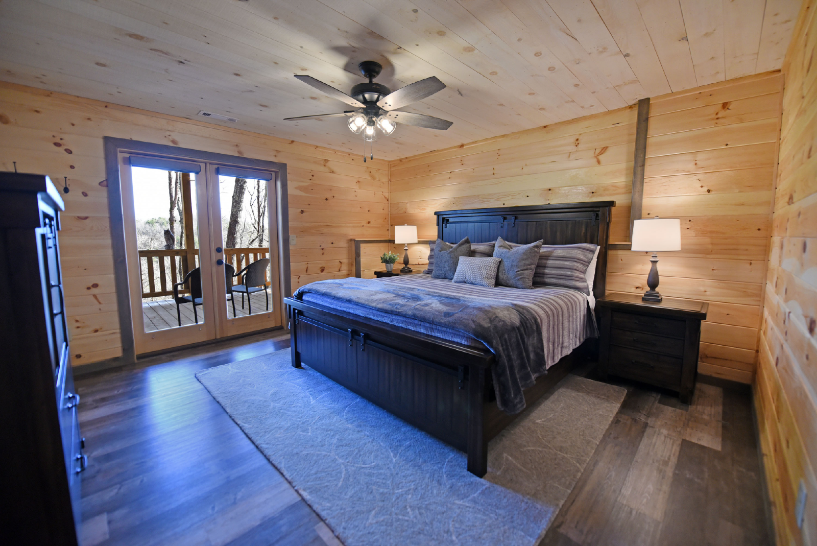 The downstairs level has a king bed, walk-in closet, with access to a full bathroom with shower, and a single vanity sink. The crown of this room is it has direct access to the hot tub on the downstairs porch.