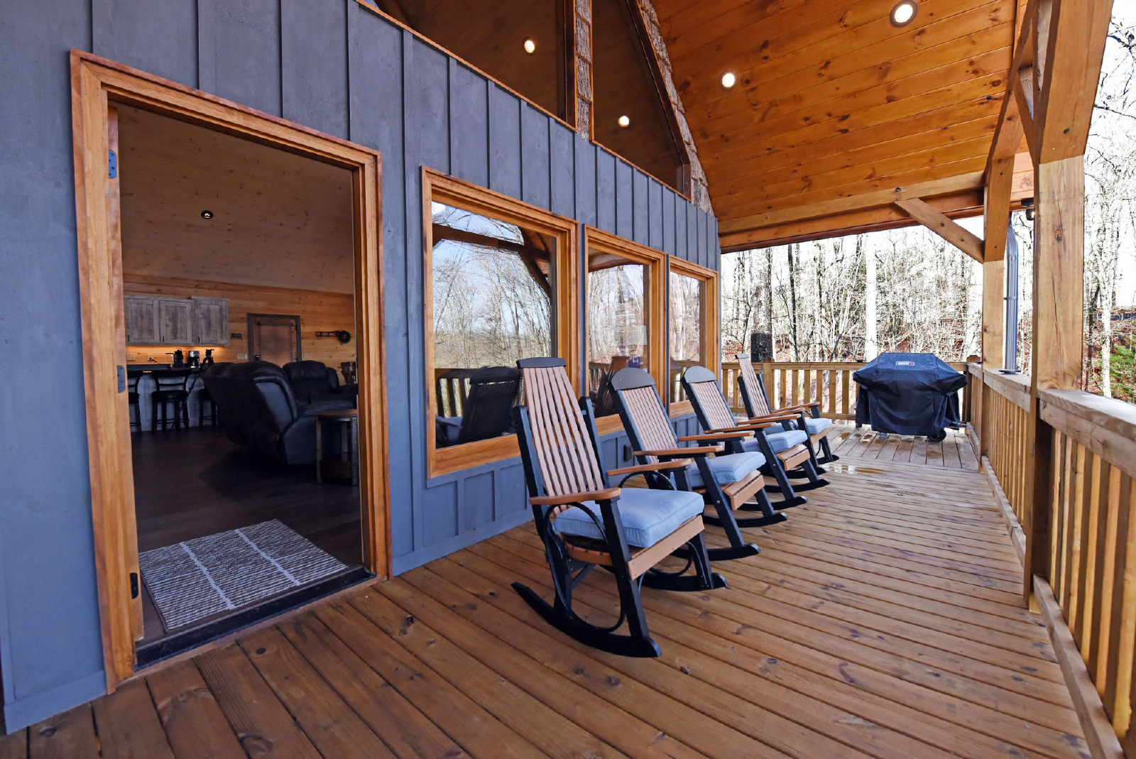 This picturesque property will not disappoint! With beautiful mountain views and calming sounds of the Toccoa River, it is minutes from downtown Blue Ridge. The convenience is rewarding and the space is amazing. Comfort is at every turn, with large recliner sofas, cozy king bedrooms, a spacious kitchen, wrap-around porches, a screened porch with wood burning fireplace, two indoor gas fireplaces, a swing, rocking chairs, a hot tub and two large living areas with 65” smart TV’s. Added bonus - gated porch for pets!
