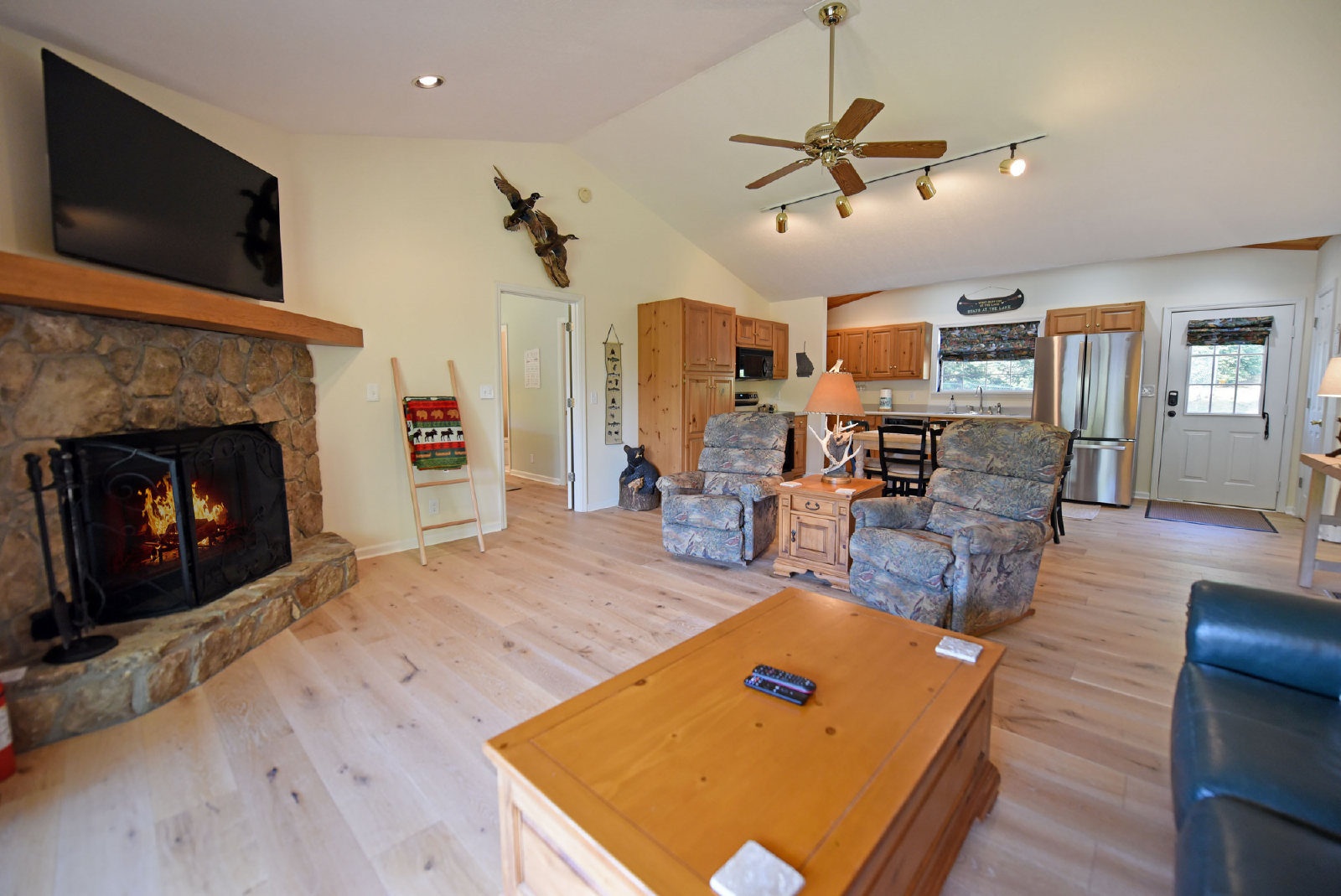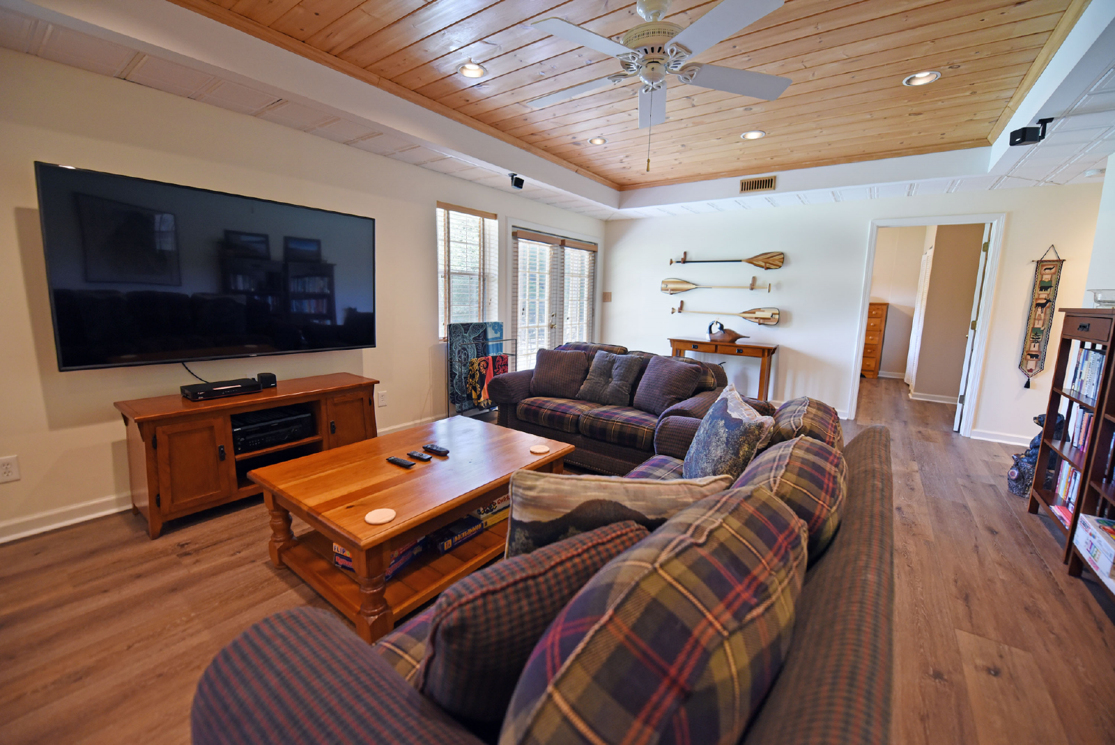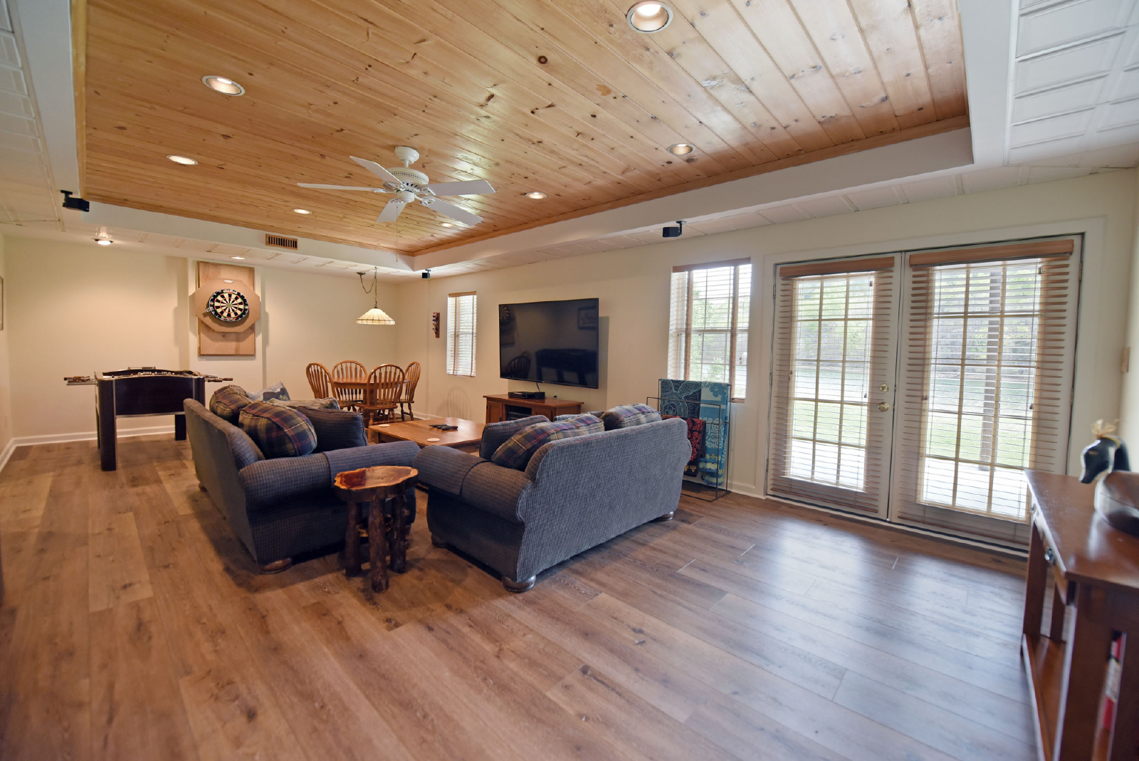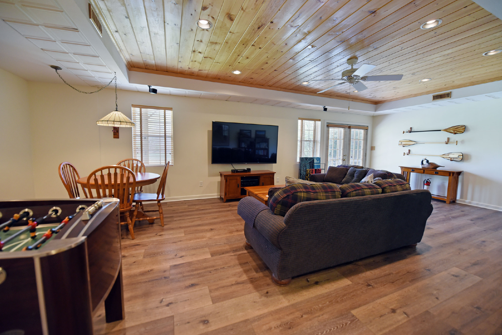 The downstairs level includes a large living area, foosball table, card table and 65” large screen TV for movie night! It has a king bedroom, twin bunk bed room, full size bathroom, extra refrigerator and full size washer/dryer.