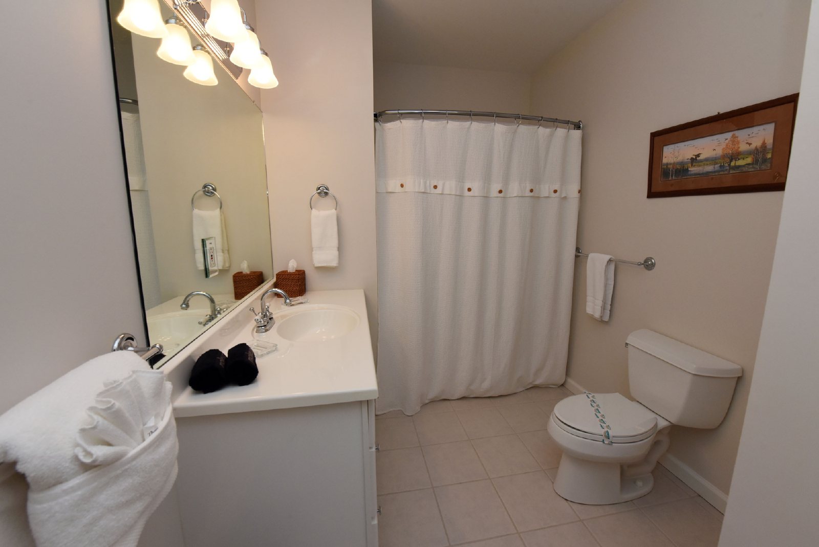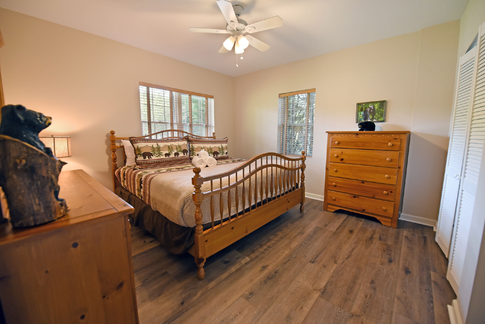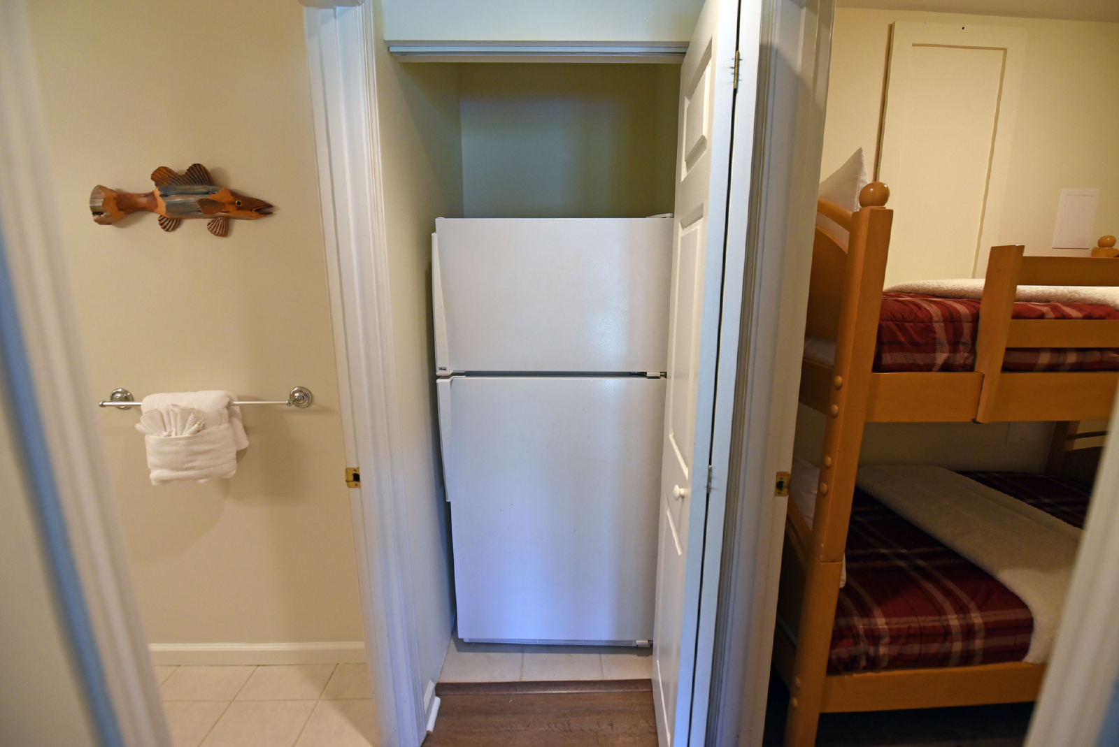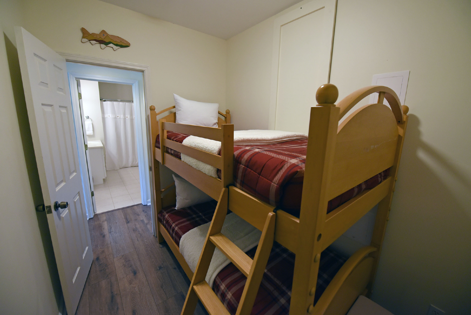 The downstairs level includes a large living area, foosball table, card table and 65” large screen TV for movie night! It has a king bedroom, twin bunk bed room, full size bathroom, extra refrigerator and full size washer/dryer.