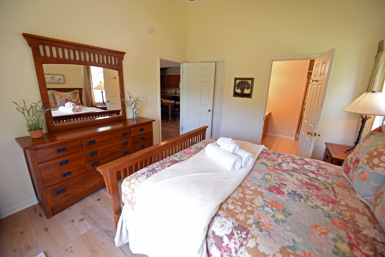The main level has a split bedroom style with one to the right and left. The bedroom to the right is a king master suite and the one to the left is a queen master suite.