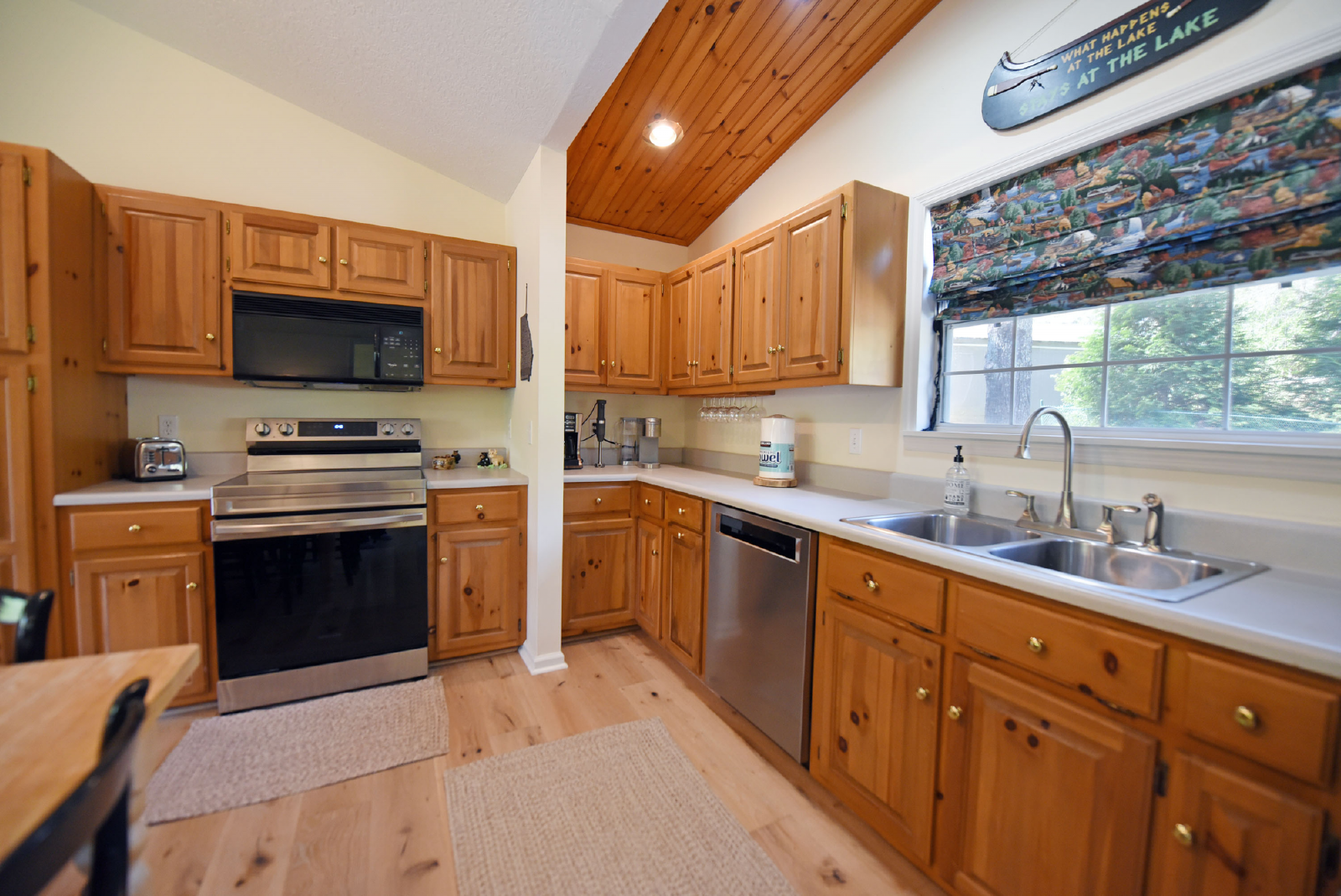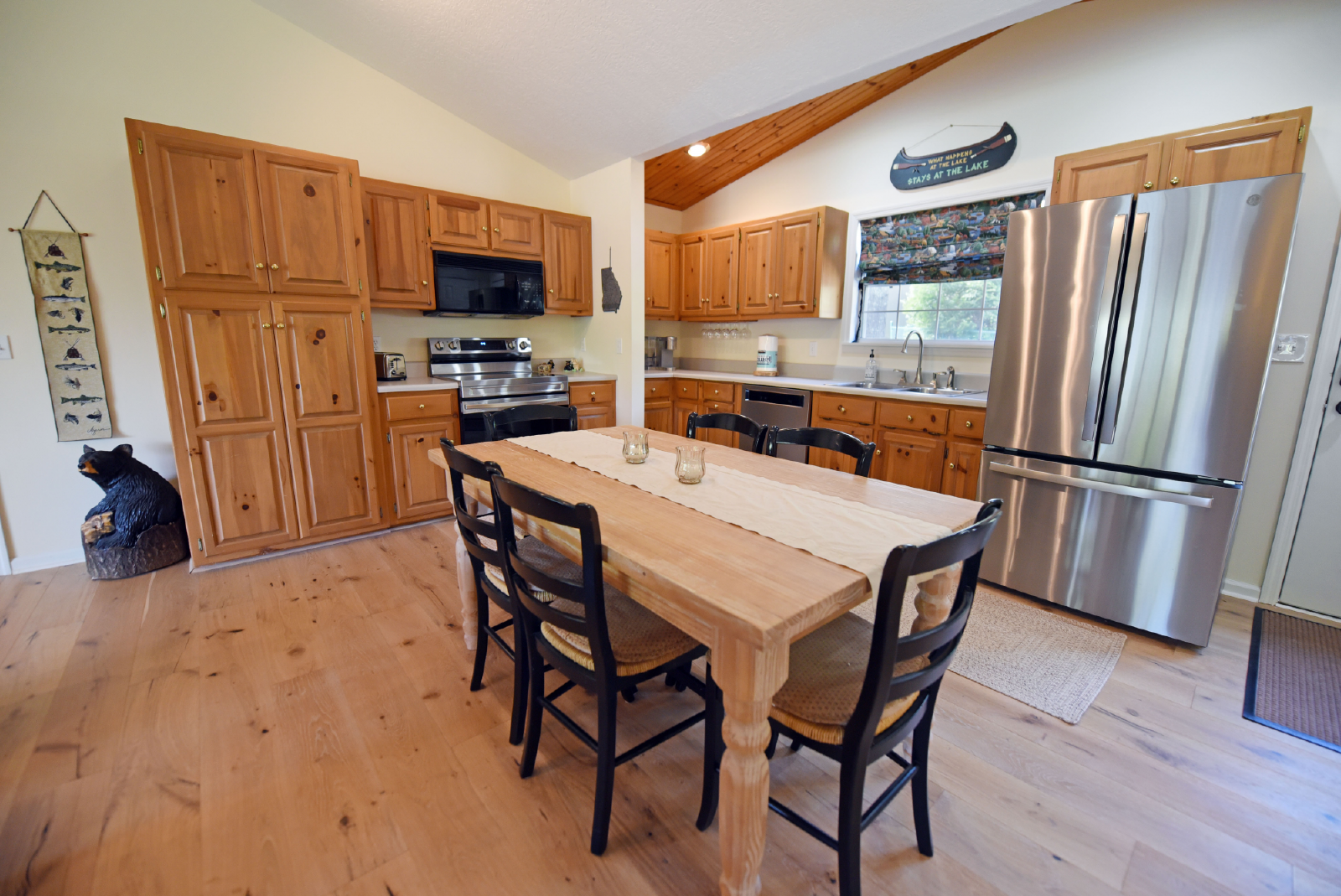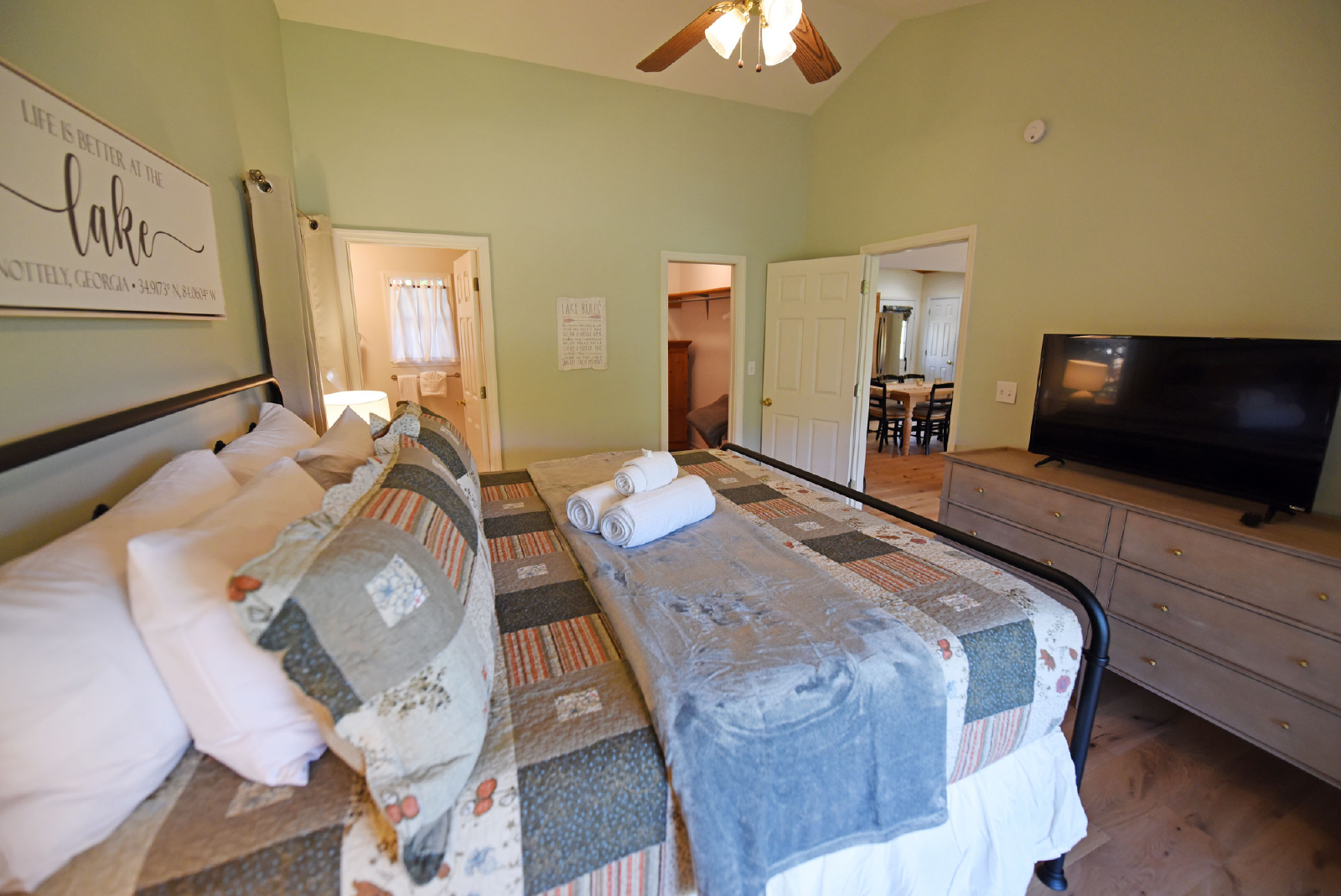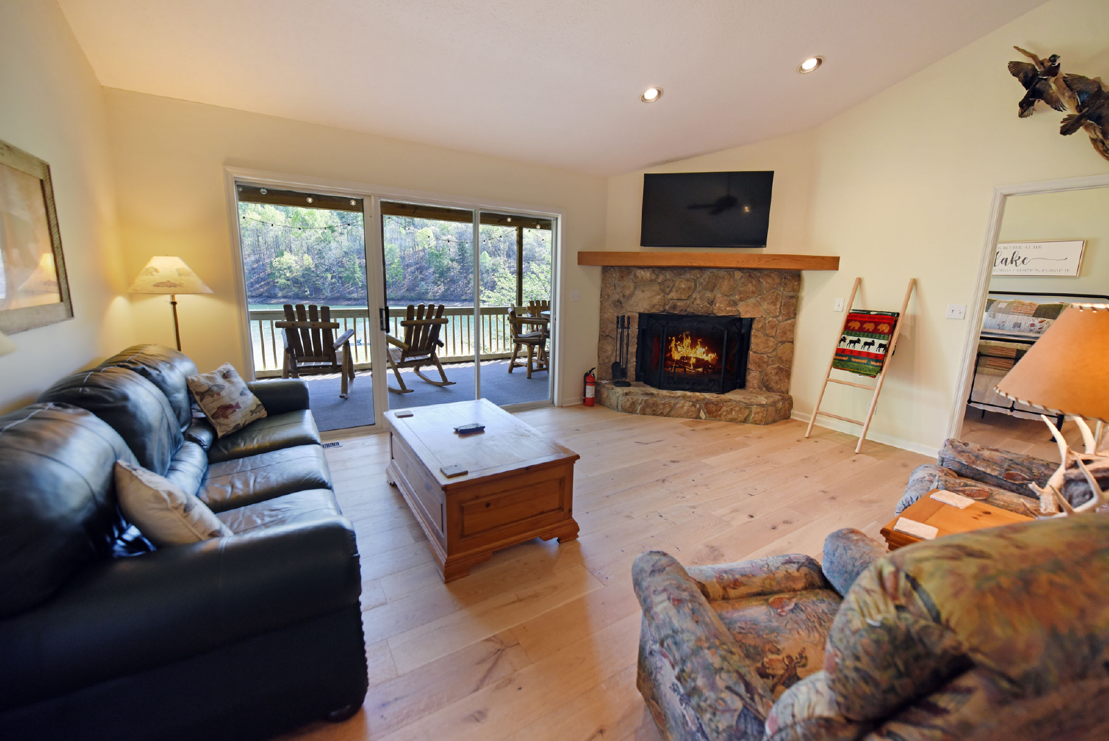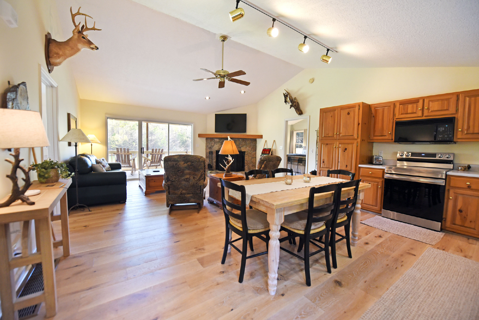 Upon entering the home, you will absorb the amazing lakefront and mountain views. The space is bright and open featuring a nice size living area, dining table for 8 and fully appointed kitchen.