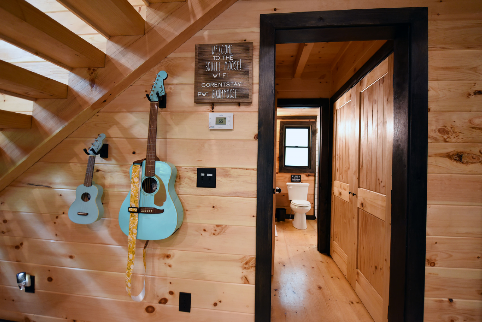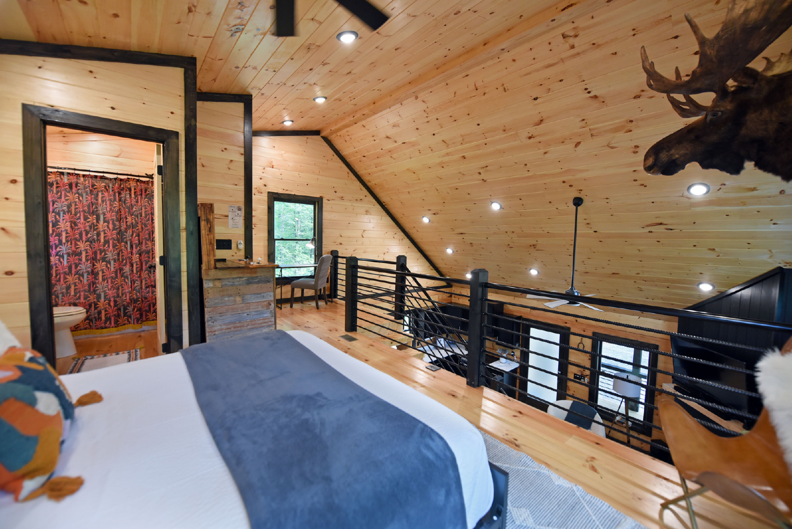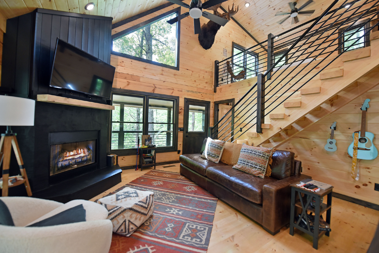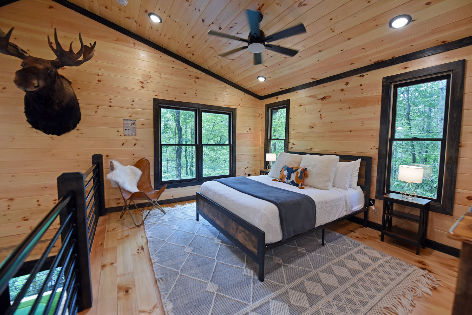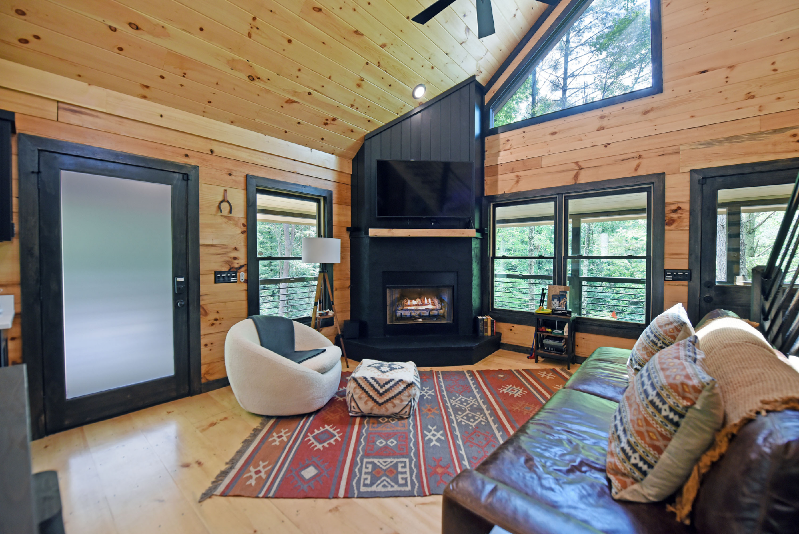 Arriving you will notice the modern style of this cozy, quiet retreat! You will enter the cabin into a spacious open vaulted living area. Be sure to glance up to your left and say hi to “Burt” the Boujee Moose mascot!