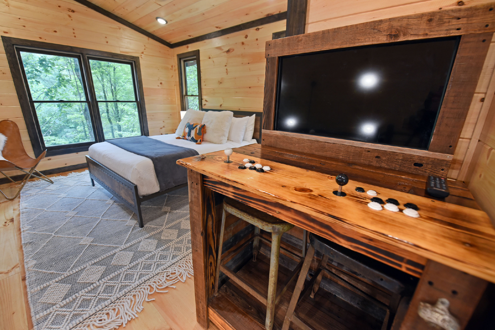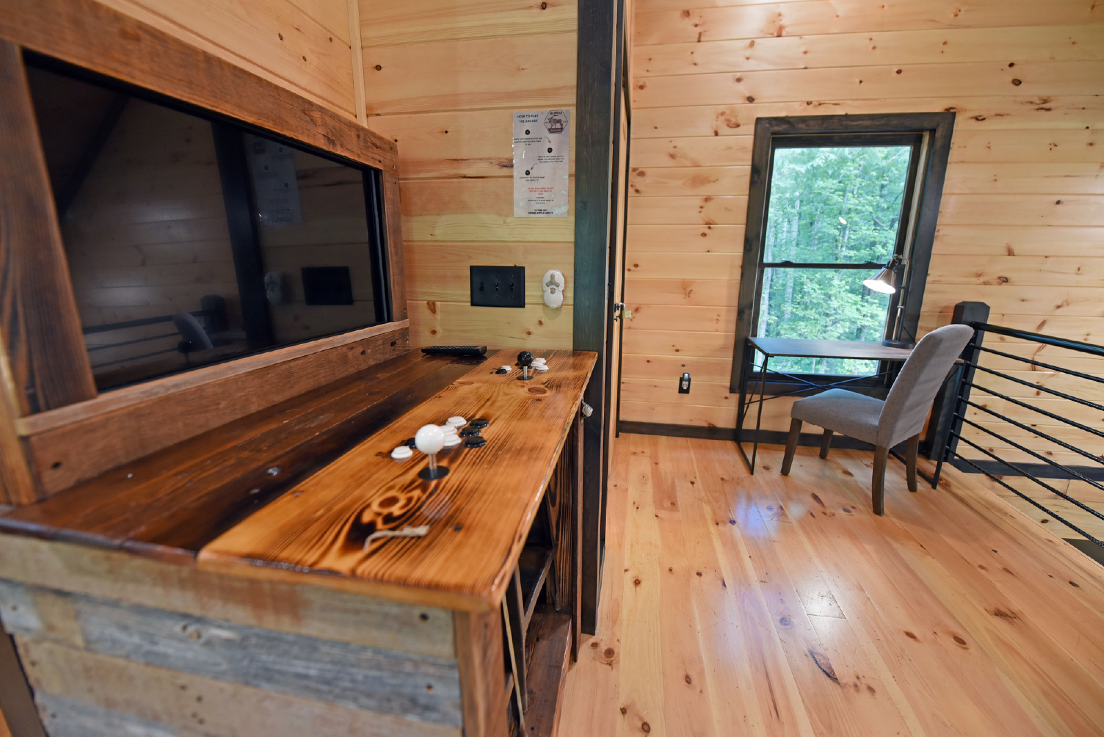 Upstairs is the second queen bedroom, in an open loft area, with a private bath and features the same luxury mattress and linens. There is a desk to keep in touch with work/home and also a great custom entertainment system, designed by the owner, with over 300 games. It is a fun way to have some friendly fun with that special person or see just how good your kids really are!