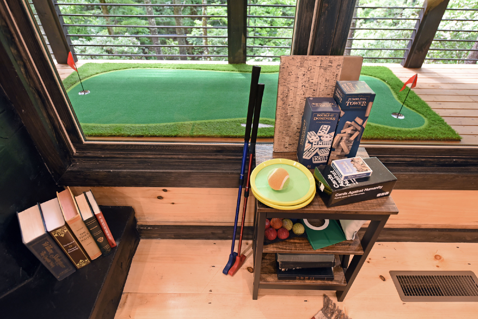 The living area features high end furnishings, including a restoration hardware sofa, large 55” flat screen smart TV with sound system, fireplace, yoga mats and everything needed to enjoy the outside putting green.