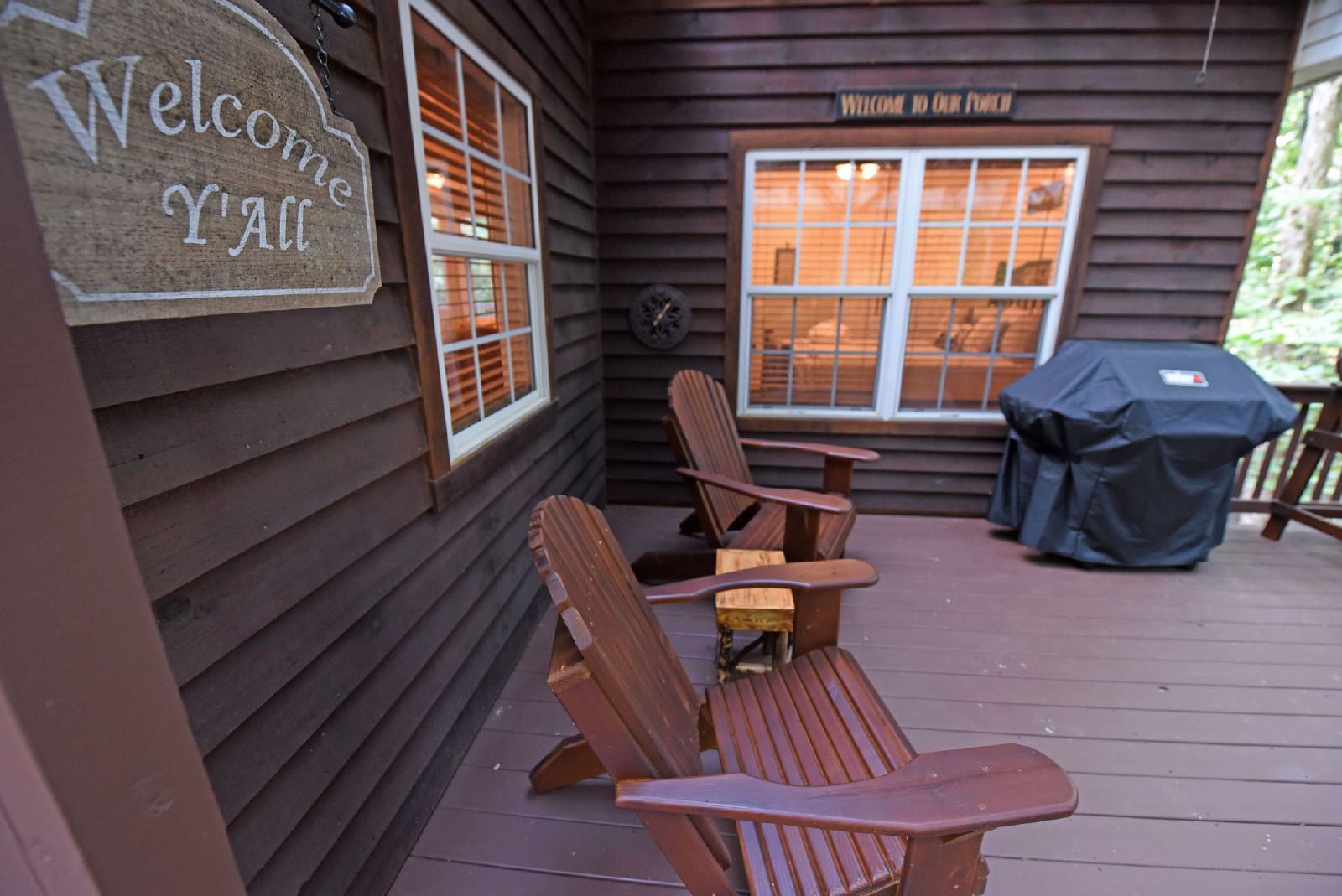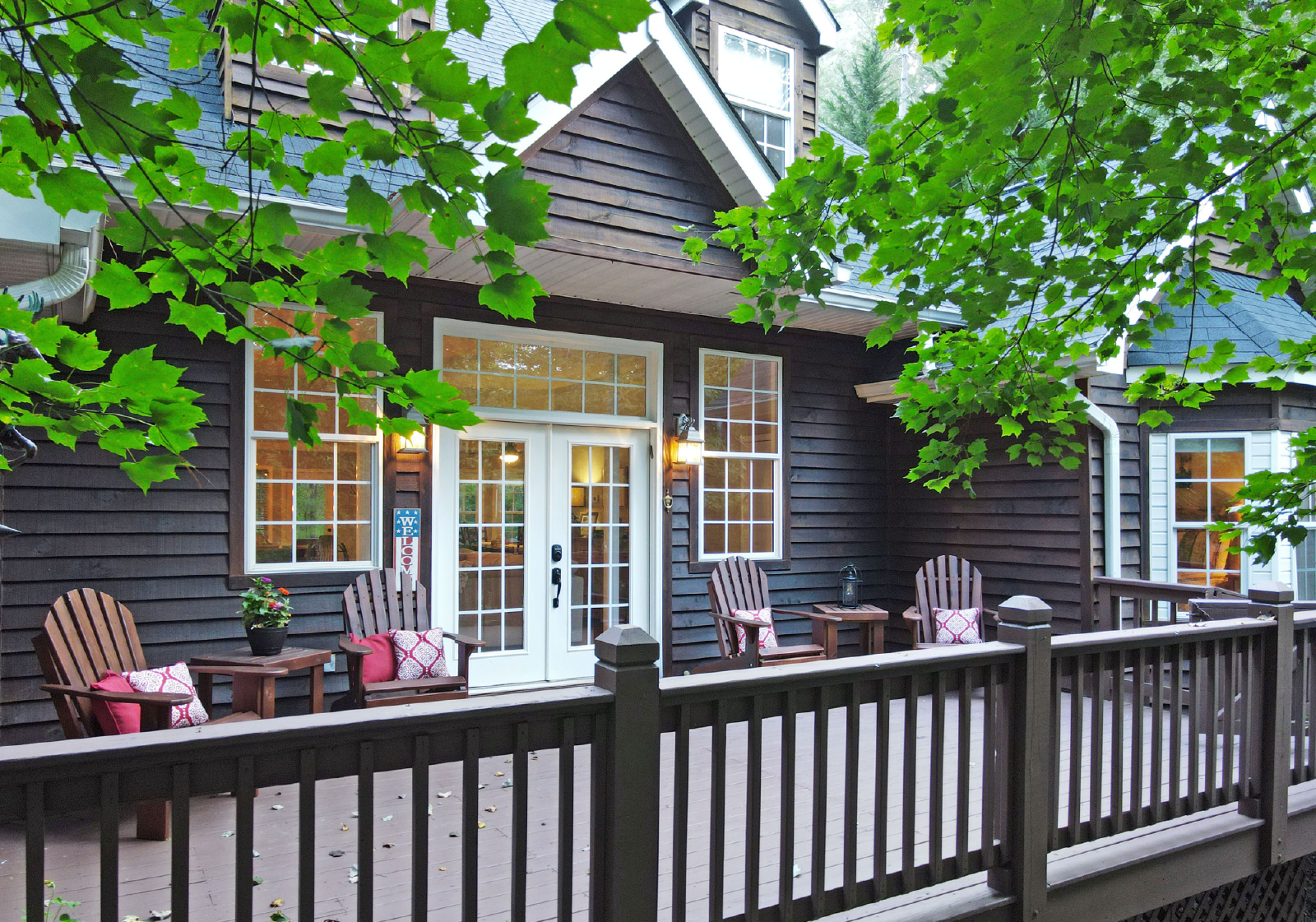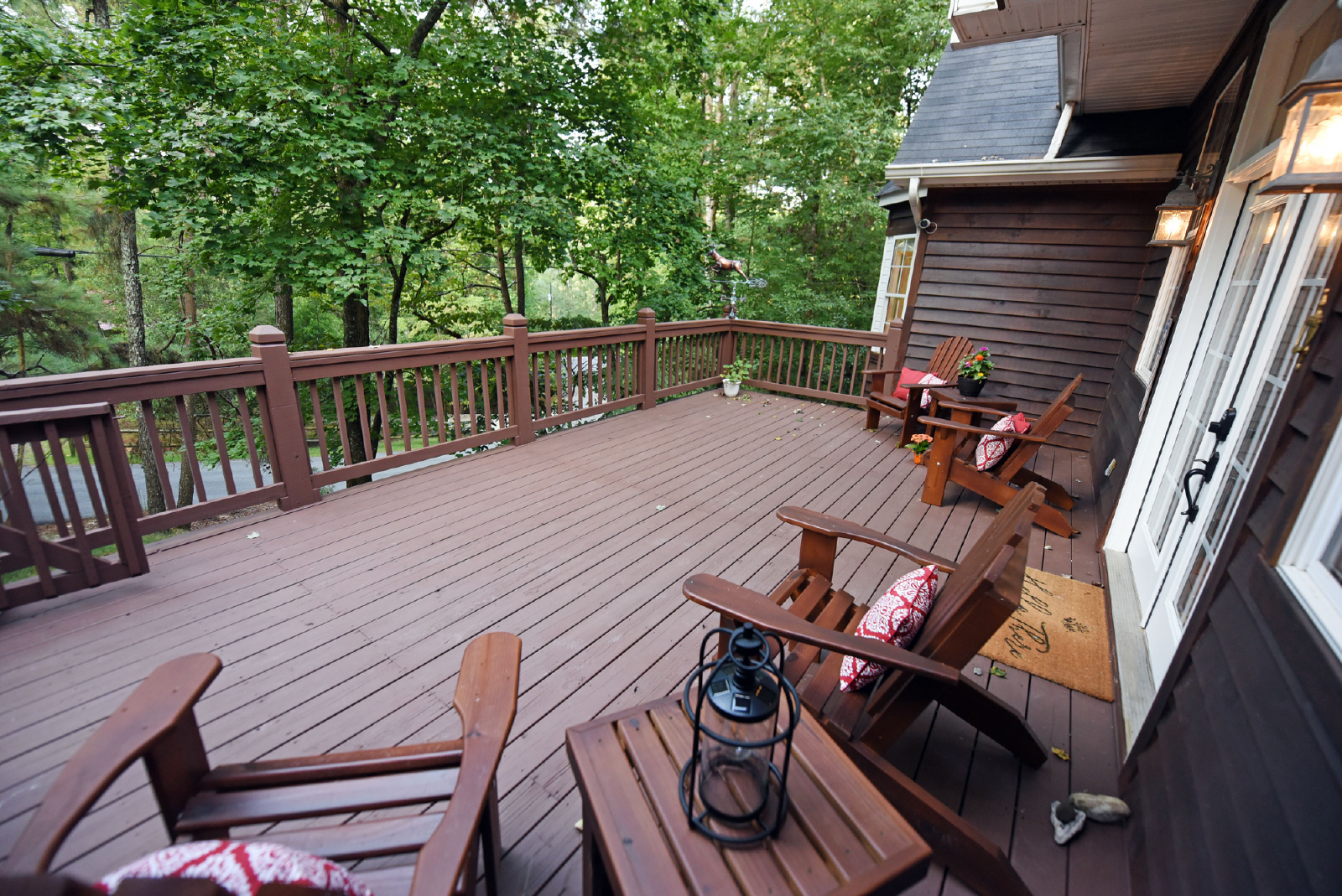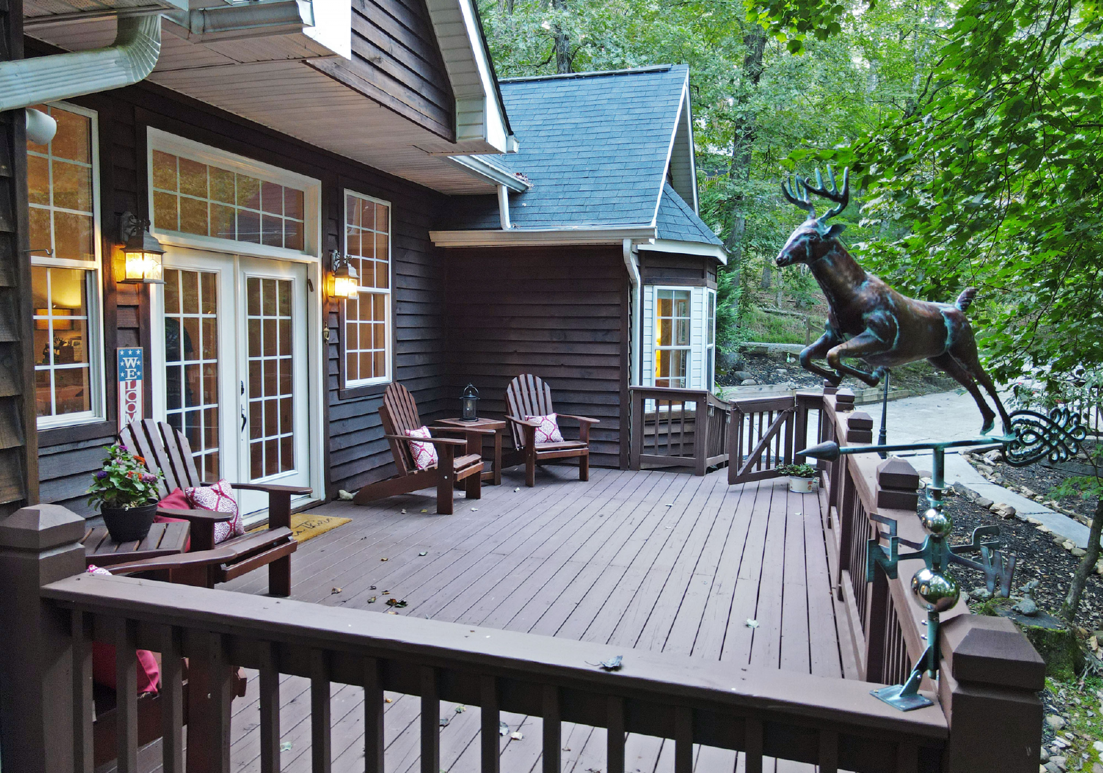 You will access the home from the front side onto a very open deck that is gated to allow for small children to roam free while relaxing in the large wooden chairs to watch the deer go by!