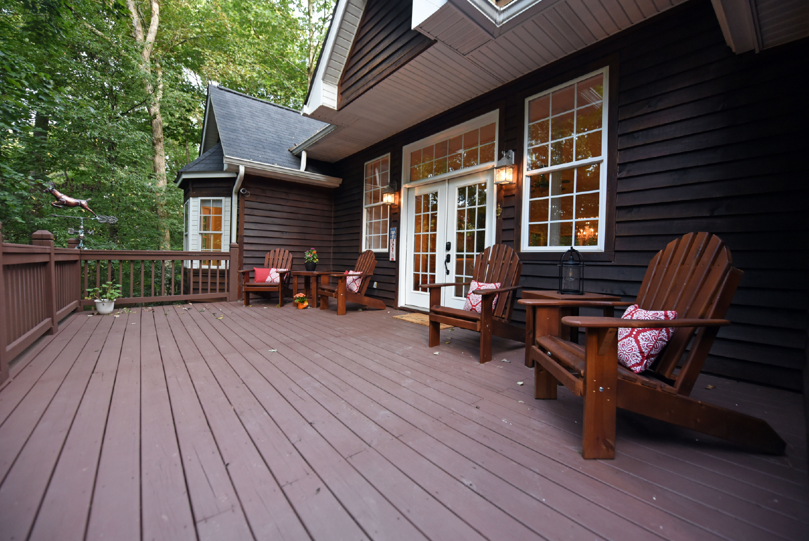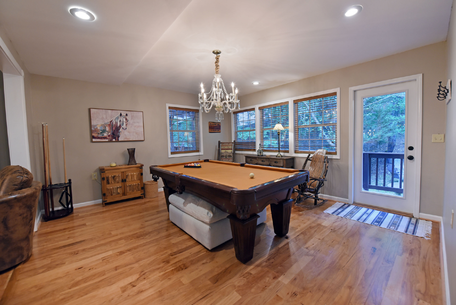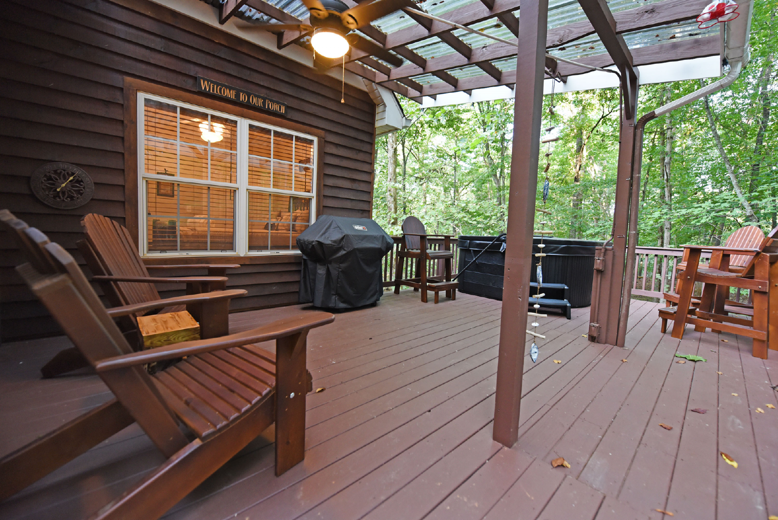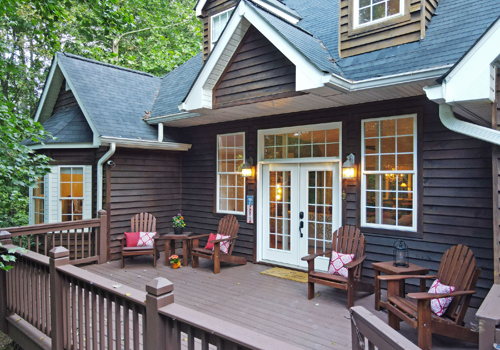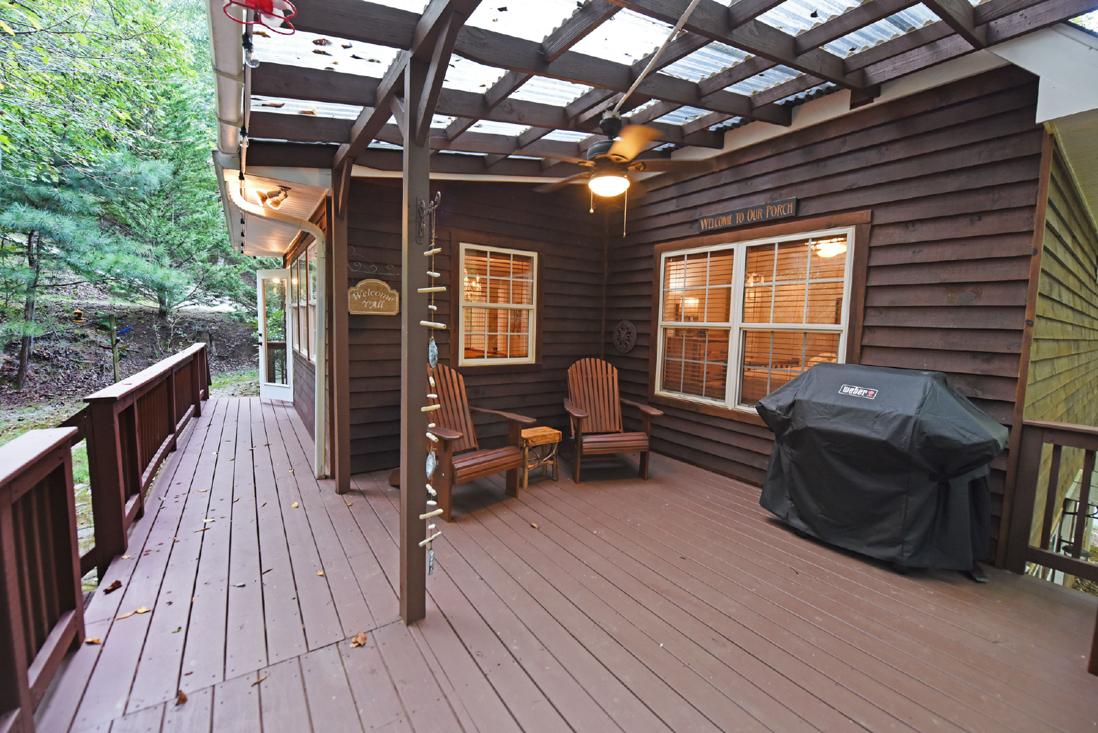 You will access the home from the front side onto a very open deck that is gated to allow for small children to roam free while relaxing in the large wooden chairs to watch the deer go by!