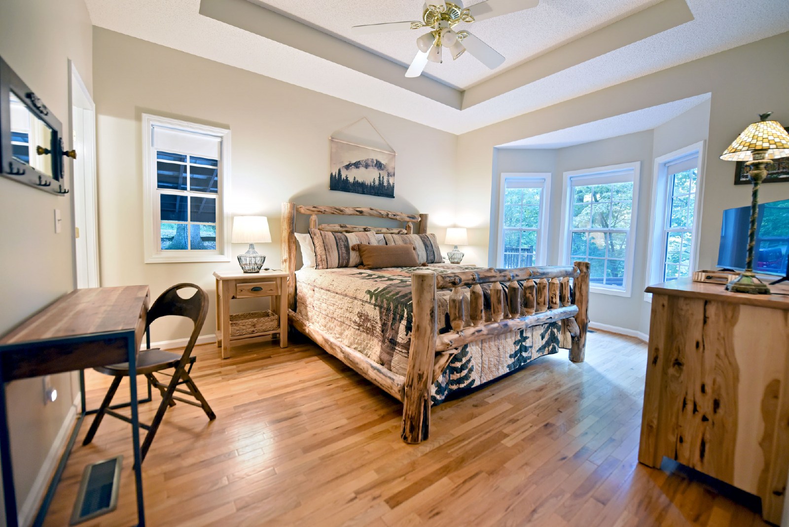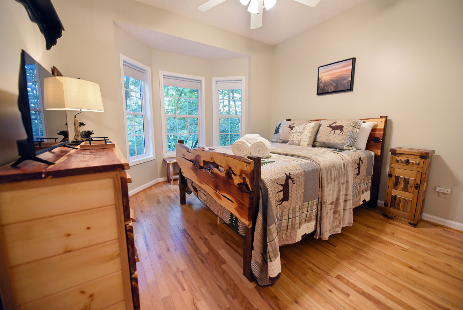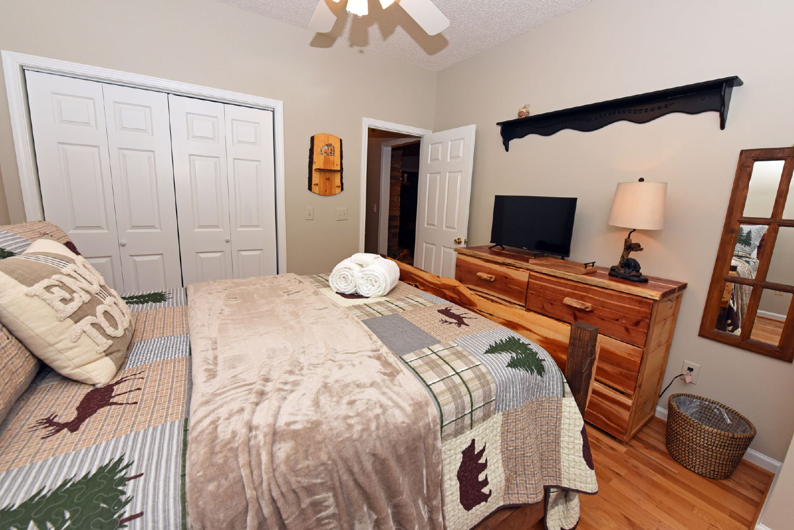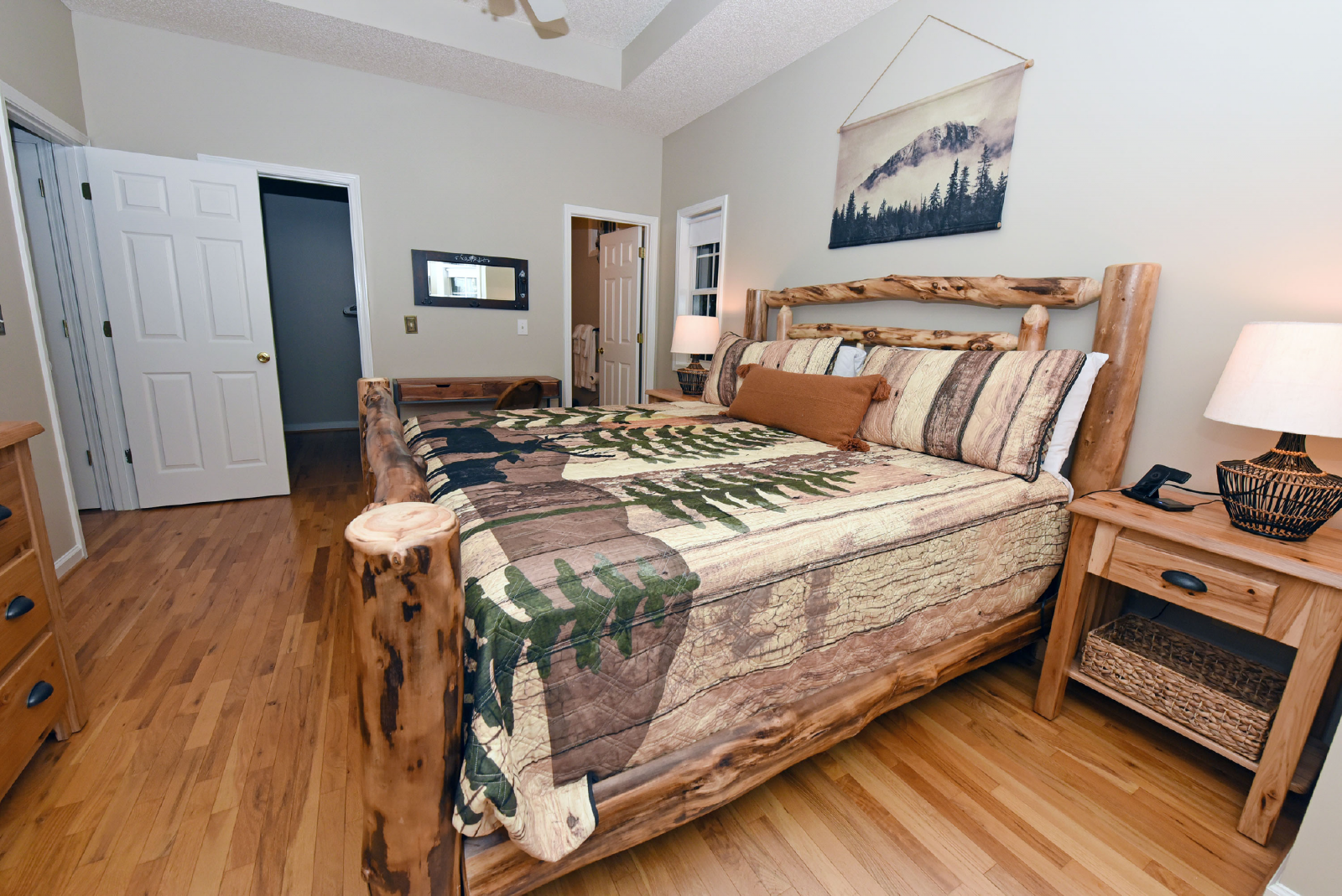 The first king suite is to the right as you enter, with a private bathroom featuring a glass walk-in shower! Plenty of space to escape and enjoy your evening.