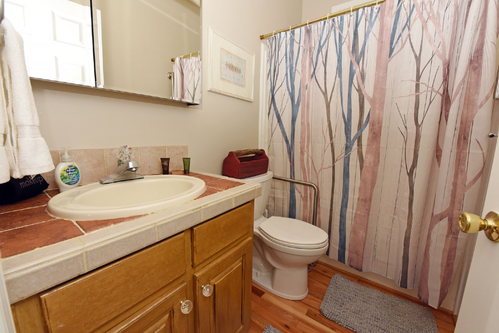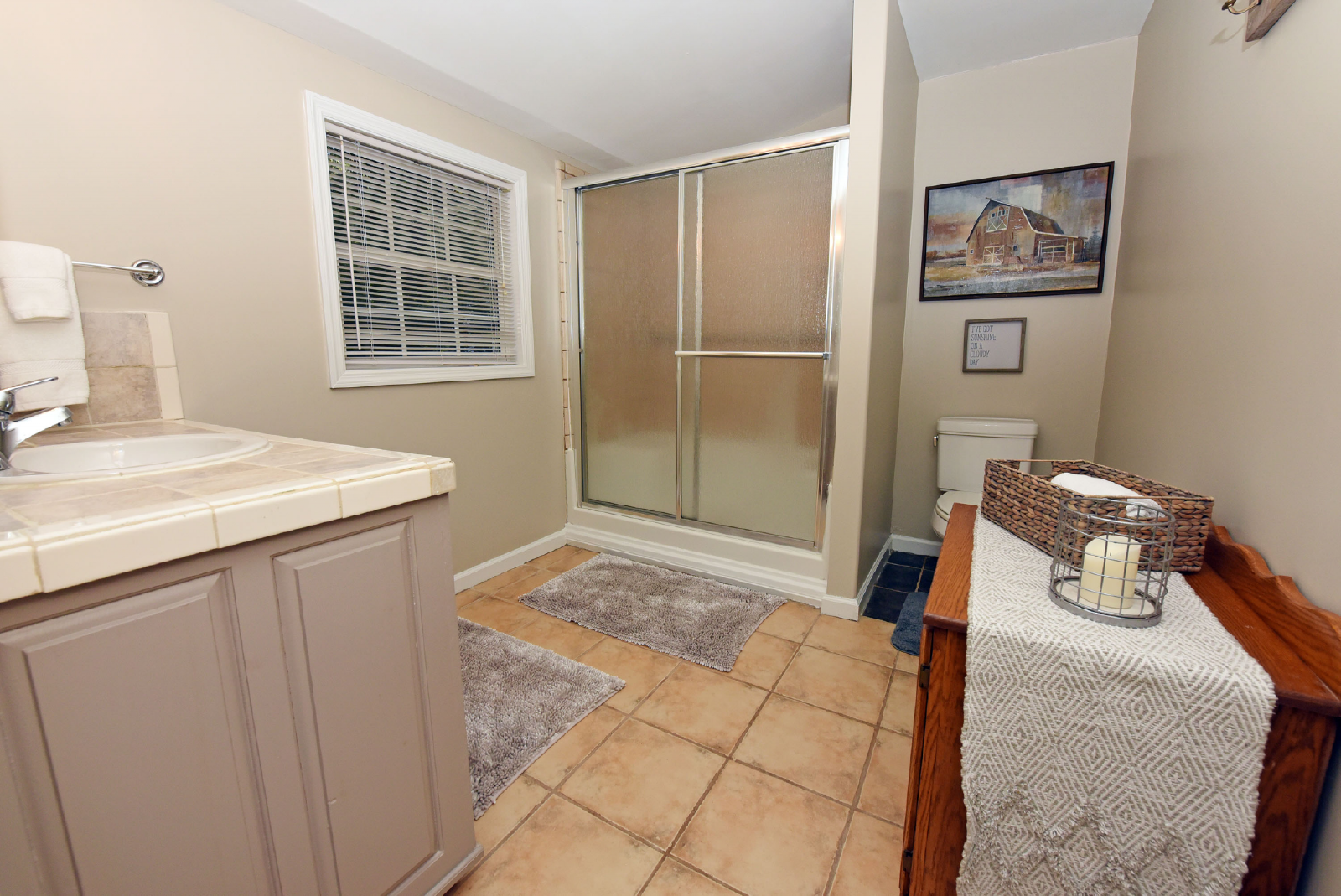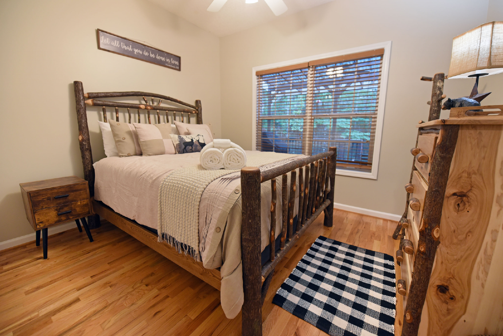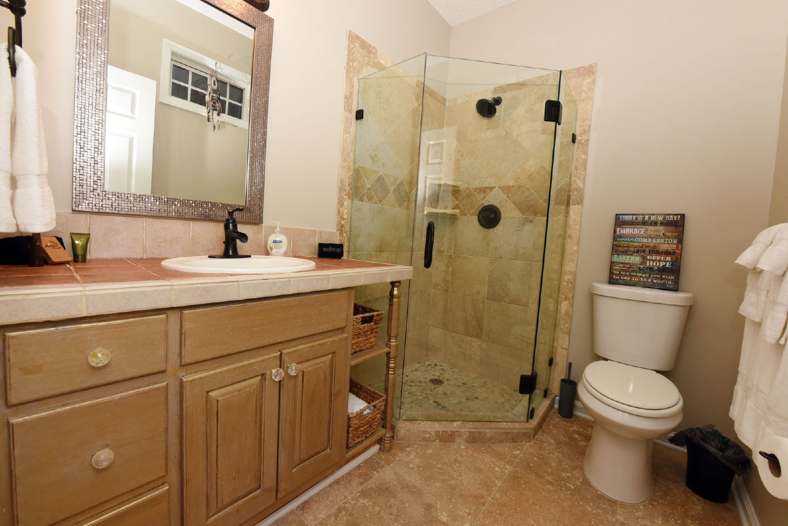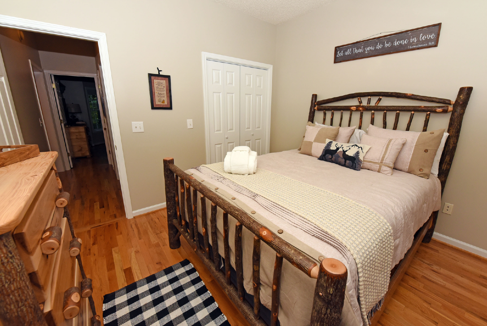 The first king suite is to the right as you enter, with a private bathroom featuring a glass walk-in shower! Plenty of space to escape and enjoy your evening.