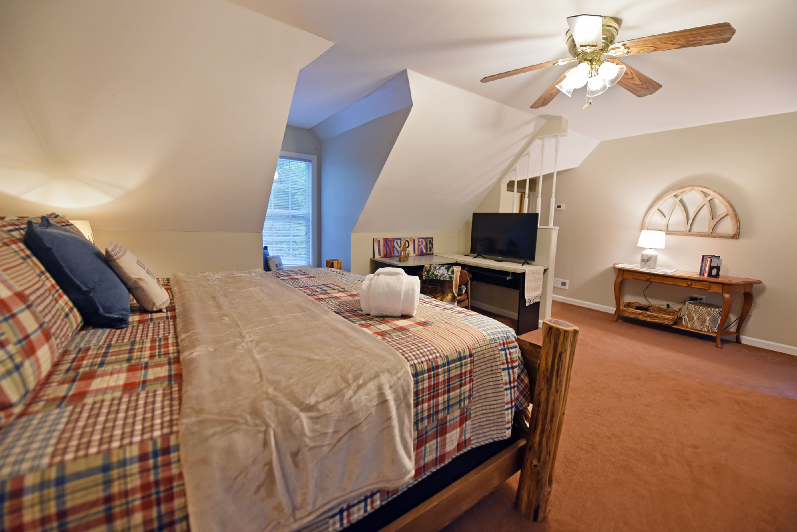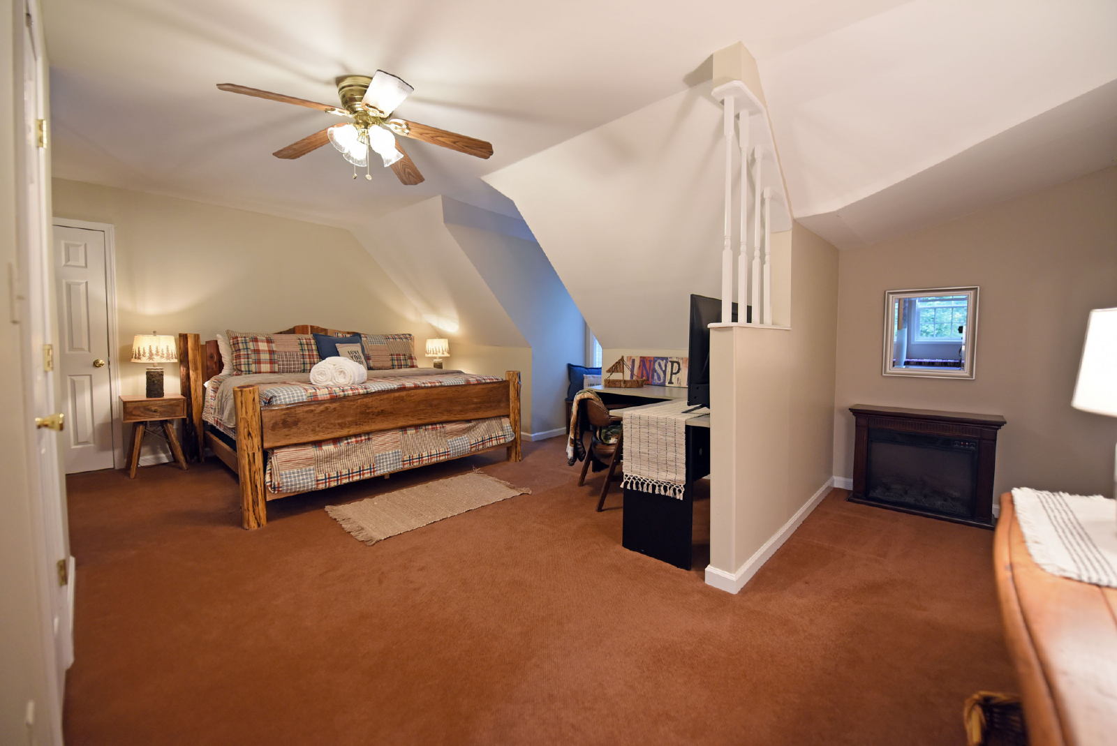 The very large second king suite is located off the kitchen upstairs with an office desk, sitting area, smart TV and very large private bathroom featuring a walk-in shower.
