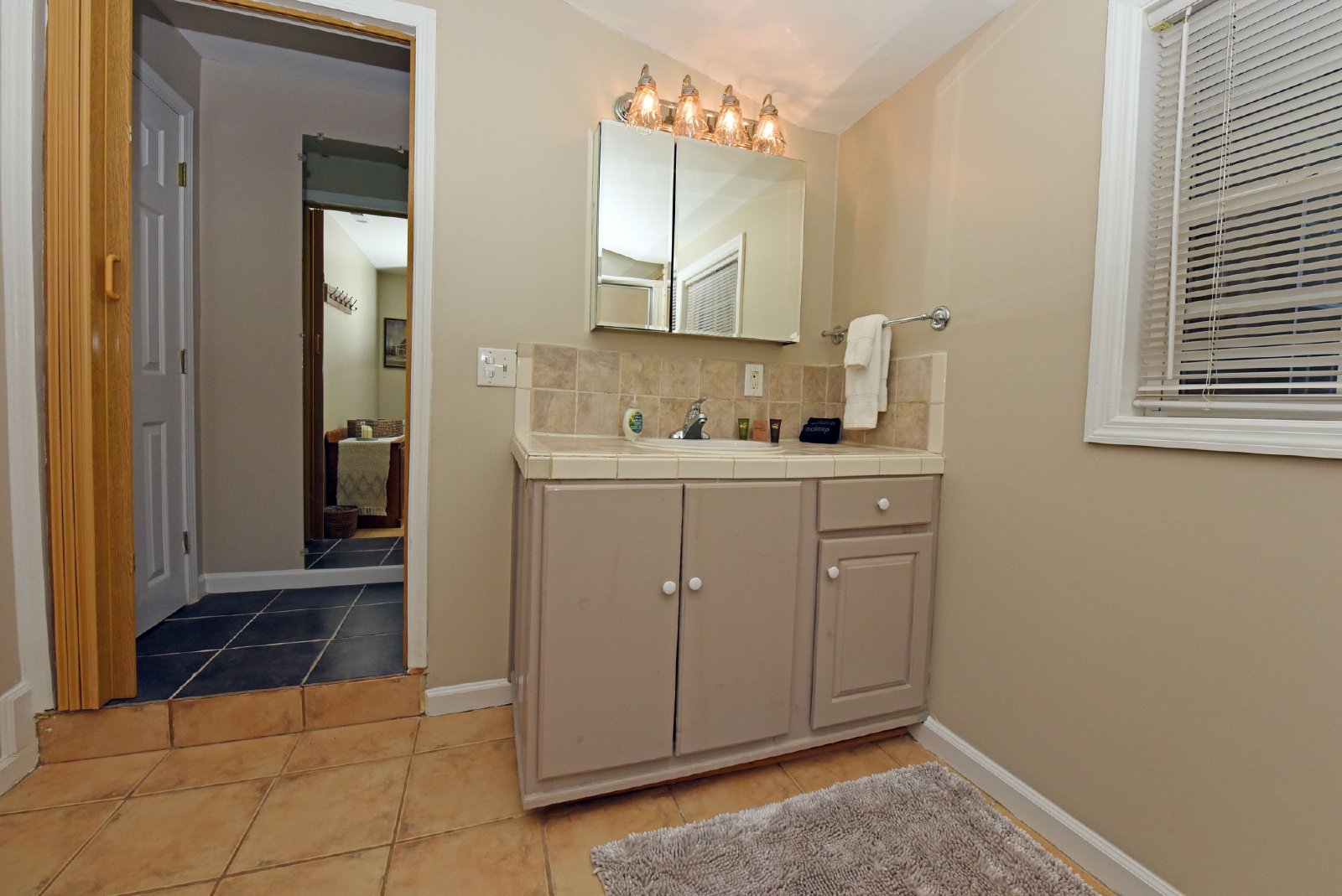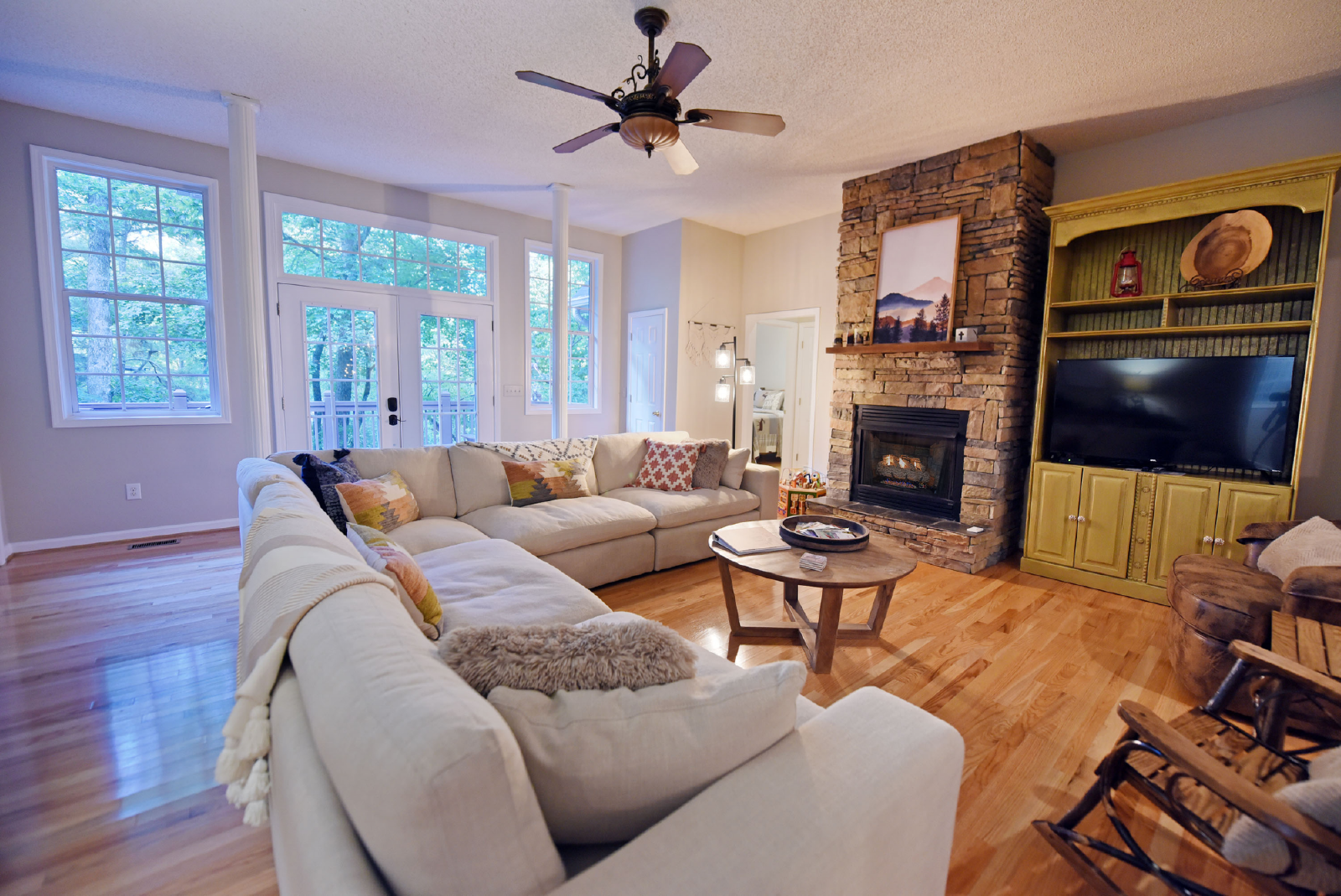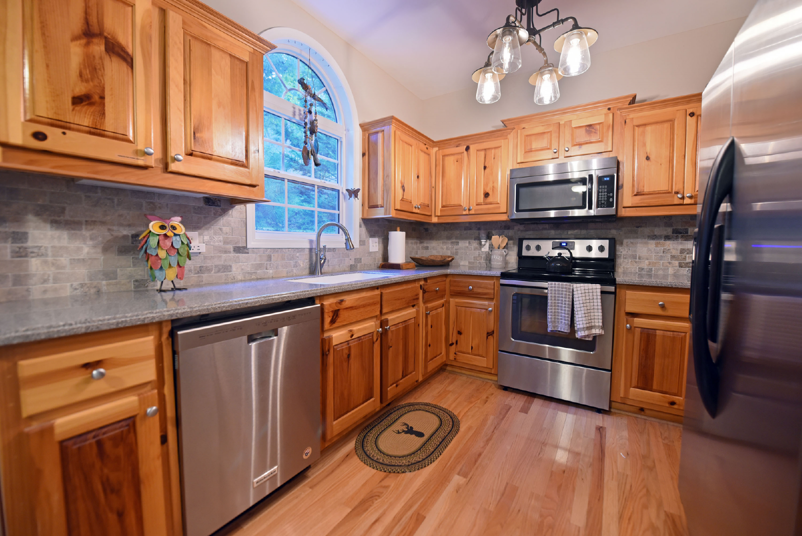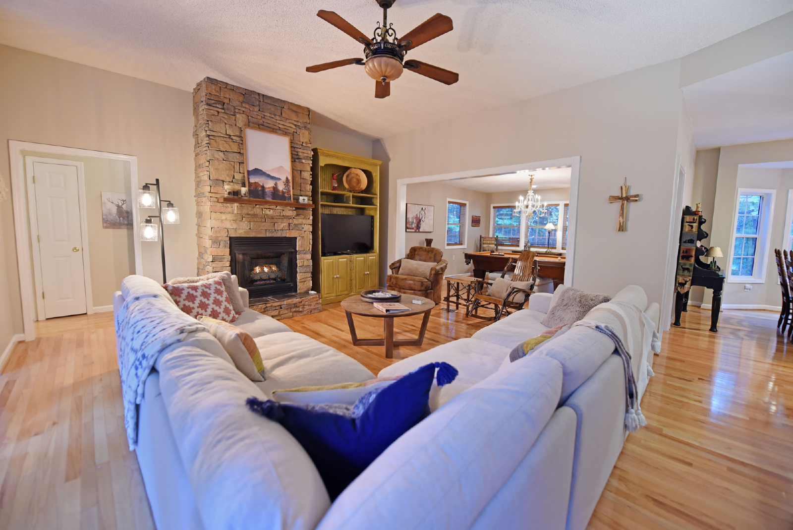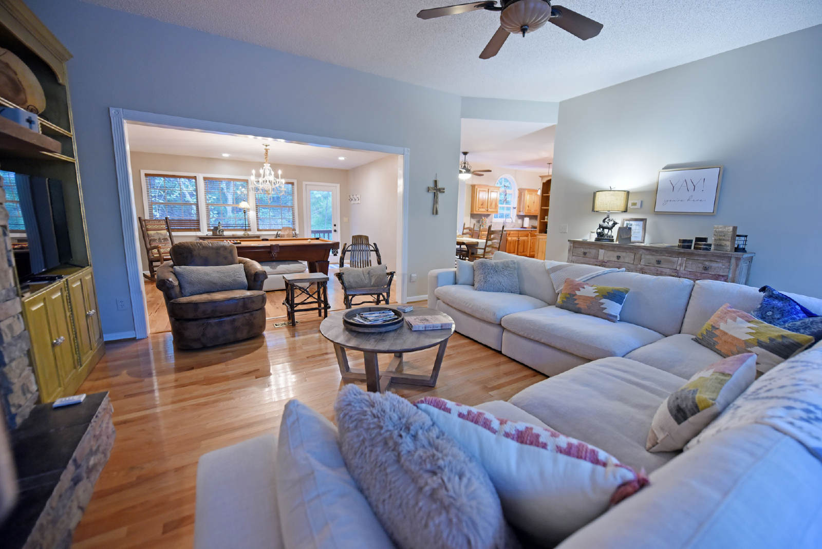 As you open the front door, you will be flooded by the very open living room featuring a large sectional sofa, gas fireplace and large screen TV. The room connects to a large size slate pool table room and full size kitchen with stainless steel appliances. Cable is also provided for your entertainment and an additional HDMI cable accessible for other electronic devices.