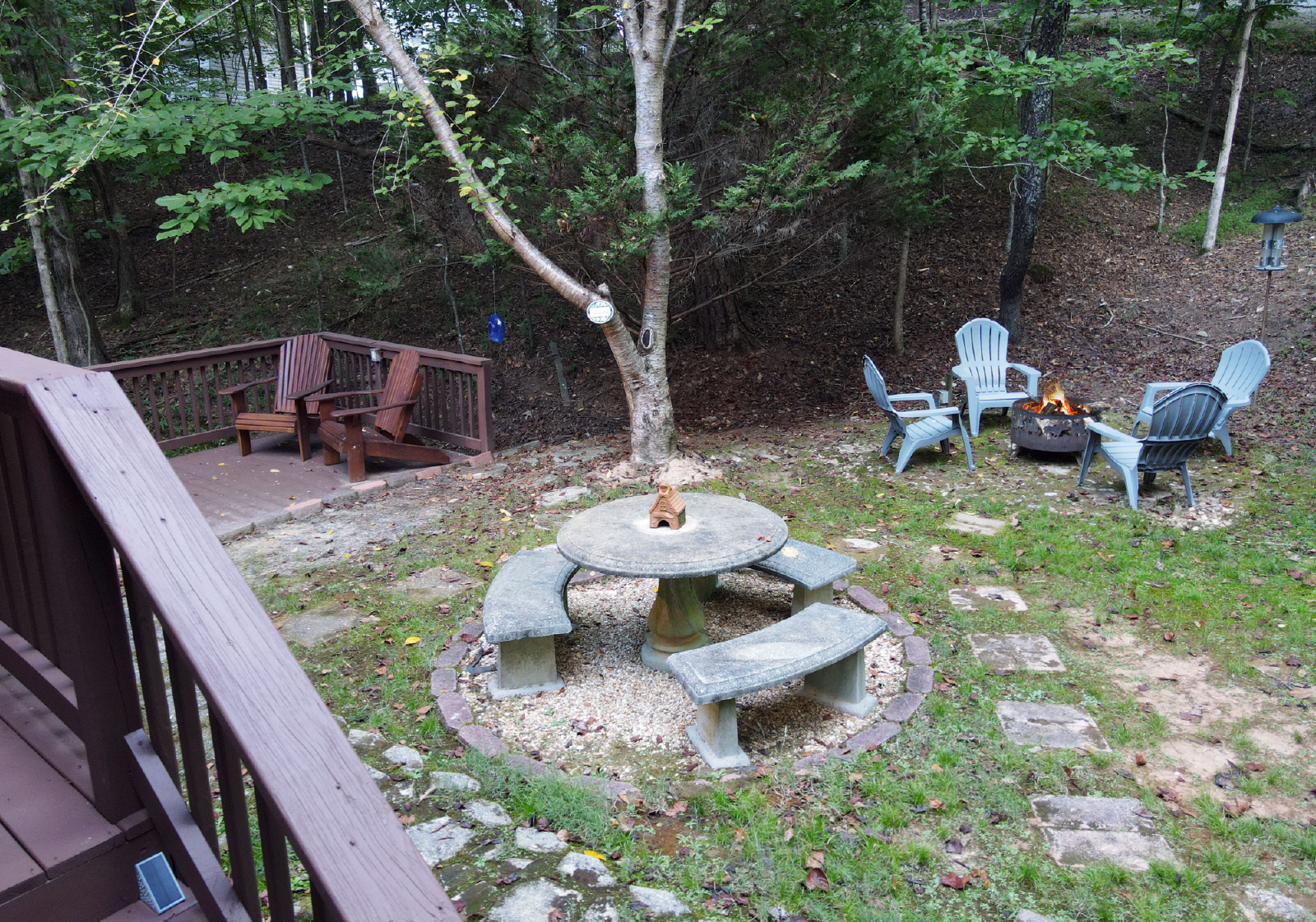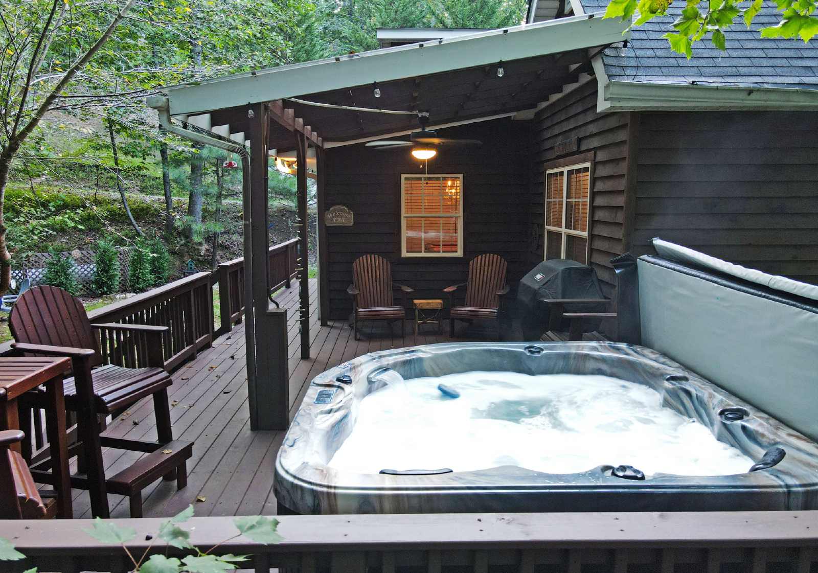 There is another deck space and garden area off the main floor from the kitchen or pool table room. It features a five-person hot tub, gas grill, seating area, overlooking the small yard.