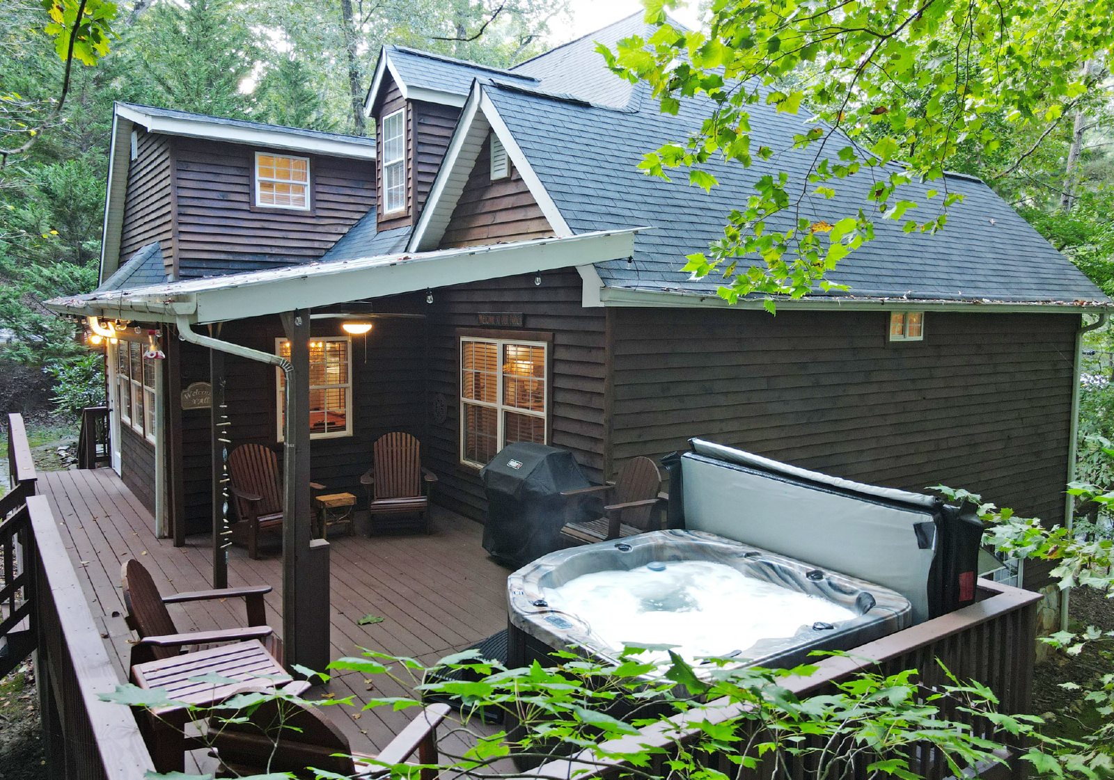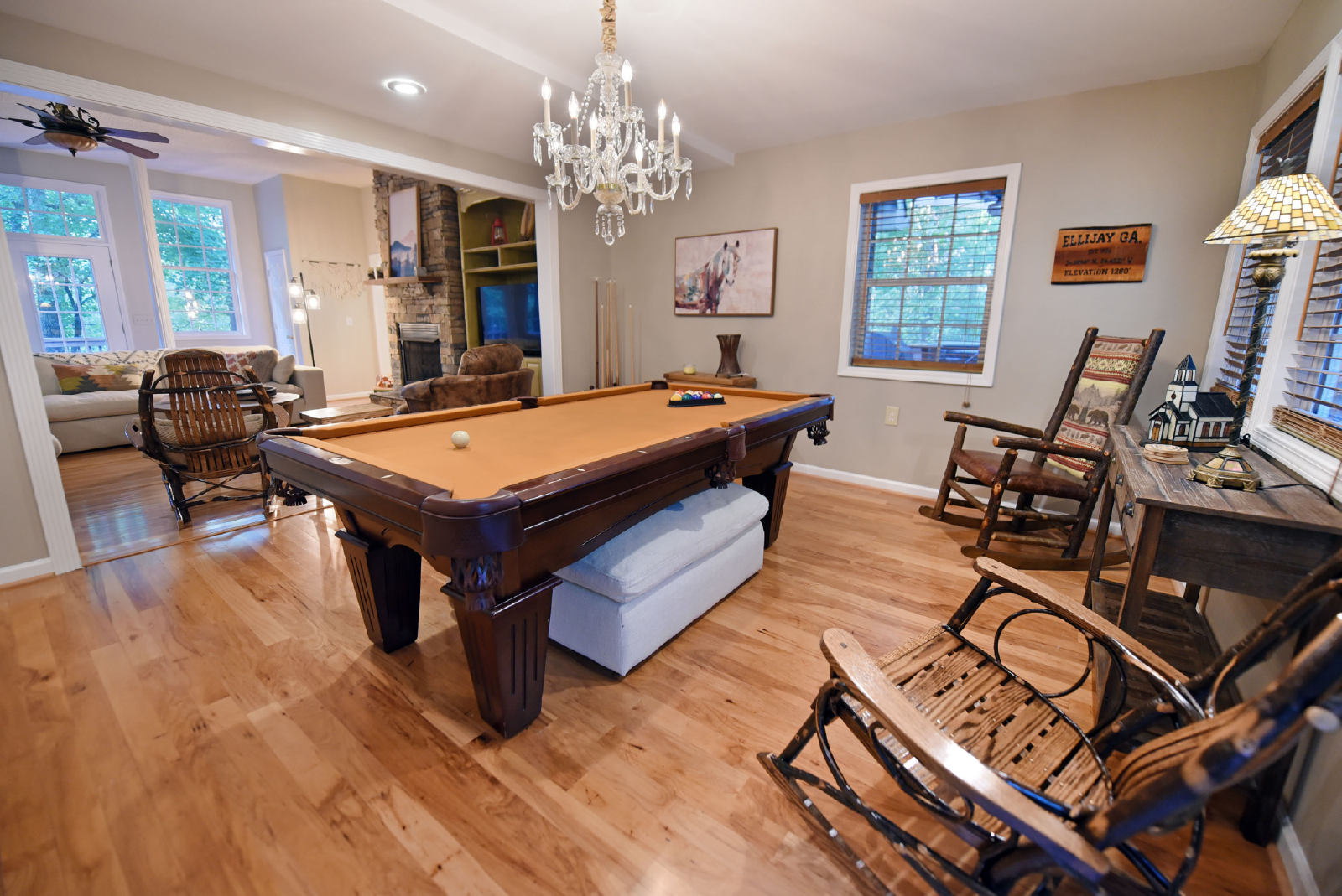 Located in Coosawattee River Resort, this amazing, spacious cabin is the perfect family getaway! Large outdoor porches, five-person hot tub, pool table, two king master suites, small kids getaway and three full bathrooms. You will have free access to all of the resort amenities and the property is just inside the middle gate making it only 10 minutes from downtown Ellijay! About the name, kids will have a blast letting deer eat out of their hands! You are sure to see plenty, Deer Path Lodge!