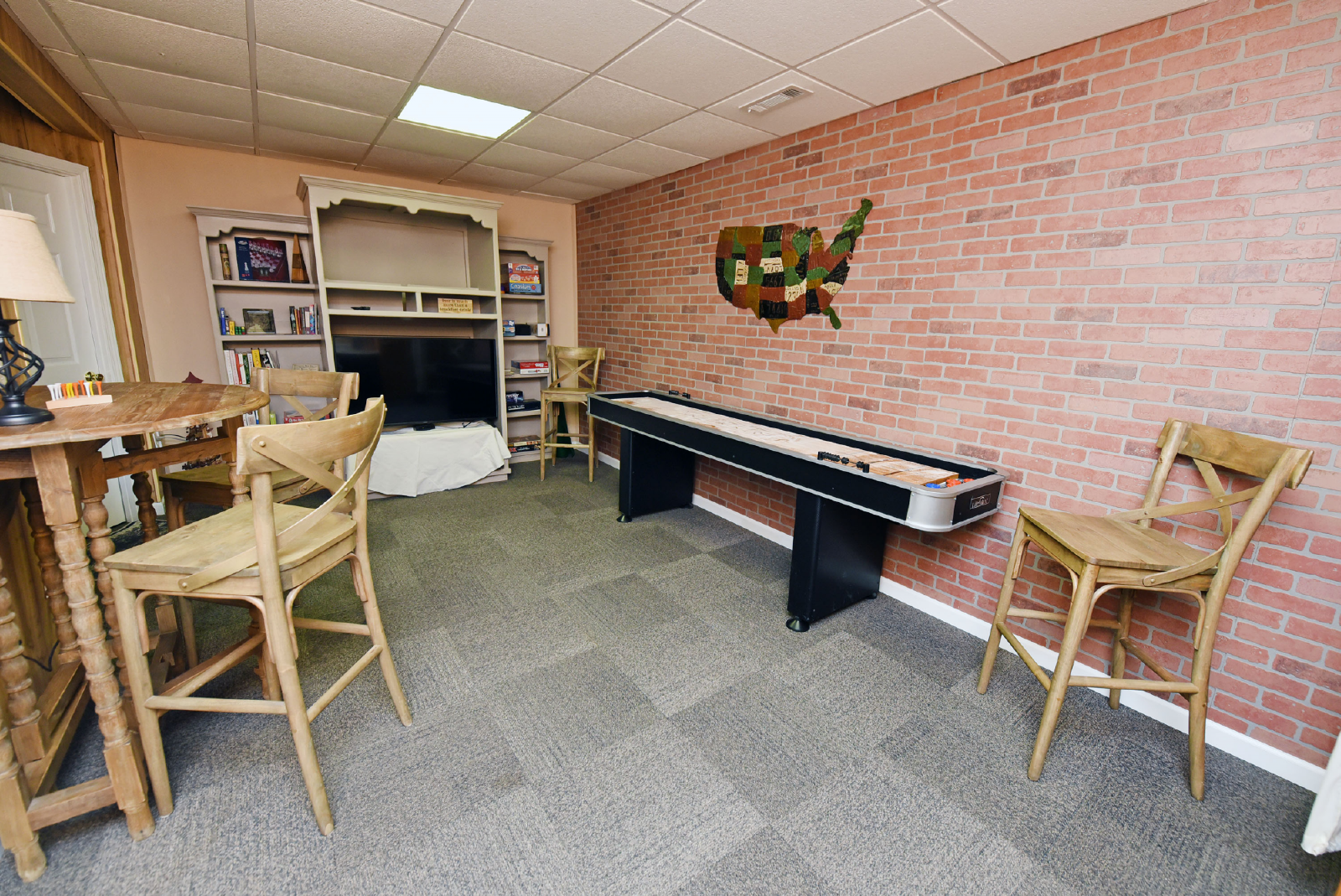 Downstairs features a small kids getaway including, shuffleboard, darts, seating area and smart TV with HDMI cables for other electronic devices.
