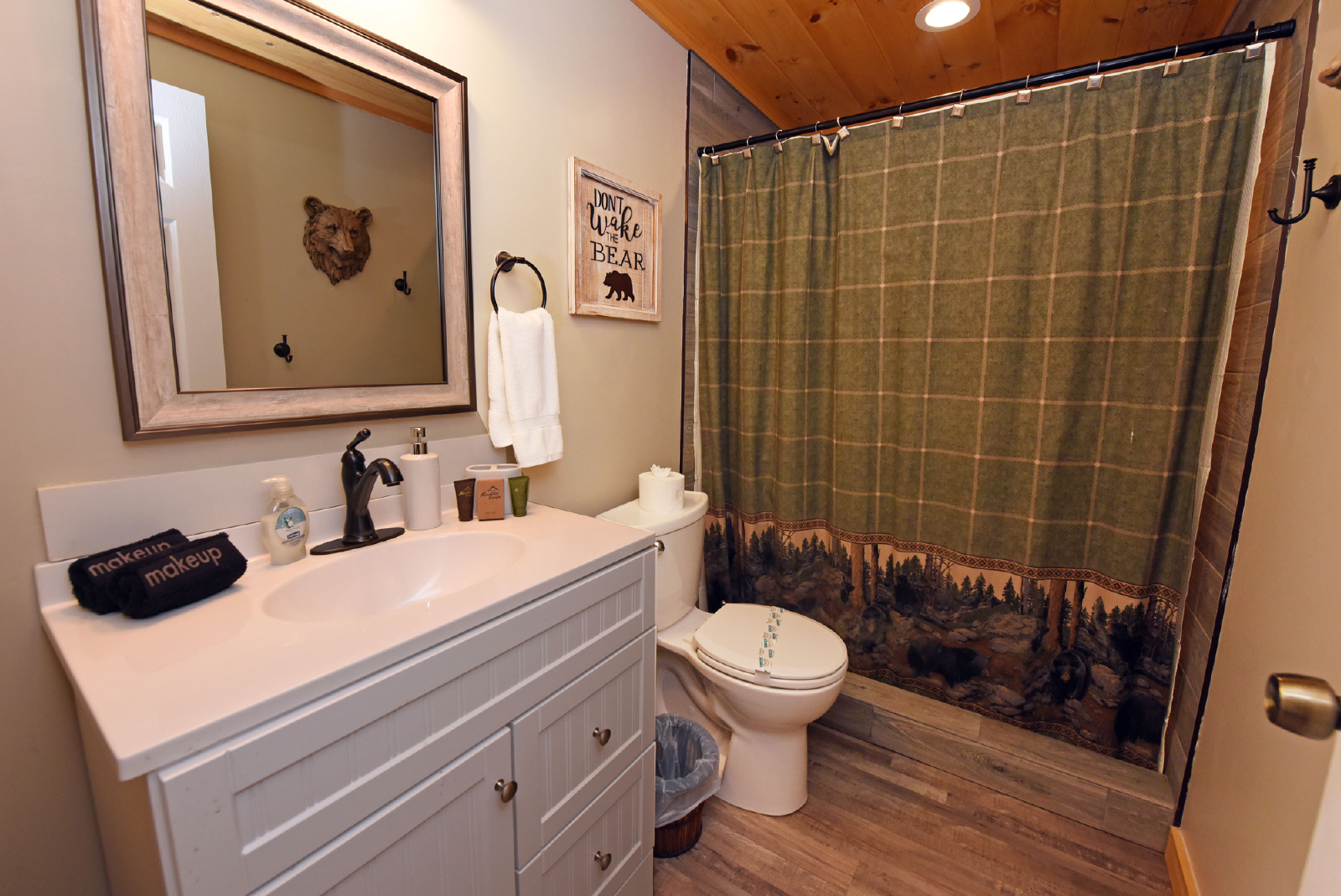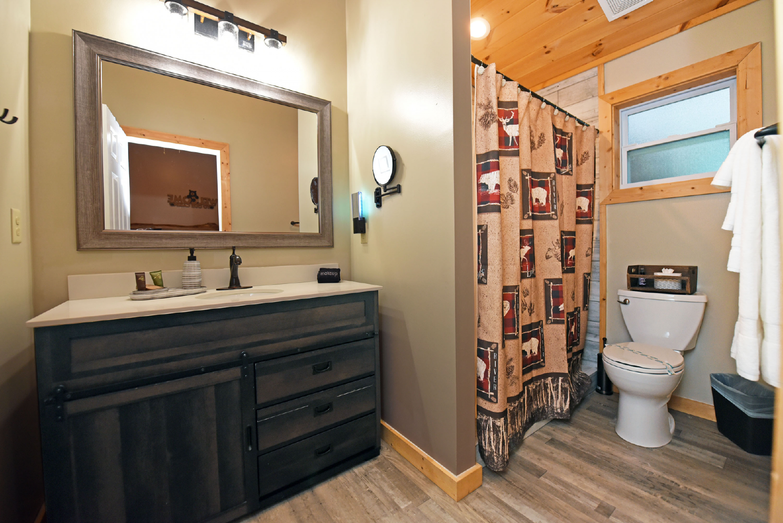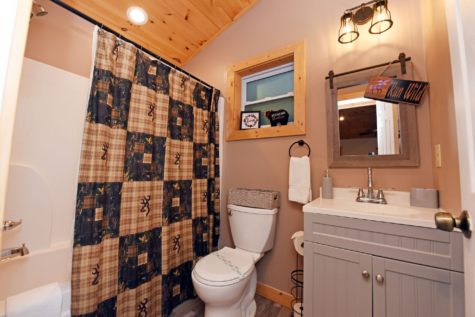 Located in Coosawattee resort, this beautiful farmhouse cabin provides an amazing private location to enjoy your mountain getaway! All of the amenities offered by Coosawattee are included in your stay. With three large bedrooms, three bathrooms, ample living space, large kitchen/dining area, porches, fire pit and hot tub, it is sure to please all members of your family. Large flat screen TV’s in each living area, beautiful stone electric fireplace, outdoor living space and deer everywhere!