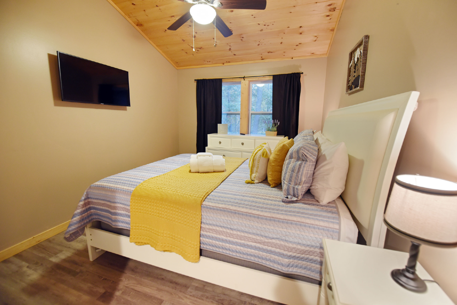 The master king suite is located to your left as you go up the stairs. It has a full size bathroom, smart TV and seating area.