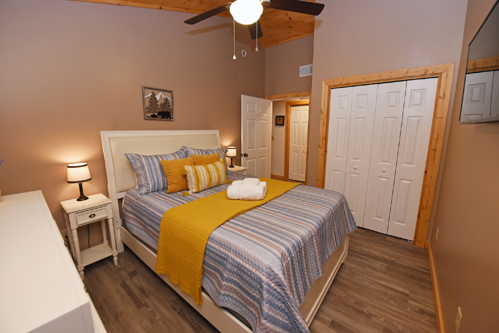 The first of the three bedrooms is on this level, featuring a full bed and has a separate bathroom just down the hall.