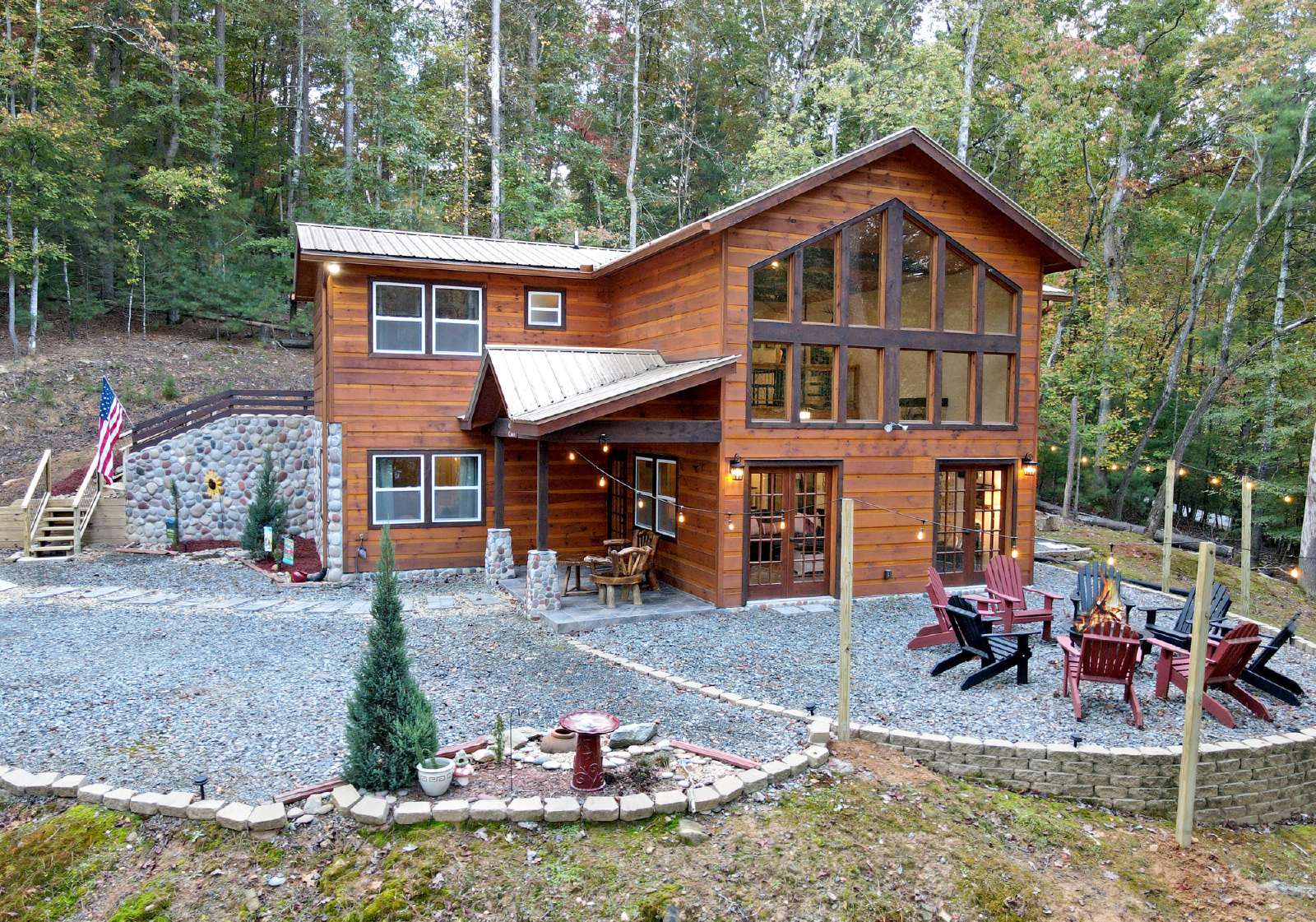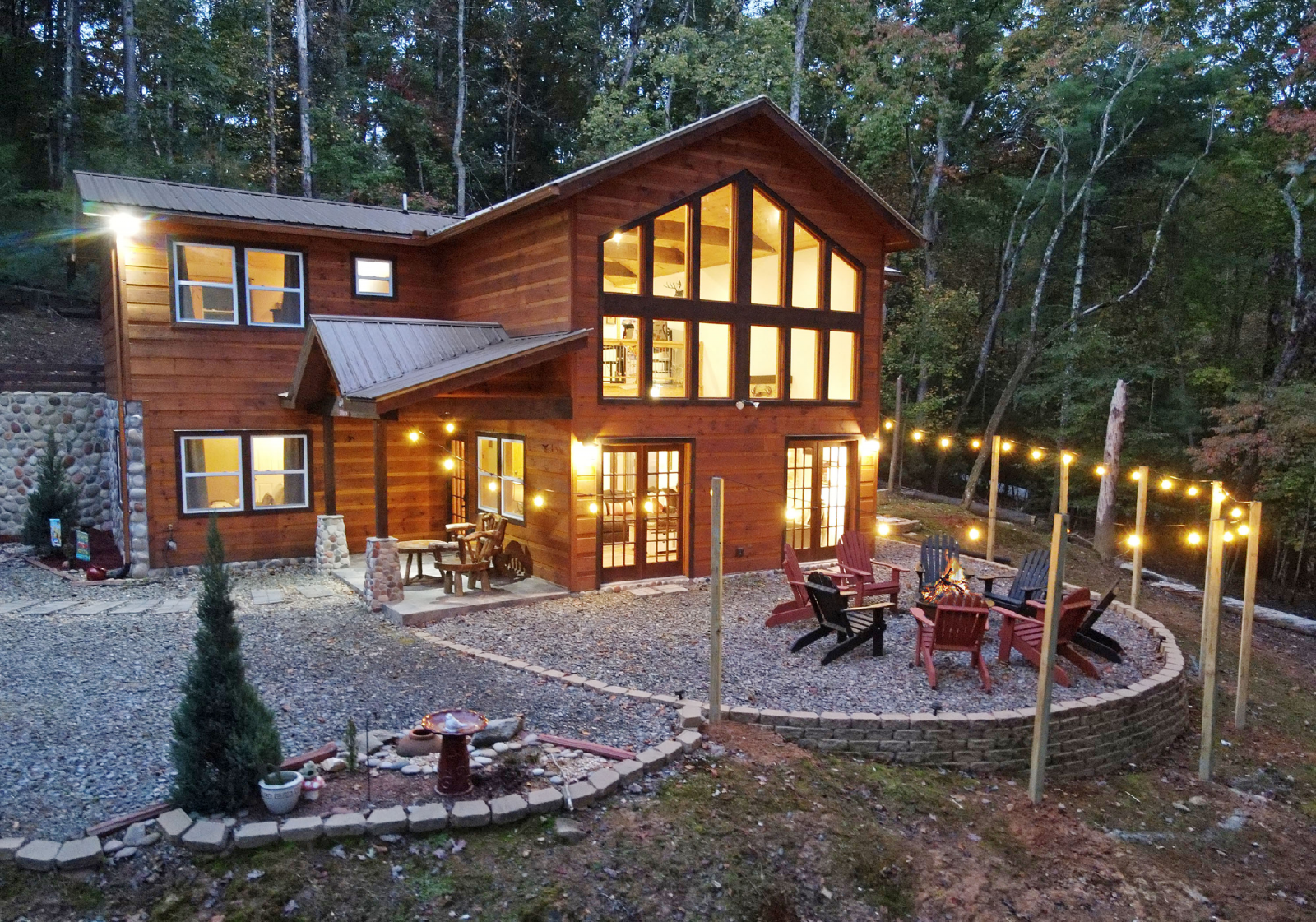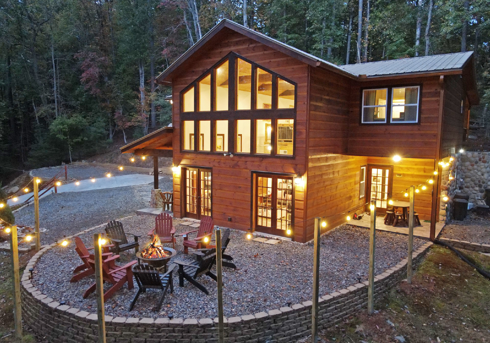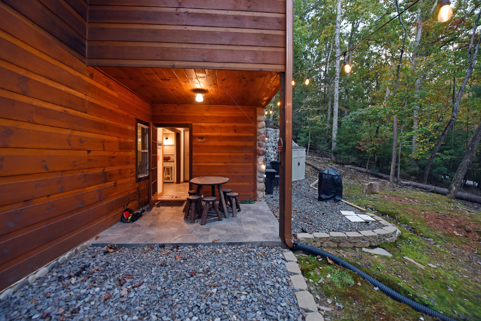 There is a small covered porch, with charcoal grill, dining table and additional seating outside the kitchen. The fire pit area is directly off the living room, has adirondack chairs and string lights to enjoy the beautiful mountain evenings!