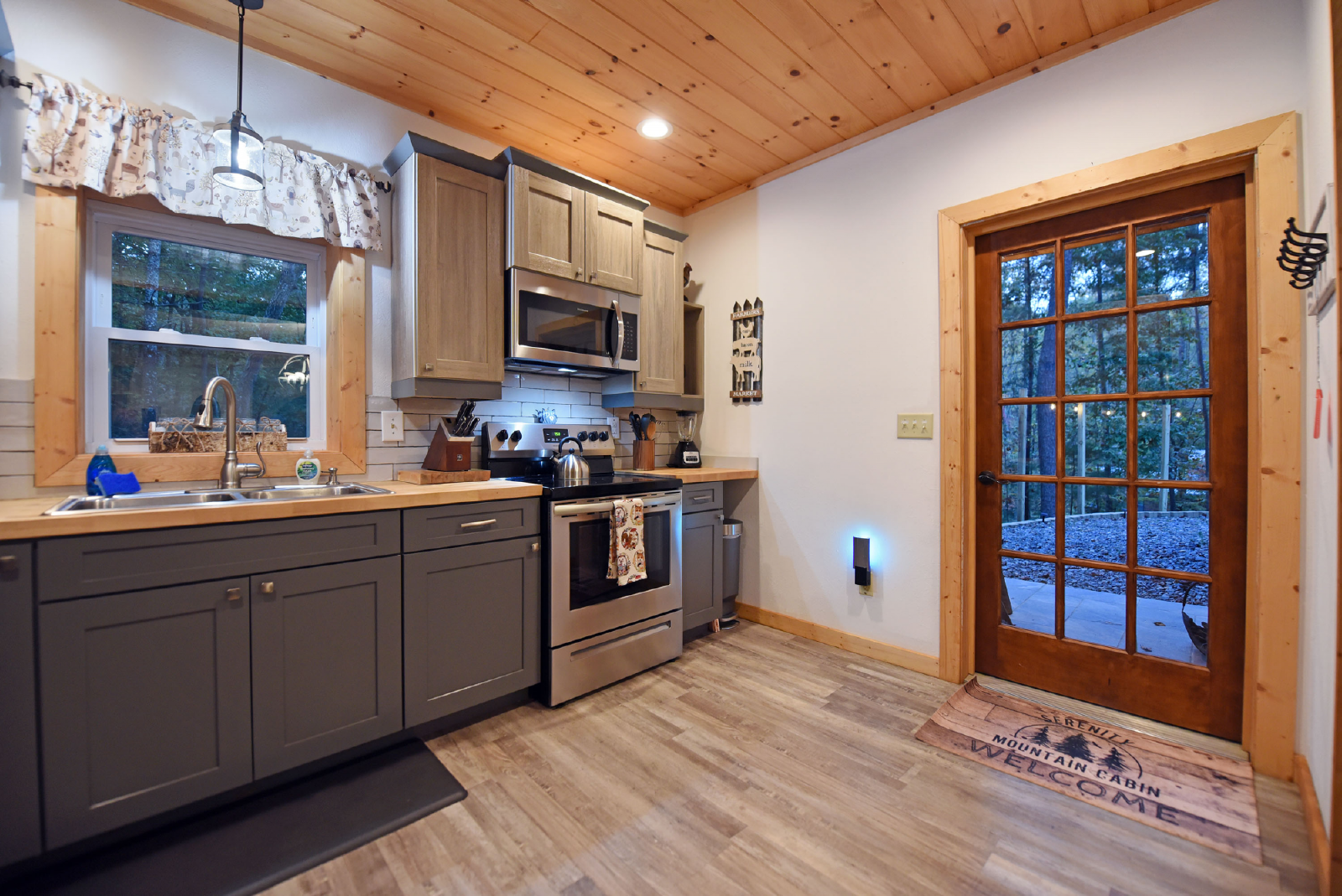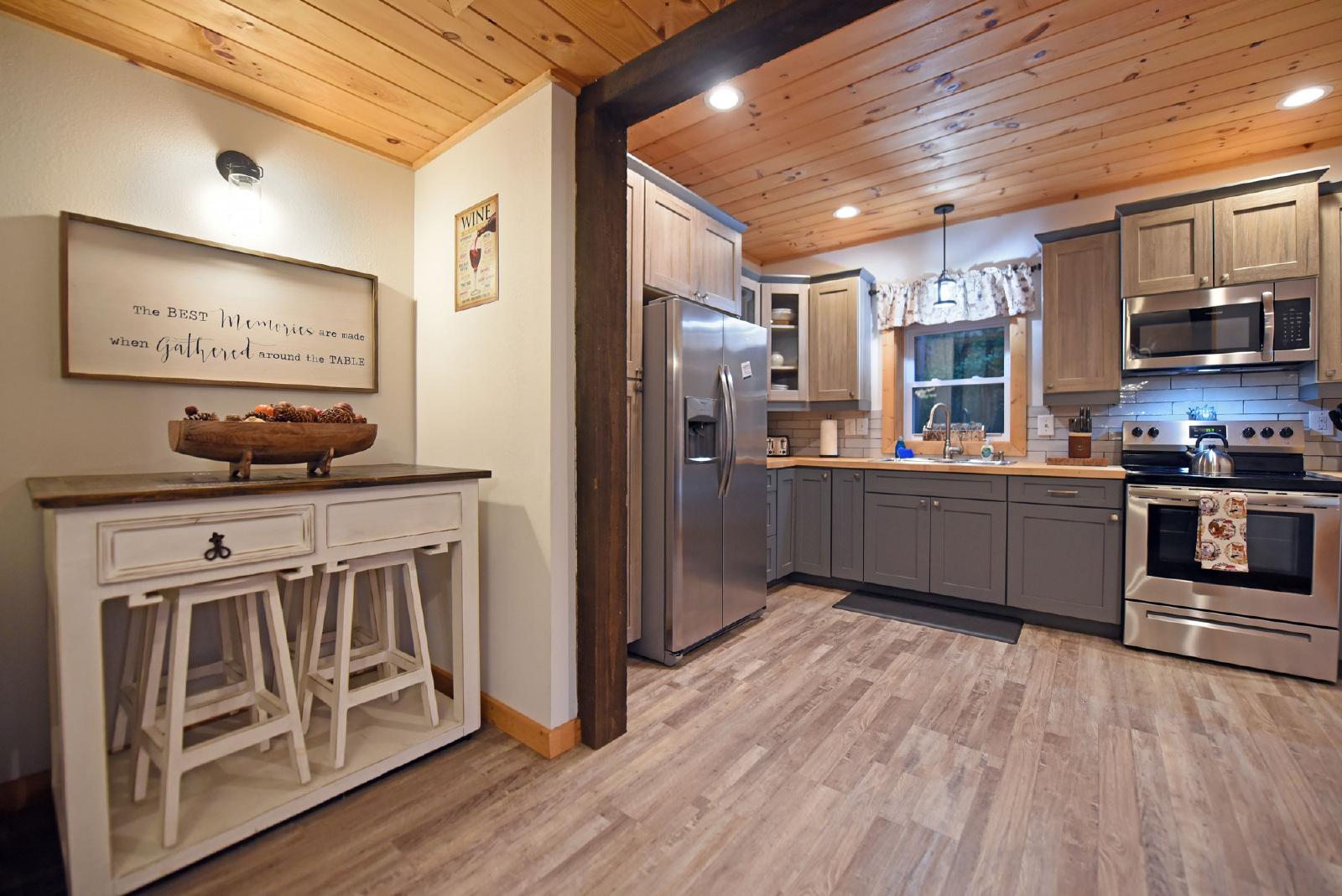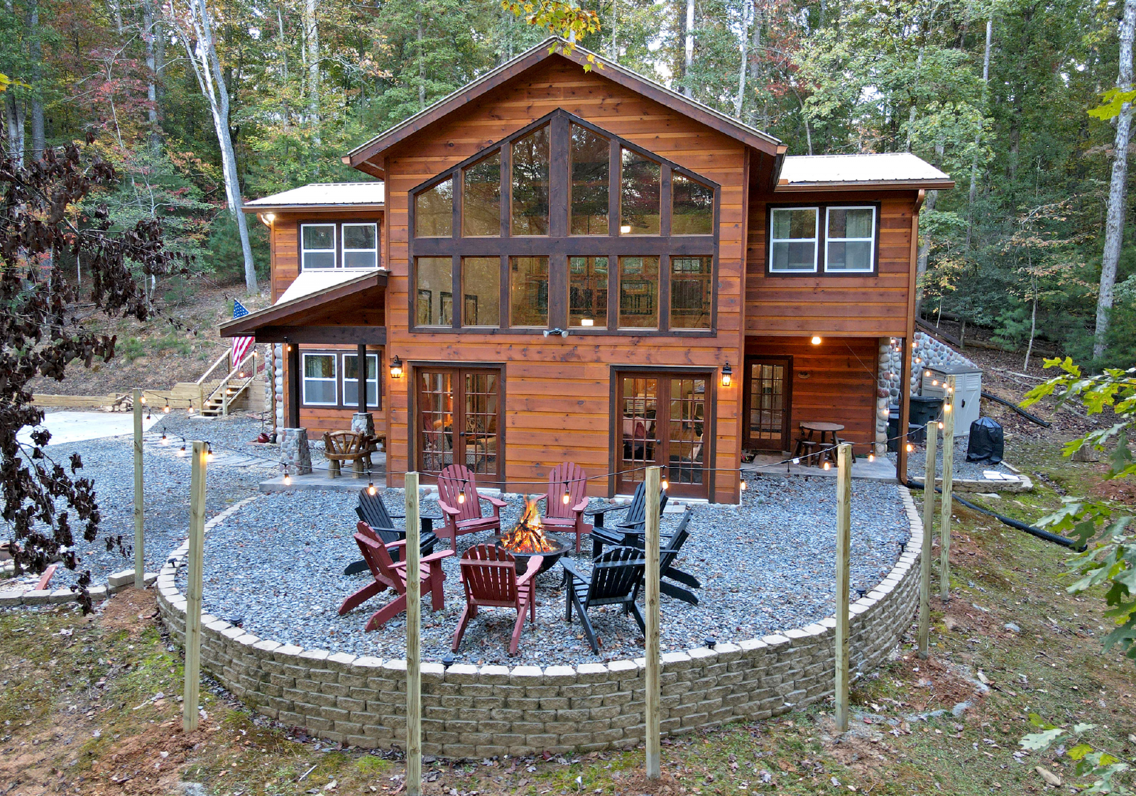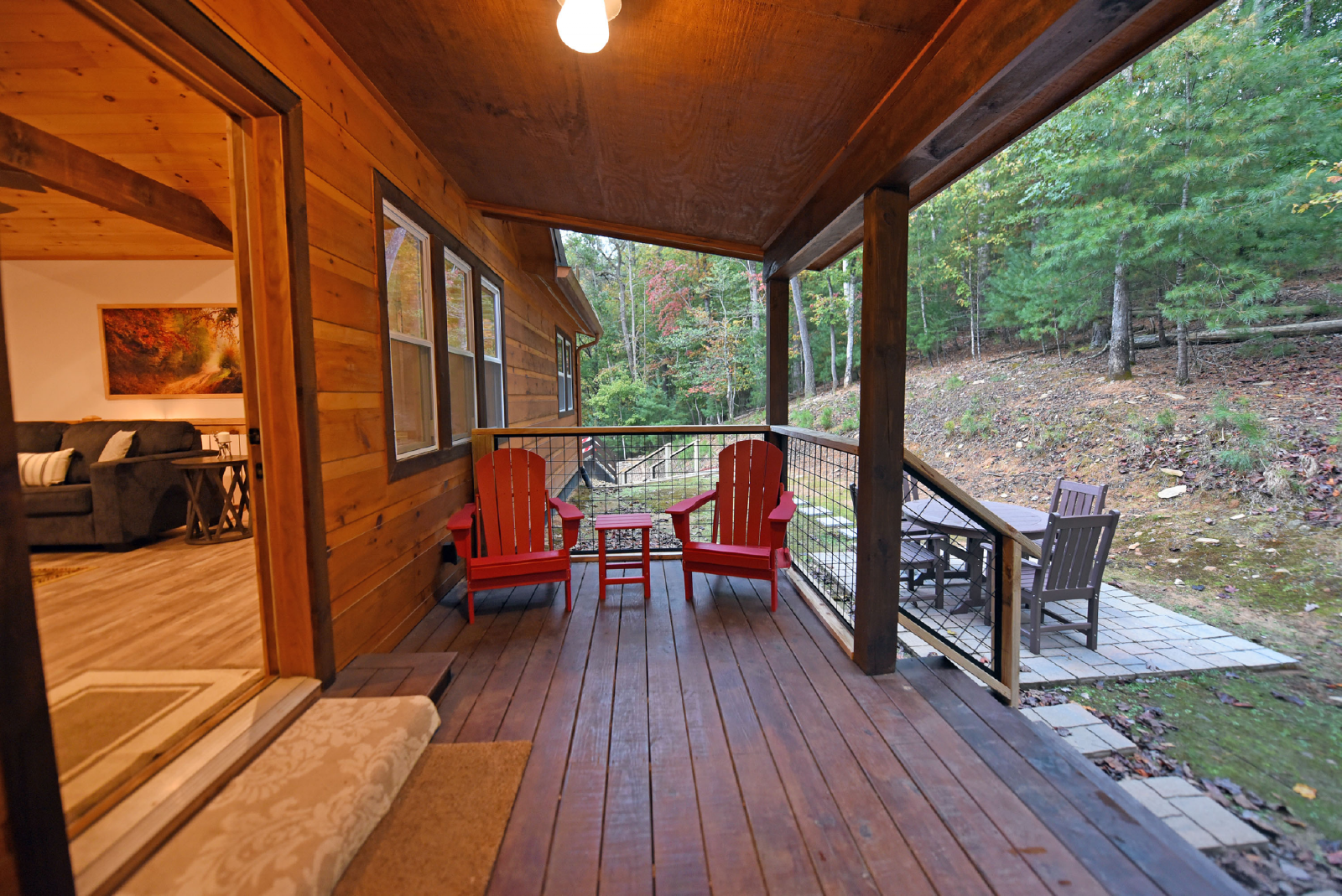 There is a small covered porch, with charcoal grill, dining table and additional seating outside the kitchen. The fire pit area is directly off the living room, has adirondack chairs and string lights to enjoy the beautiful mountain evenings!
