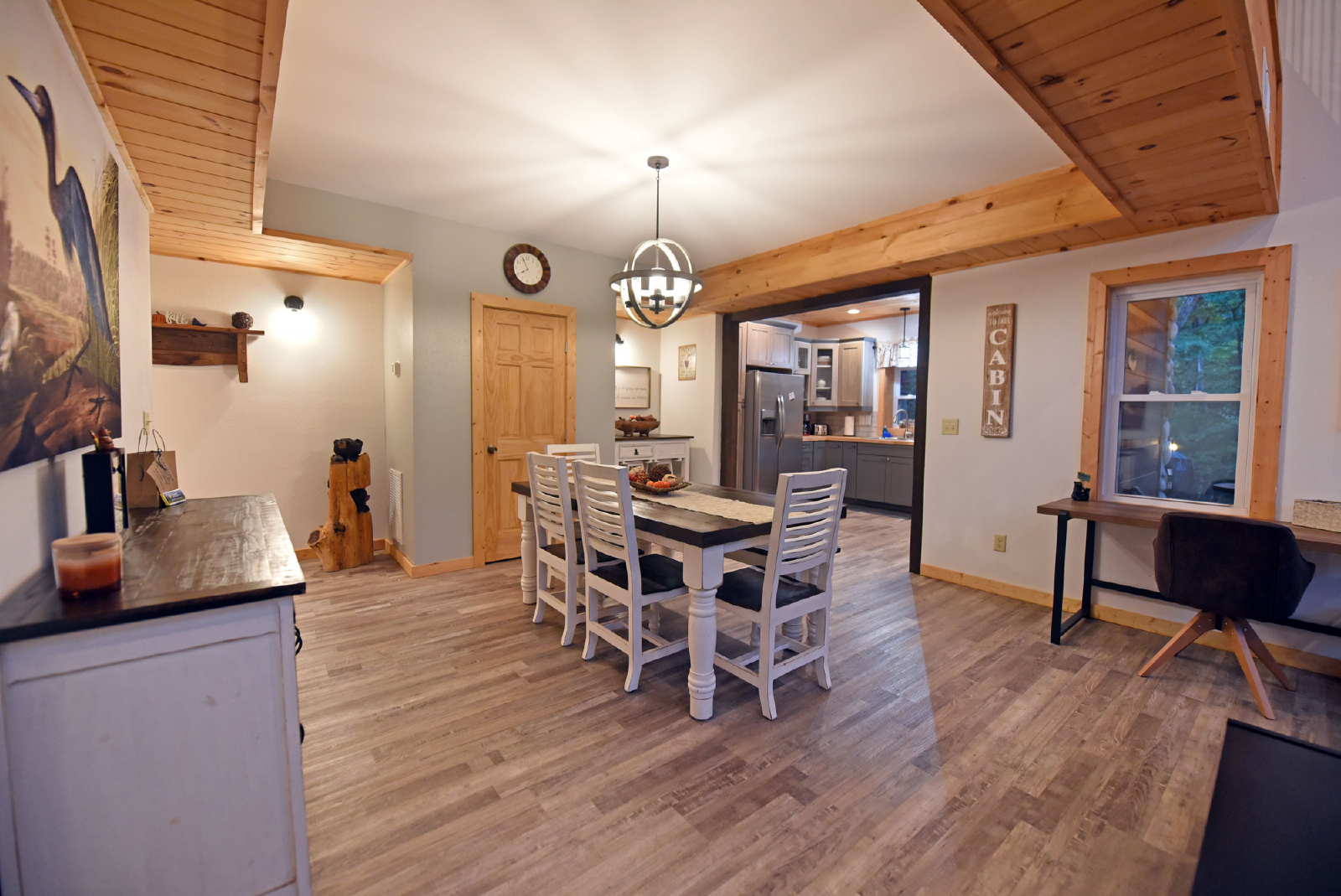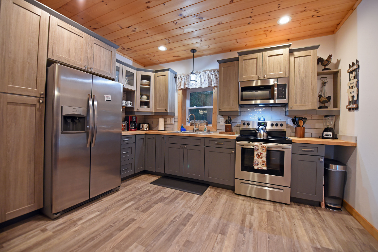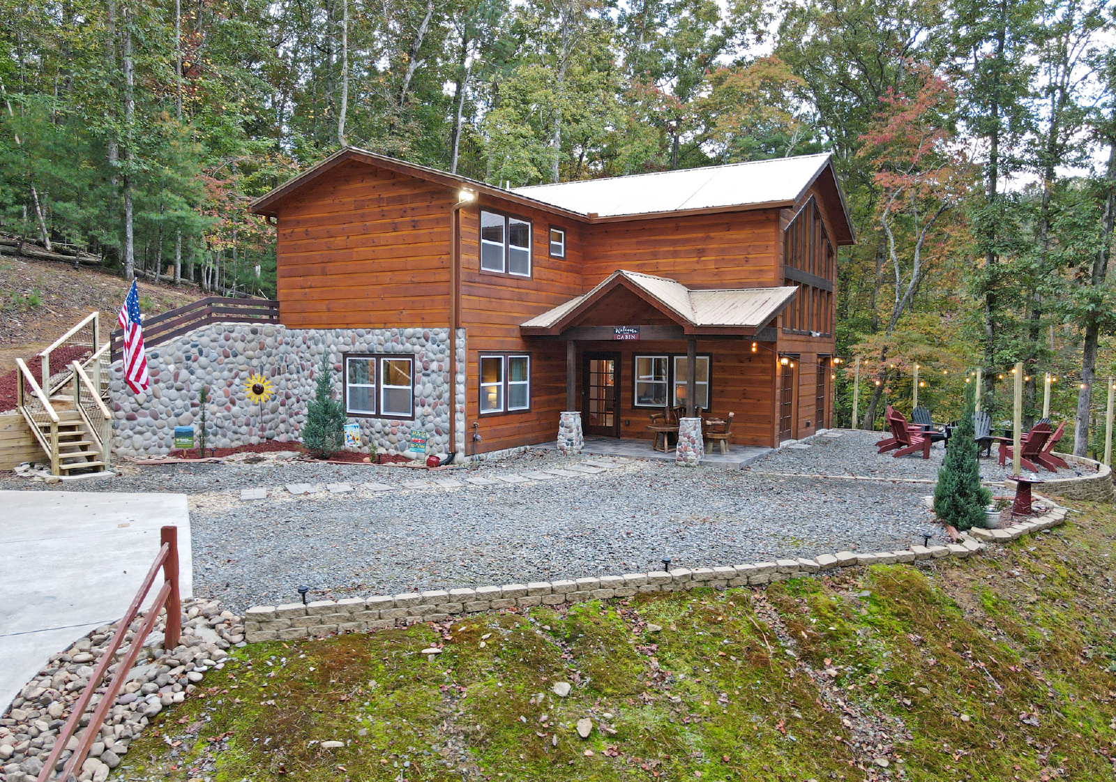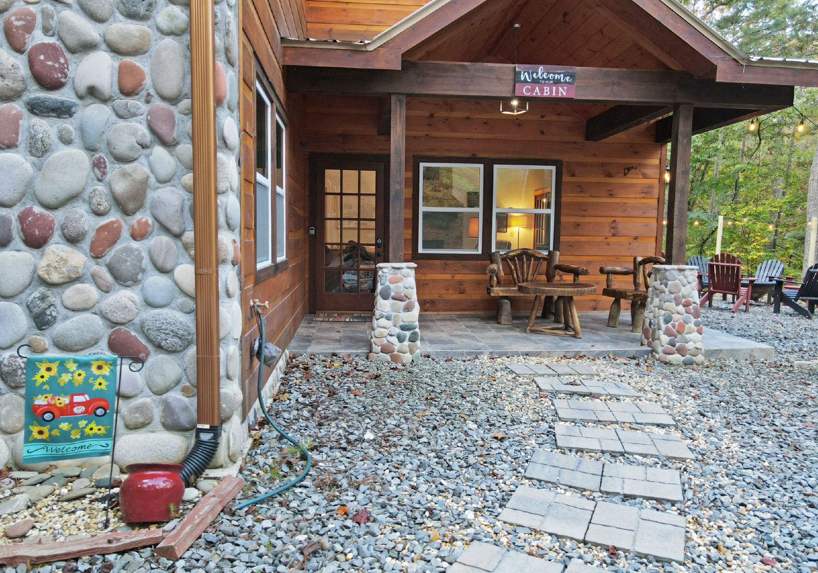 There is a small covered porch, with charcoal grill, dining table and additional seating outside the kitchen. The fire pit area is directly off the living room, has adirondack chairs and string lights to enjoy the beautiful mountain evenings!