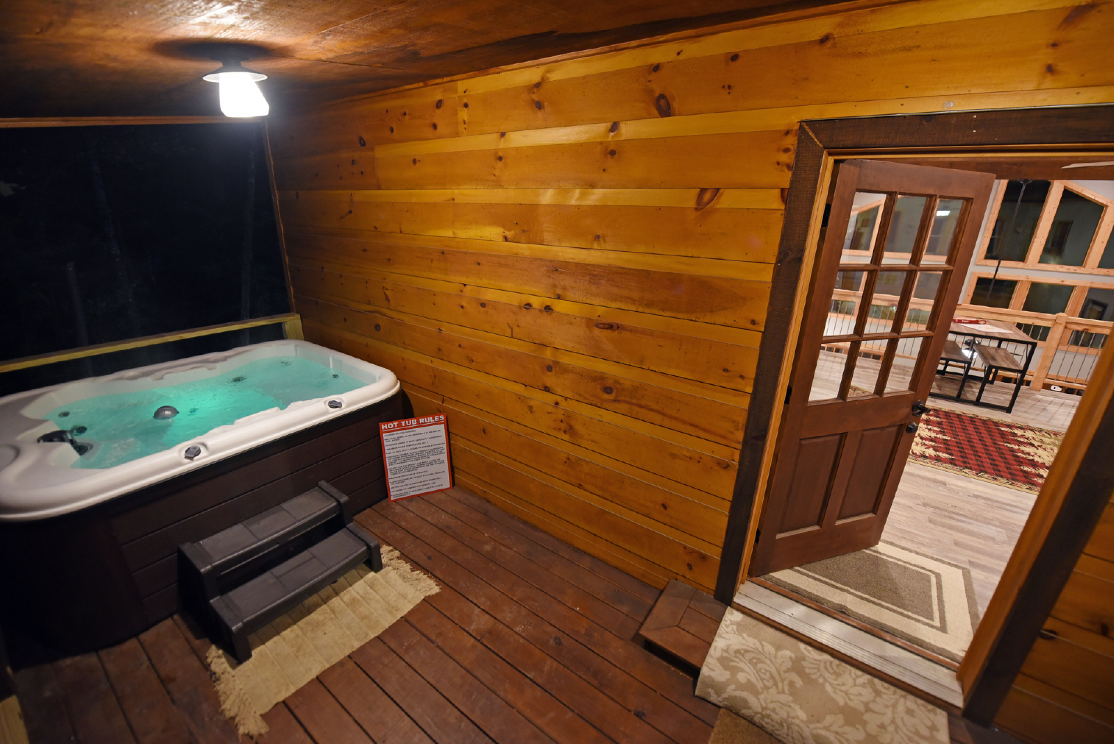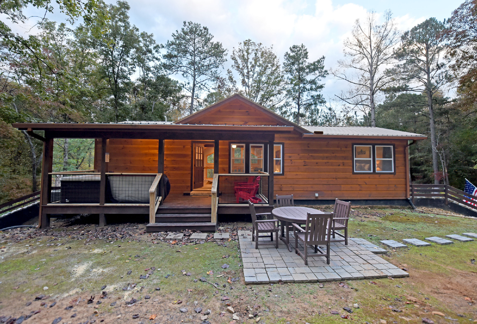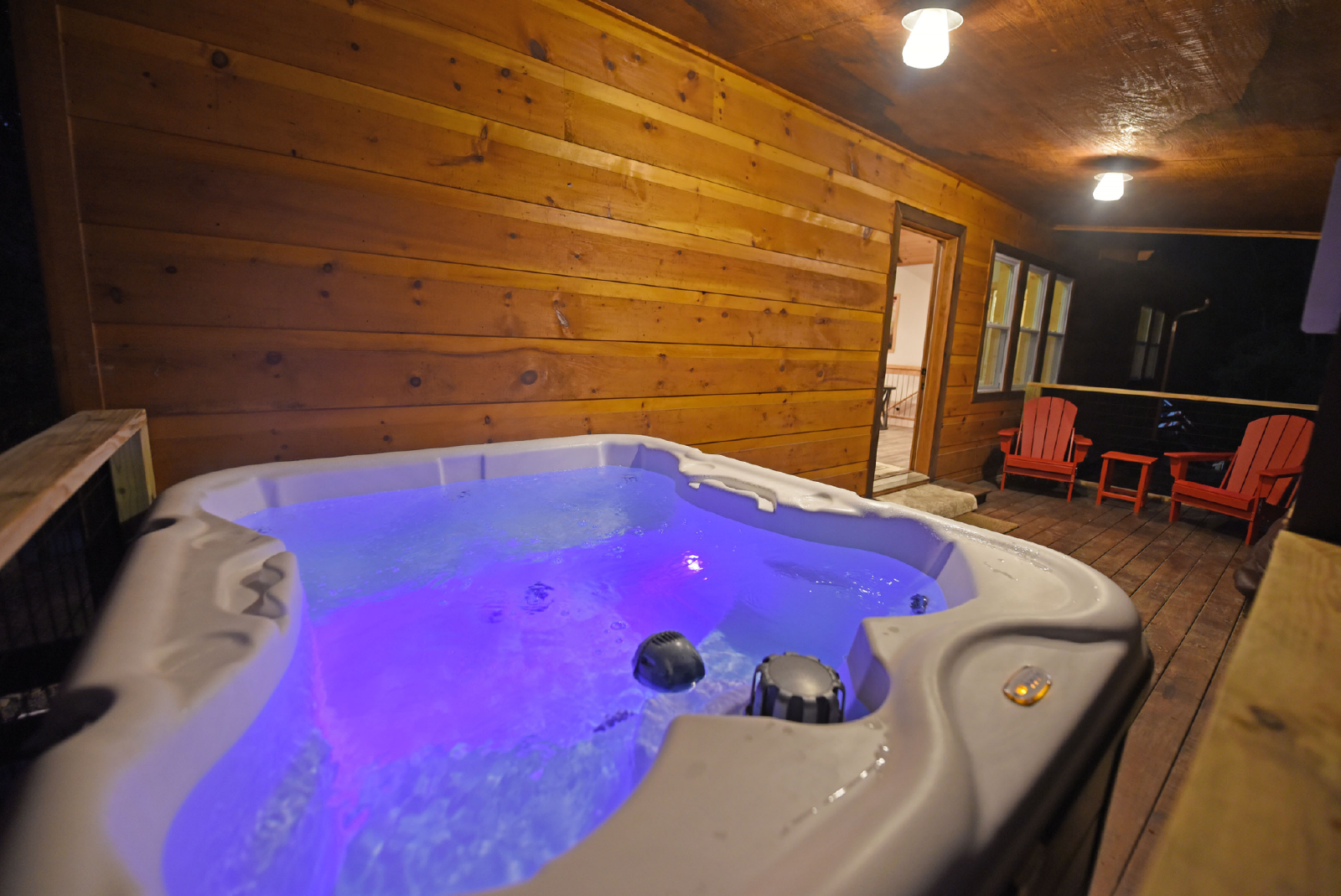 A great feature of this home is the covered porch, five person hot tub and outdoor dining table outside the loft area. There is also a small yard off the porch for children to play and explore the woods behind the home.
