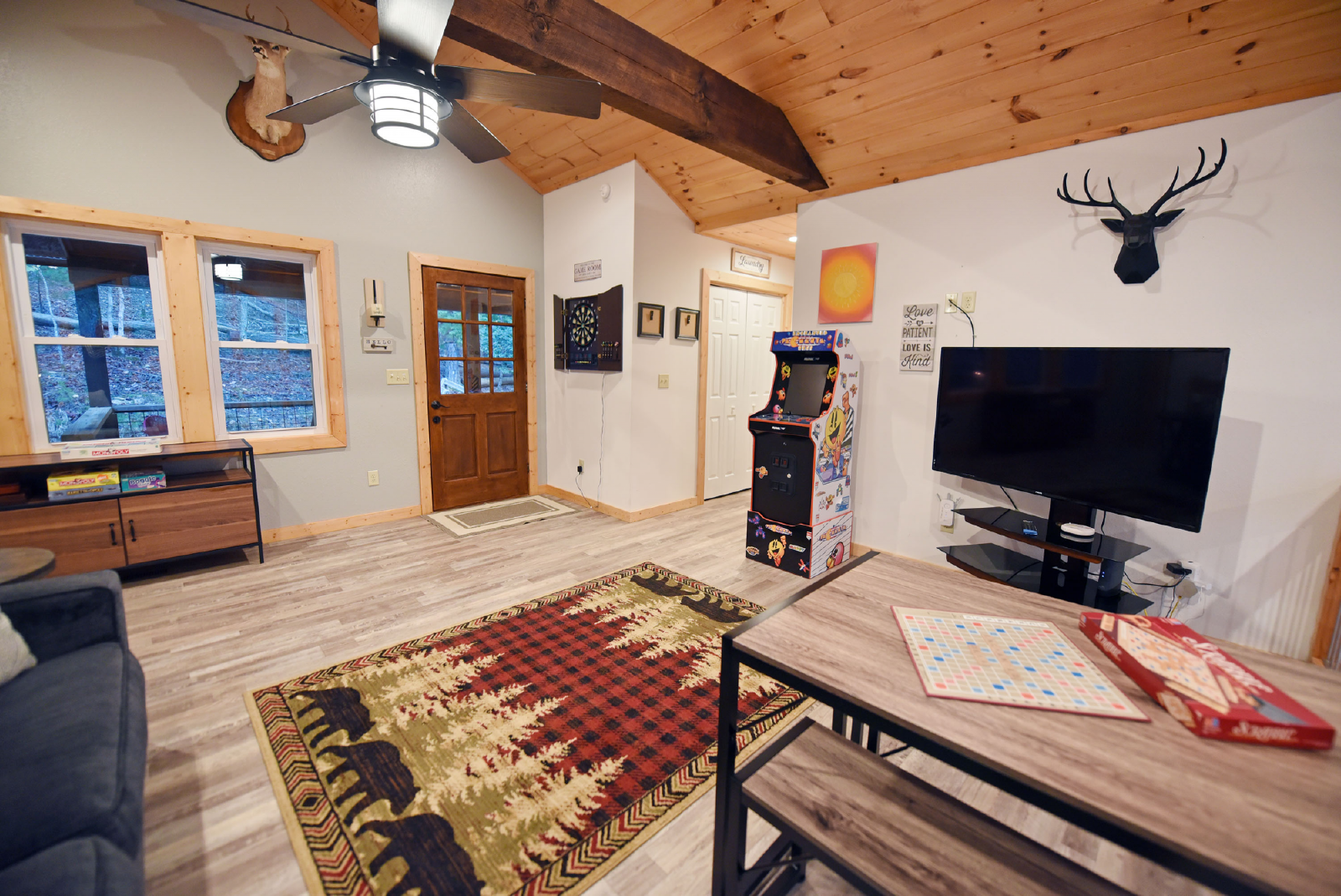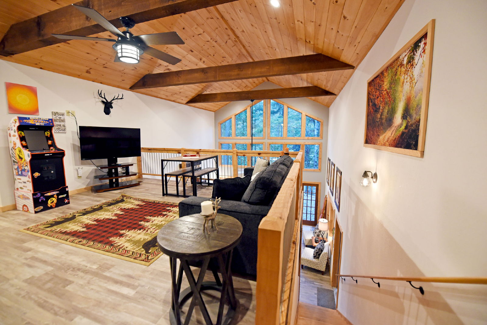 The upper level has an open loft with a couch, large screen smart TV, arcade game, and kids table for games, puzzles and drawing. The couch is a pull out sofa and can accommodate 2 additional people for a total of 8 if needed.