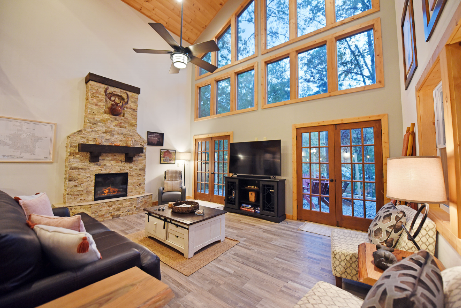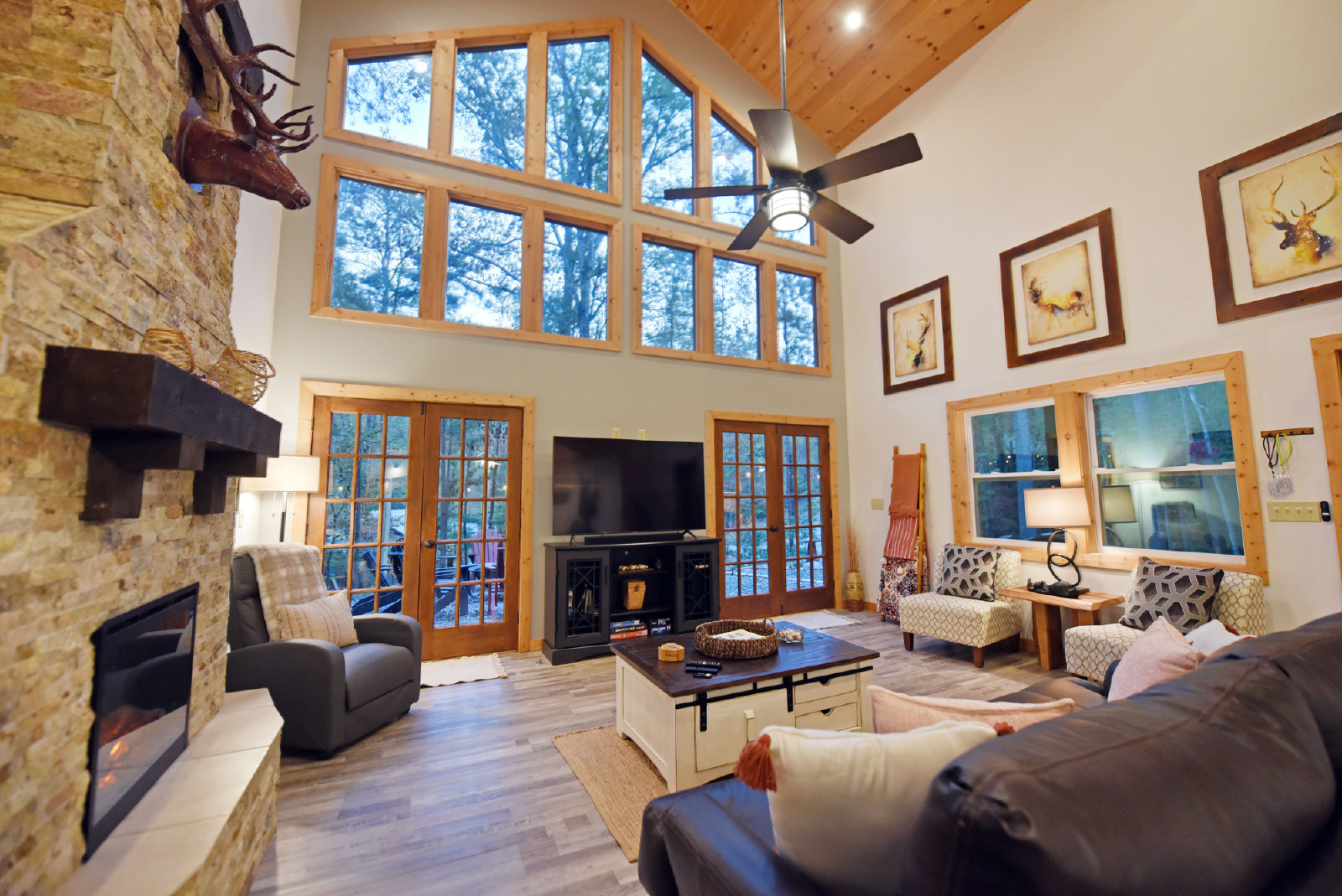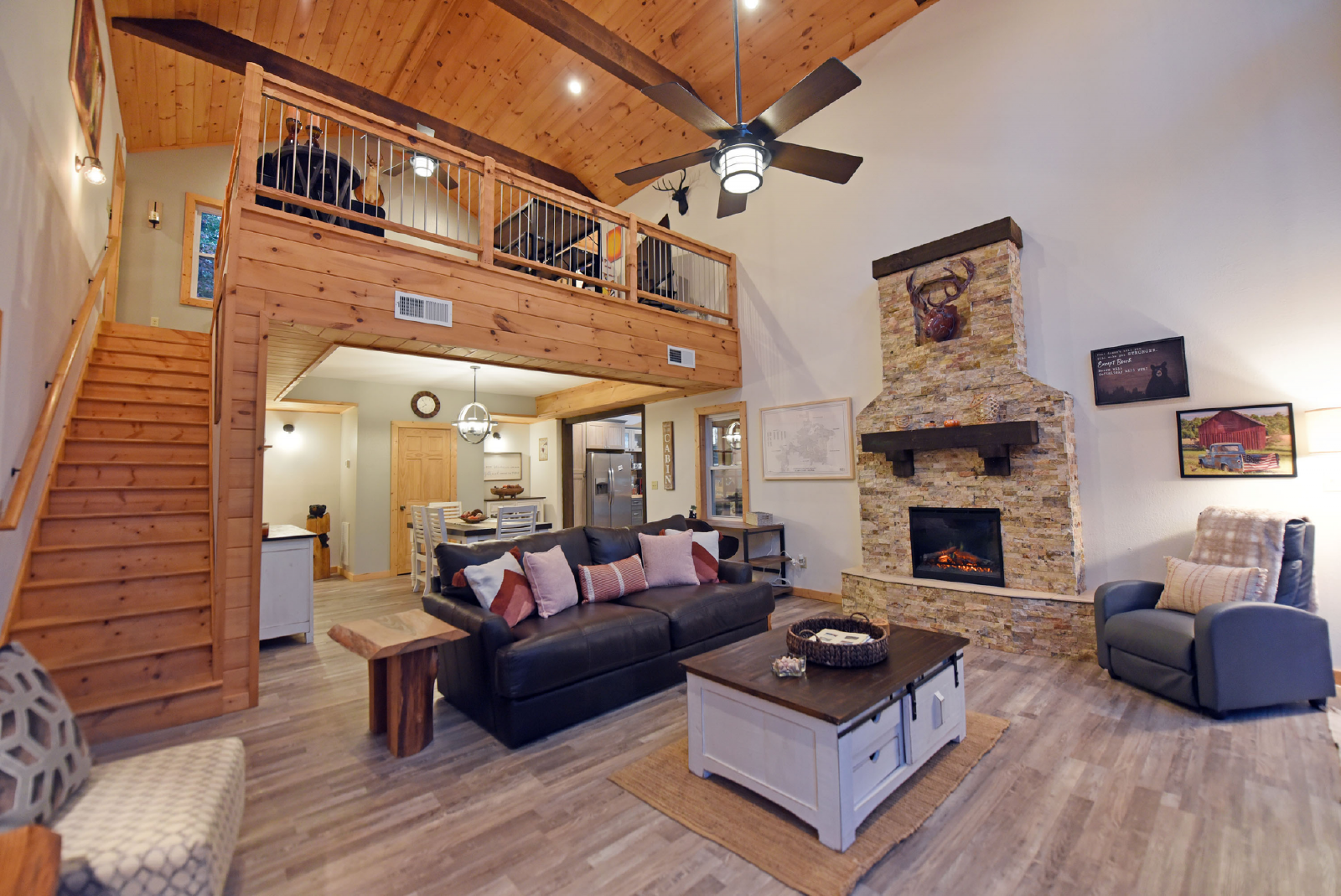 Enchanted Deer is a charming cabin and spacious for the entire family.. Access to the cabin is from the bottom floor into the living room featuring a stone electric fireplace, large flat smart TV, comfortable seating and multiple windows to bring in the natural light.