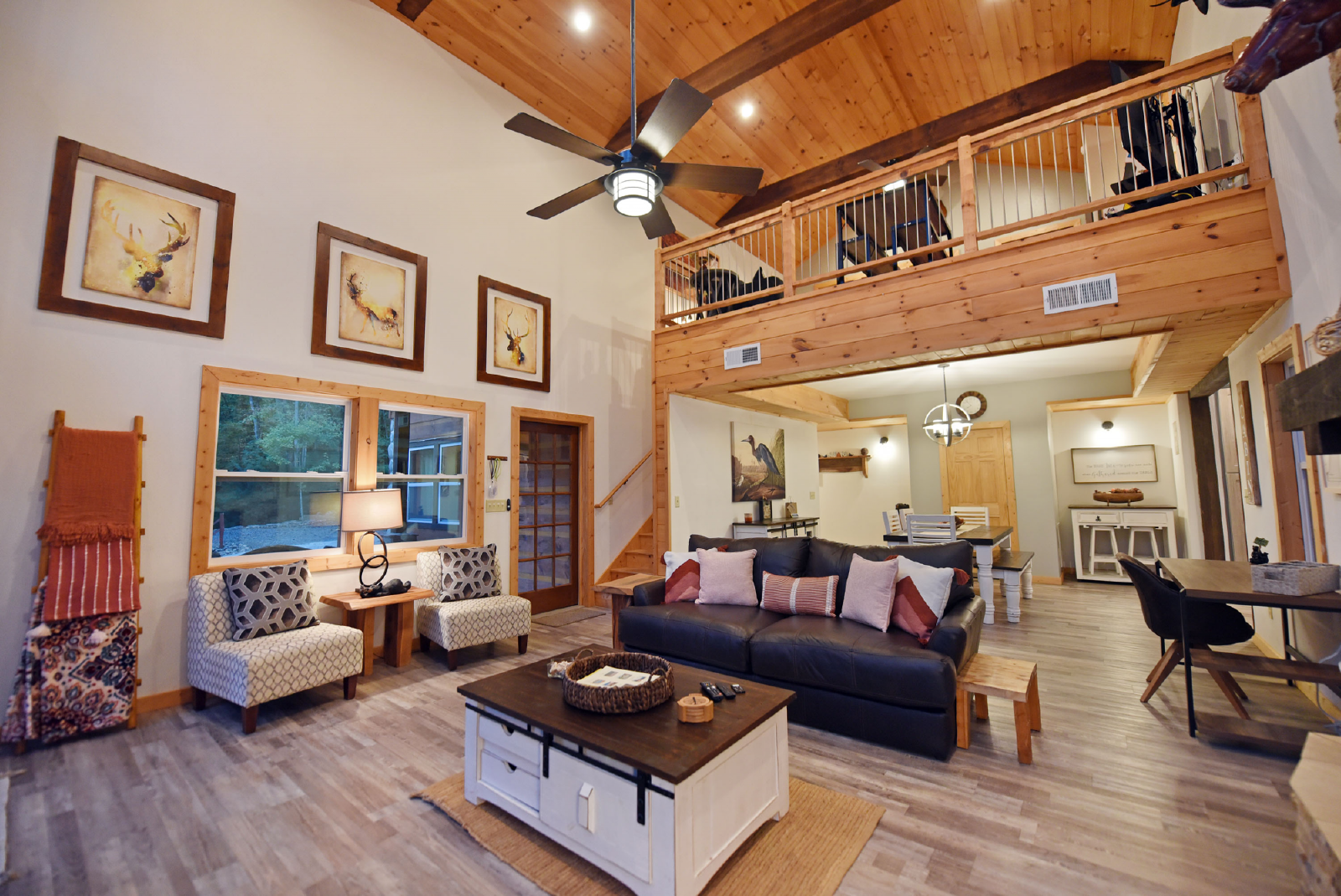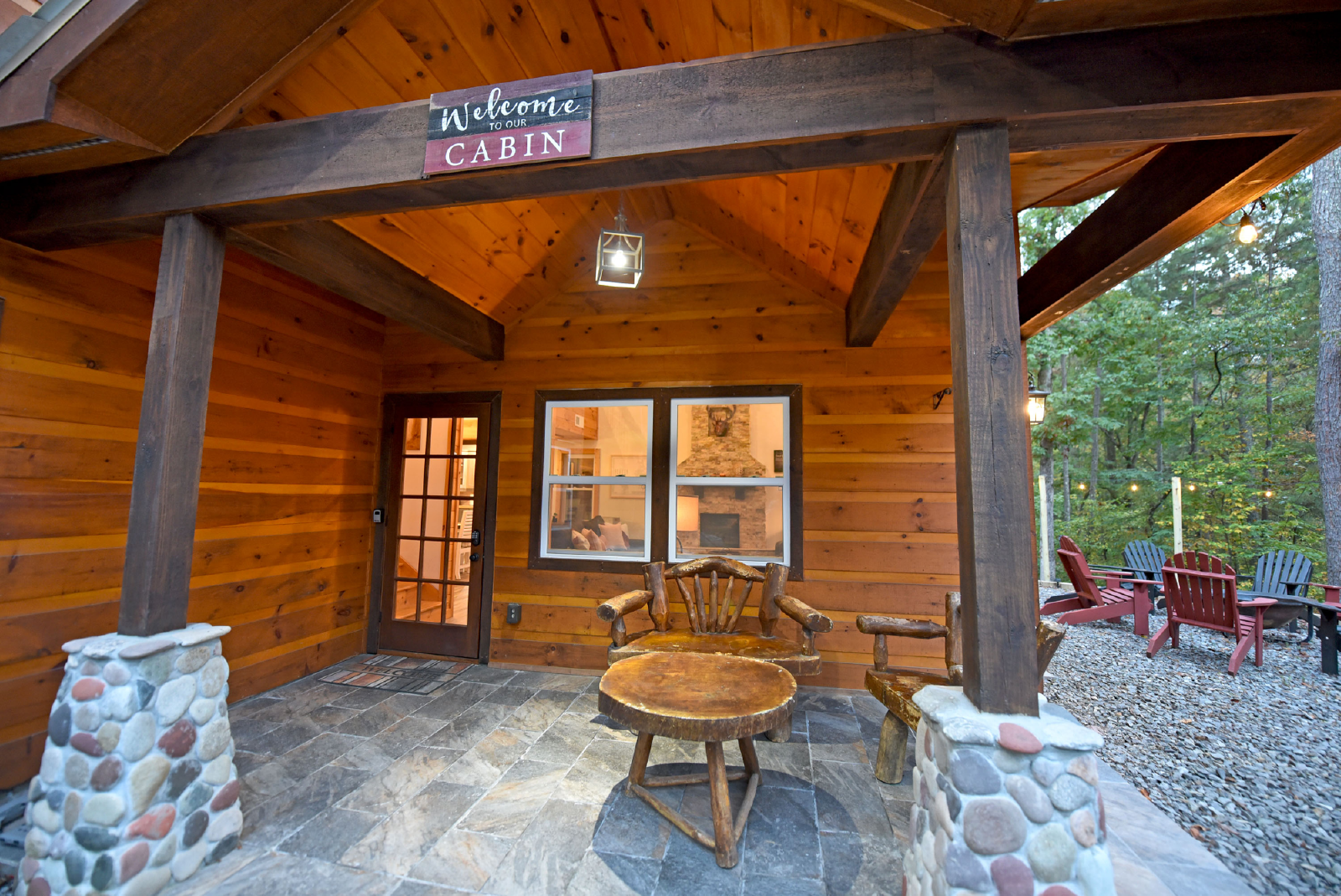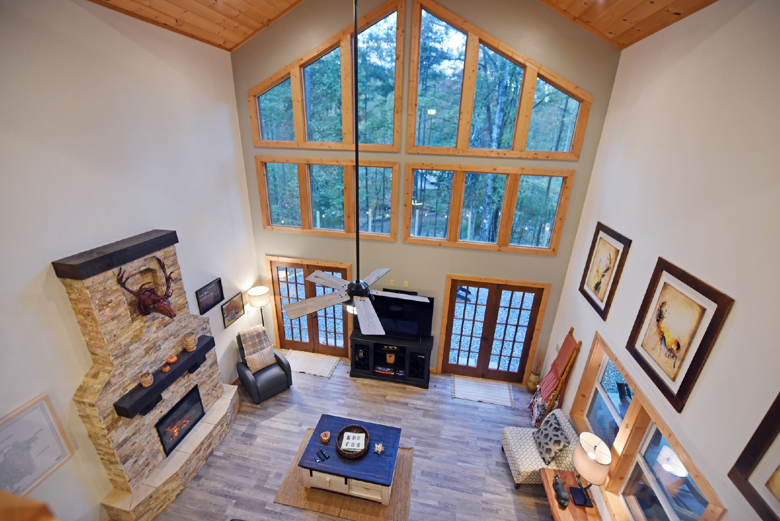 Enchanted Deer is a charming cabin and spacious for the entire family.. Access to the cabin is from the bottom floor into the living room featuring a stone electric fireplace, large flat smart TV, comfortable seating and multiple windows to bring in the natural light.