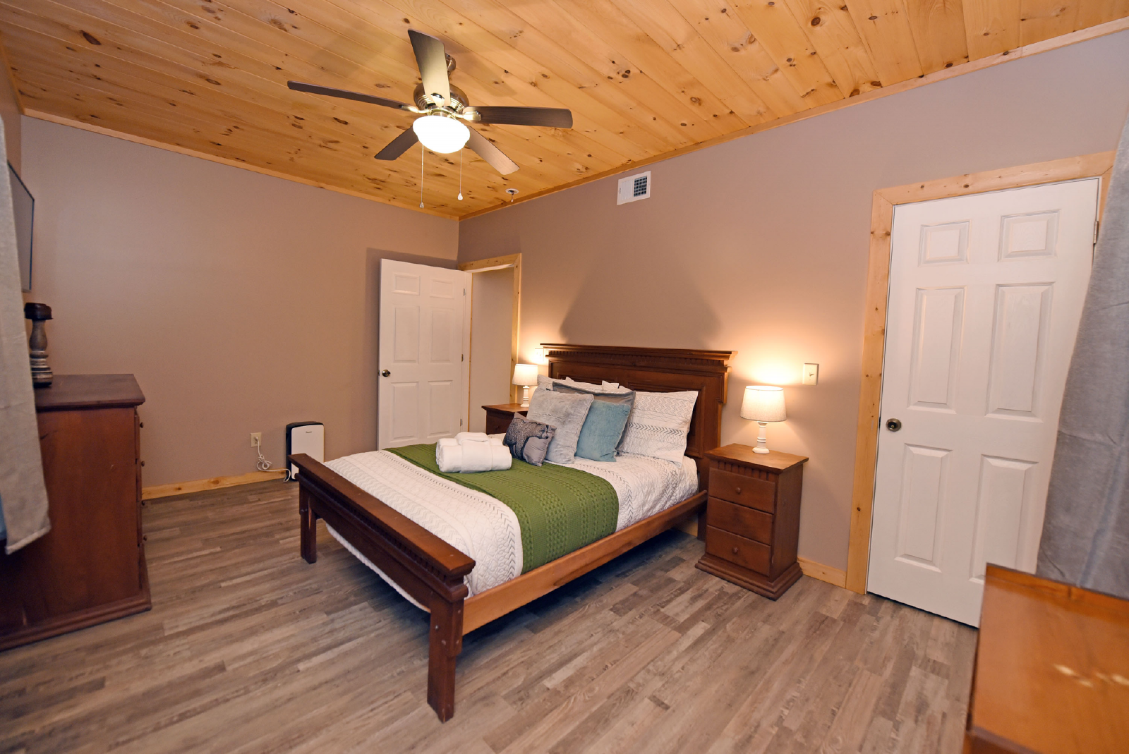 The remaining queen bedroom is to your right as you go up the stairs, at the end of the hallway. There is a full size bathroom just outside the bedroom door.