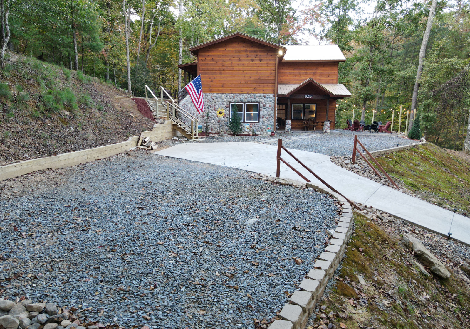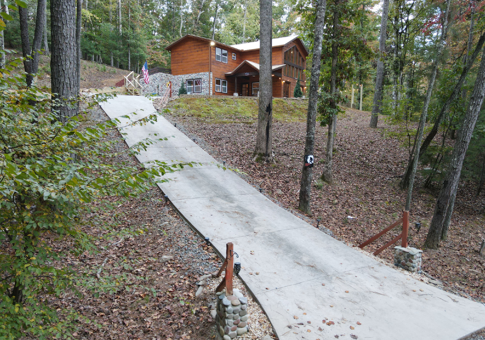 Your drive to the cabin is fully paved roads until you turn onto the short access gravel road. The driveway is concrete and it has plenty of parking for three vehicles.