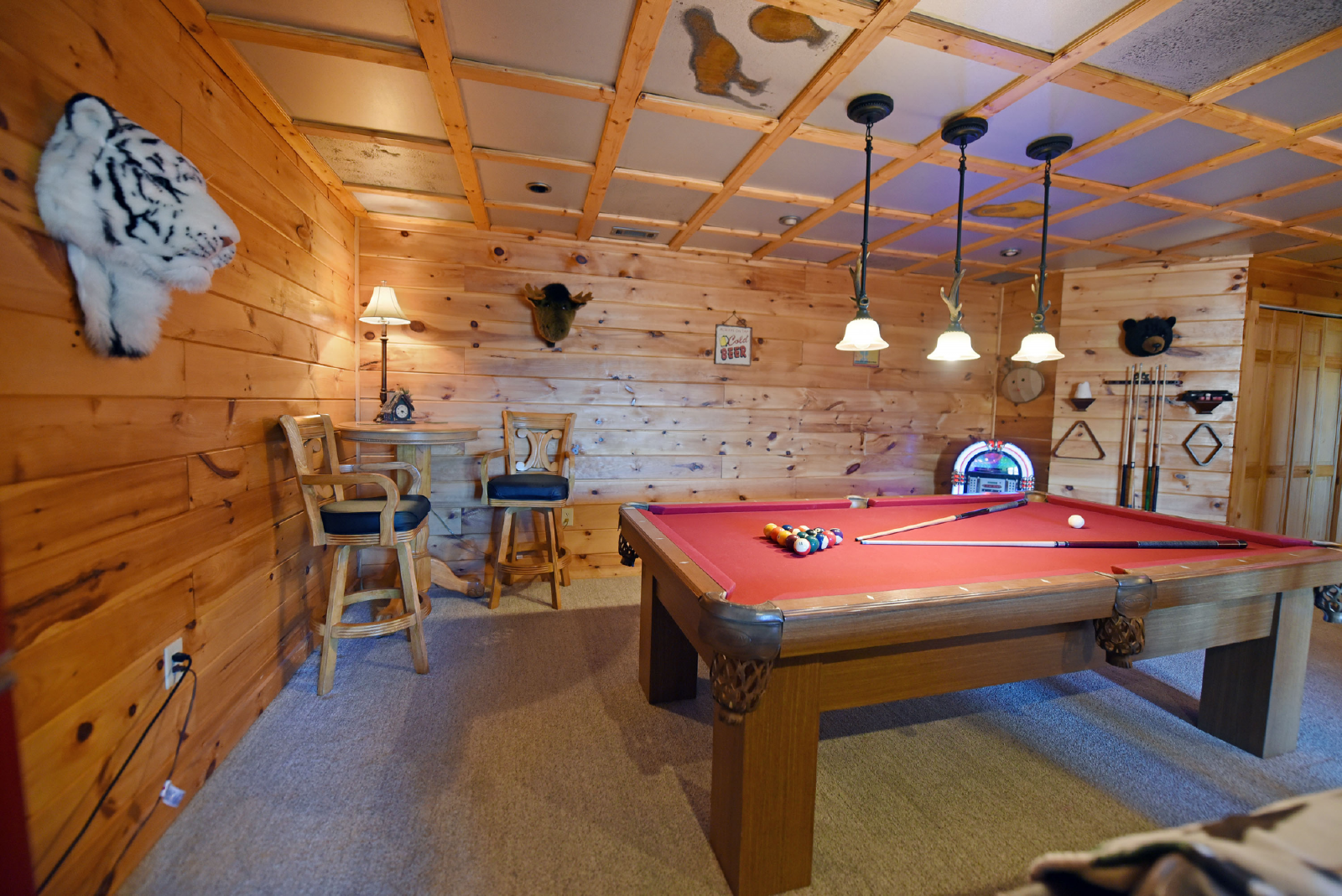The downstairs level is accessible from the kitchen. You will find an additional living area, 43” smart TV with wireless speaker, gas fireplace, additional refrigerator, billiards table, darts and board games for fun entertainment! The slot machines are for decoration only.