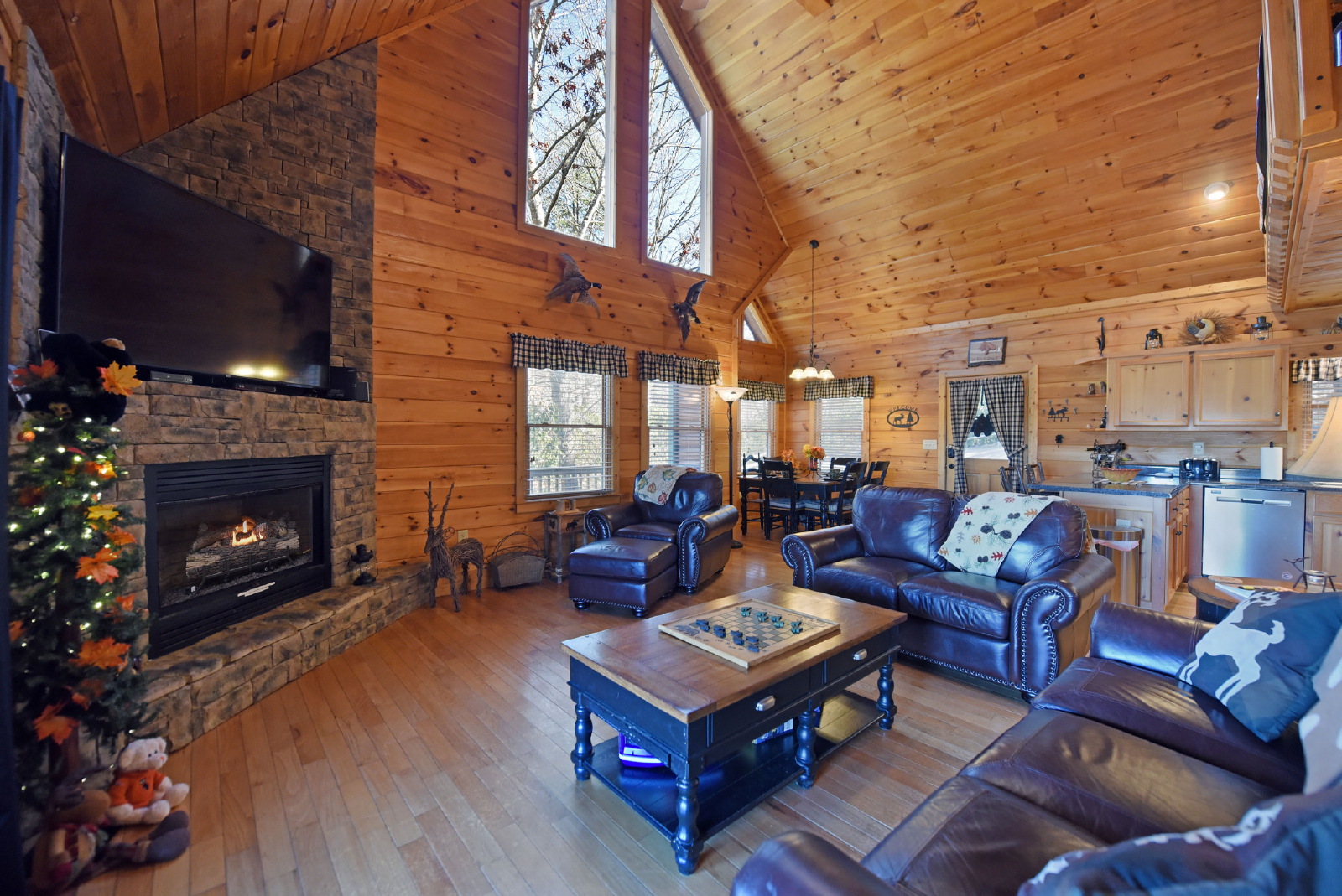 You will enter the property featuring vaulted ceilings, large stone fireplace and open concept featuring the living room, dining room and kitchen. The living consists of a very cozy leather sofa, loveseat and chair, and a DVD equipped 70” smart TV.